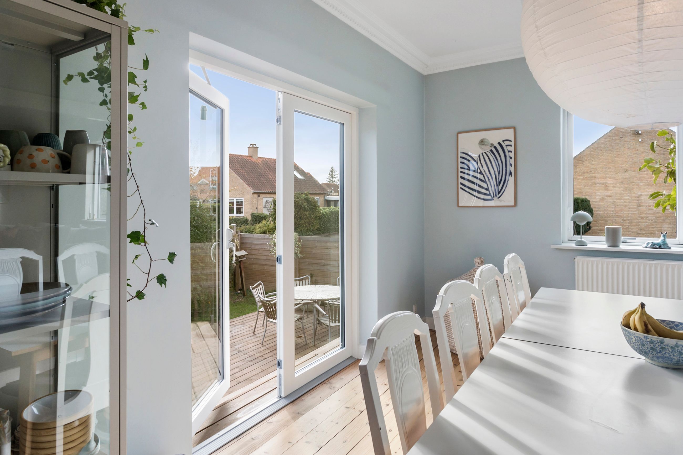Terrassen er jeres sommerstue: plads til grill, krukker og langbordsmiddage, mens børnene tumler på græsset. Haven er overskuelig og afskærmet – nem at holde, nem at nyde – og giver lige præcis den mængde udeliv, der passer til en travl hverdag.