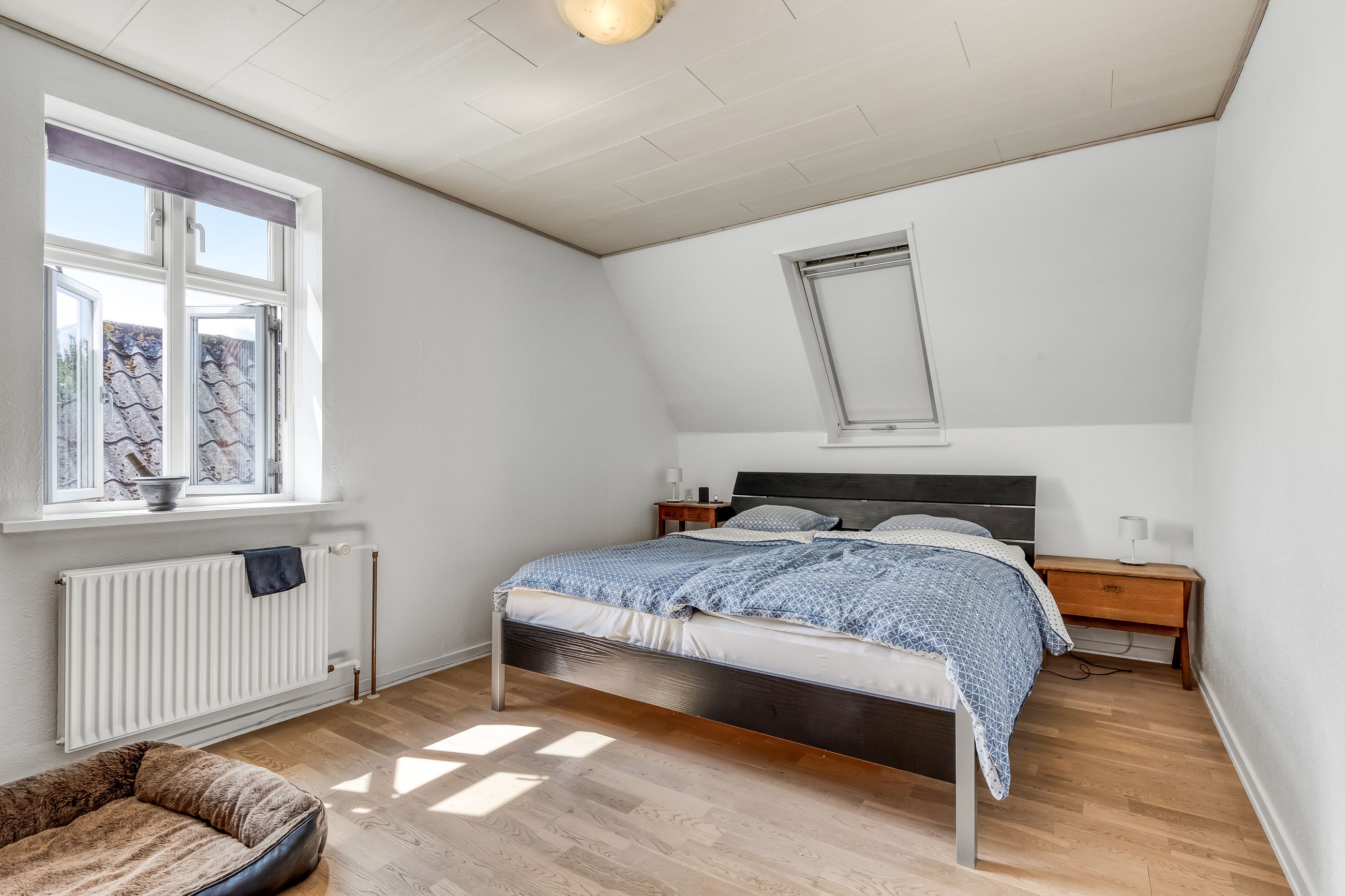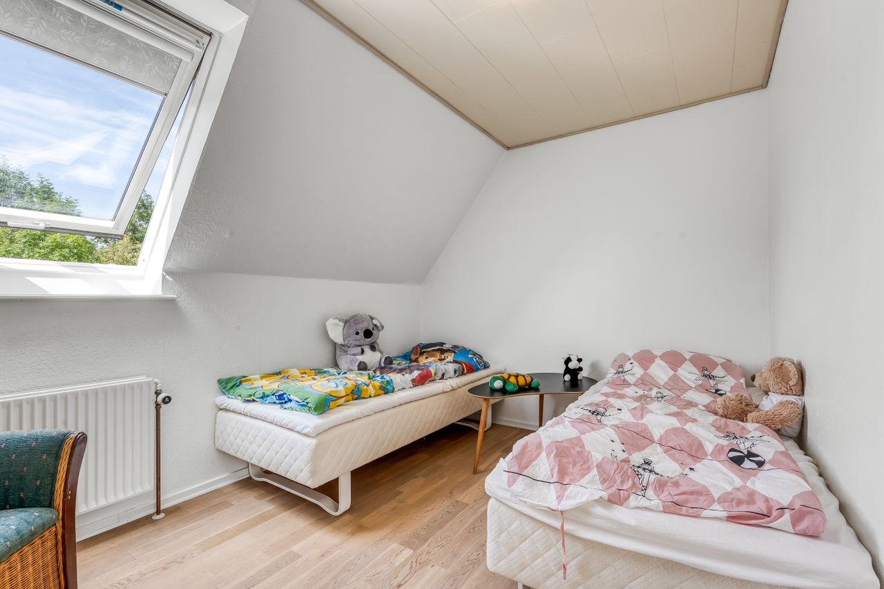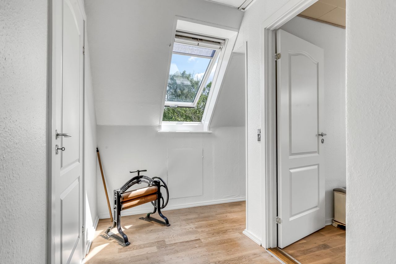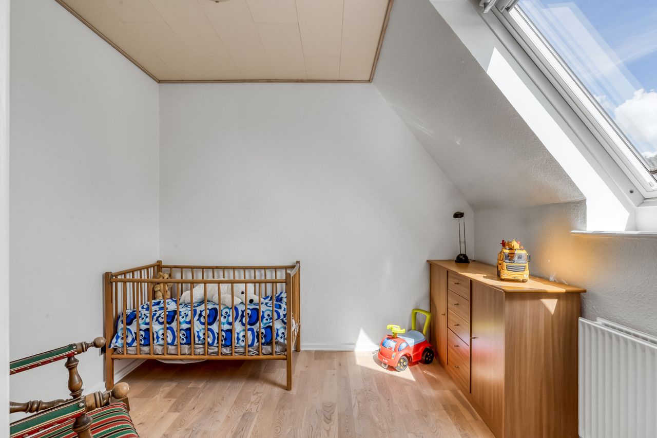 På førstesalen finder I 3 regulære værelser og et repos, perfekt indrettet til både børn, voksne eller den obligatoriske hjemmearbejdsplads (eller walk-in, hvis I er til det). Heroppe er der en hyggelig stemning, pæne gulve og en fin udsigt over nabolagets rolige omgivelser.