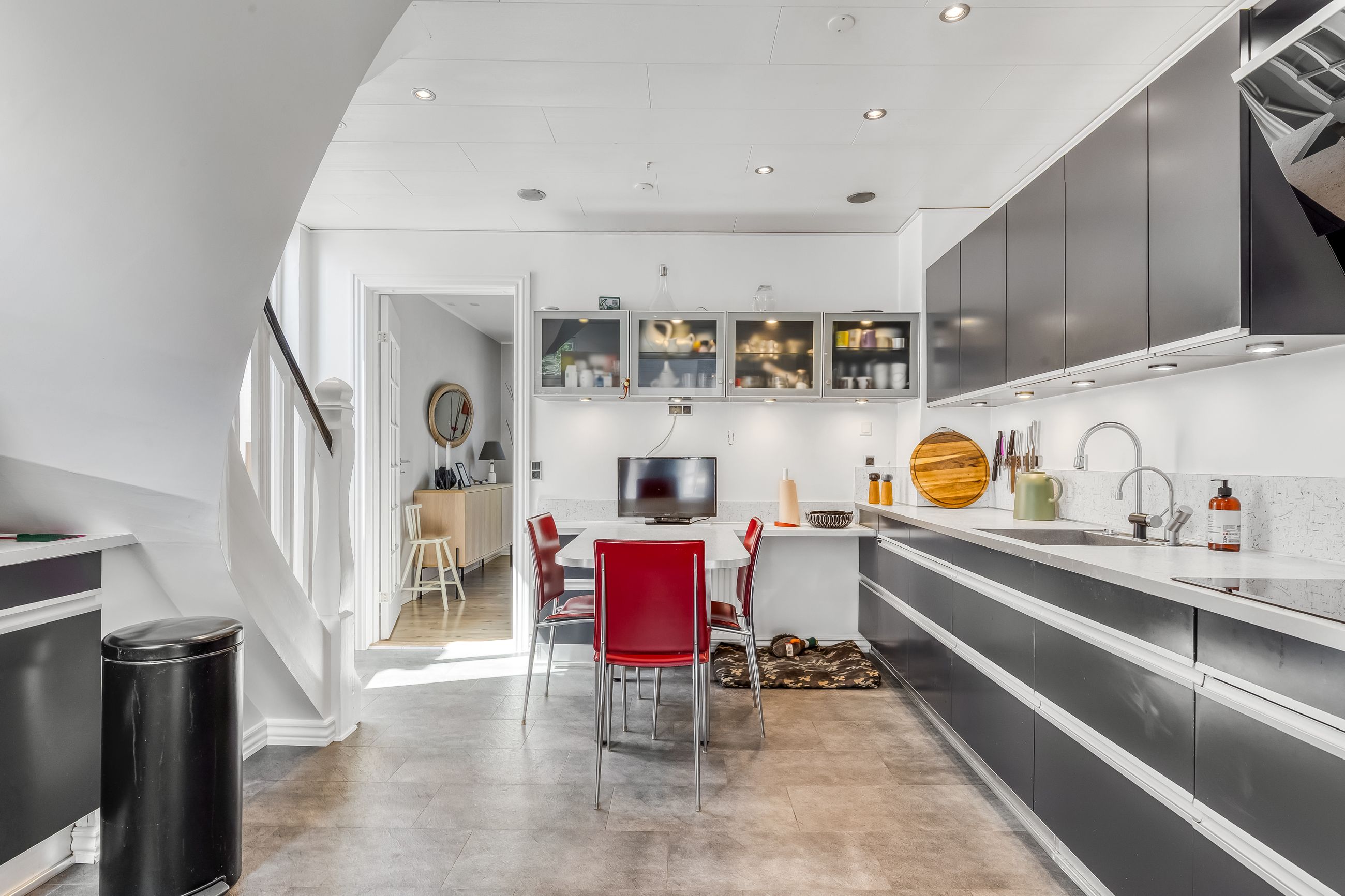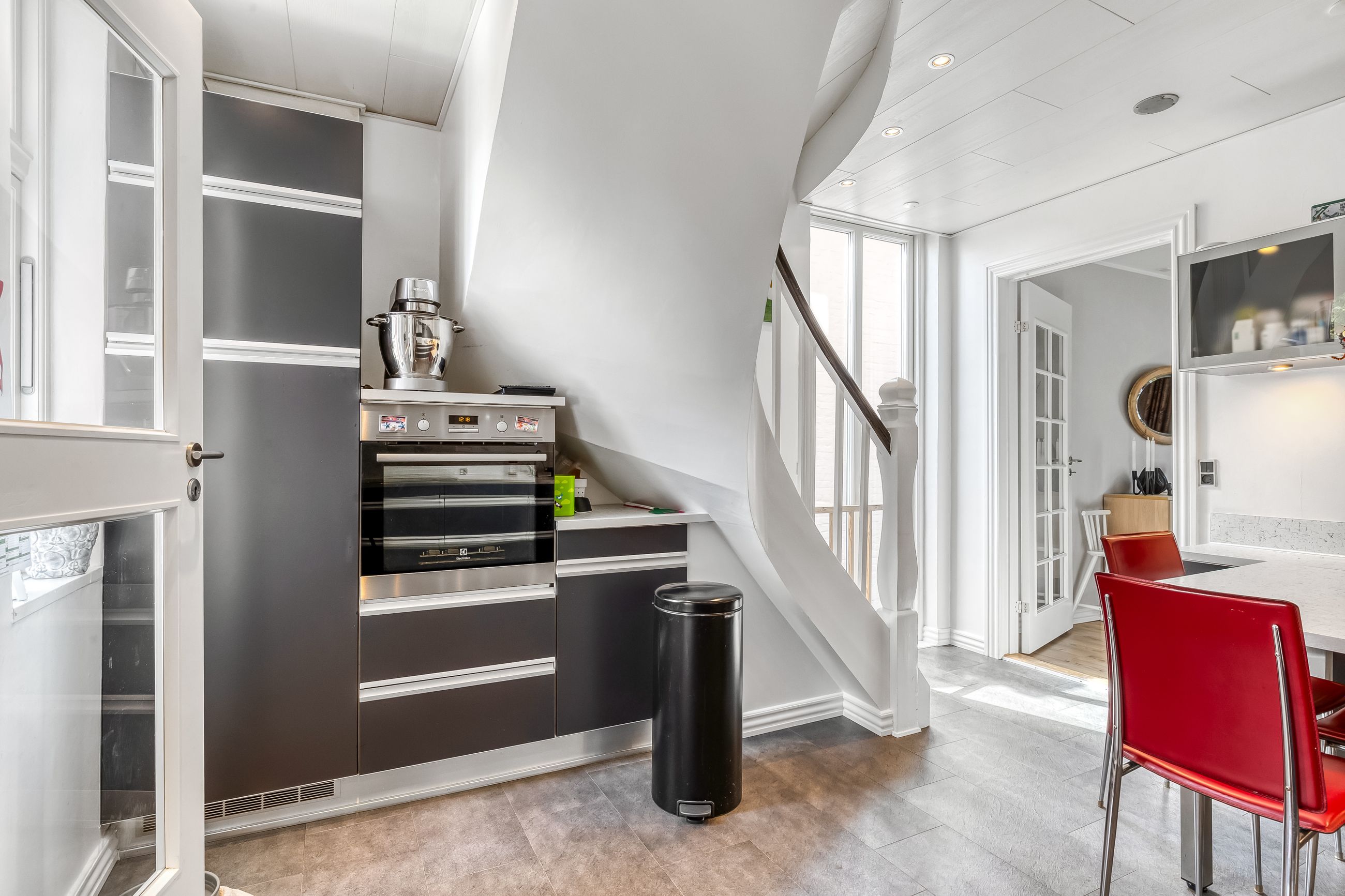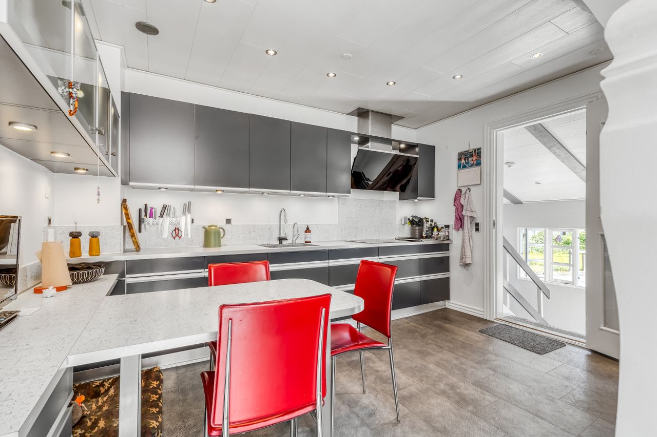 I stueplan bliver I mødt af et dejligt, moderne køkken med en lille spiseplads, hvor morgenkaffen nemt kan nydes. I åben forbindelse heraf ligger både spisestue og tv-stue som et rummeligt og lyst opholdsareal med plads til lektier, fredagsslik og søndagsgæster. Gæstetoilettet er flot moderniseret og ligger praktisk placeret i stueplan.