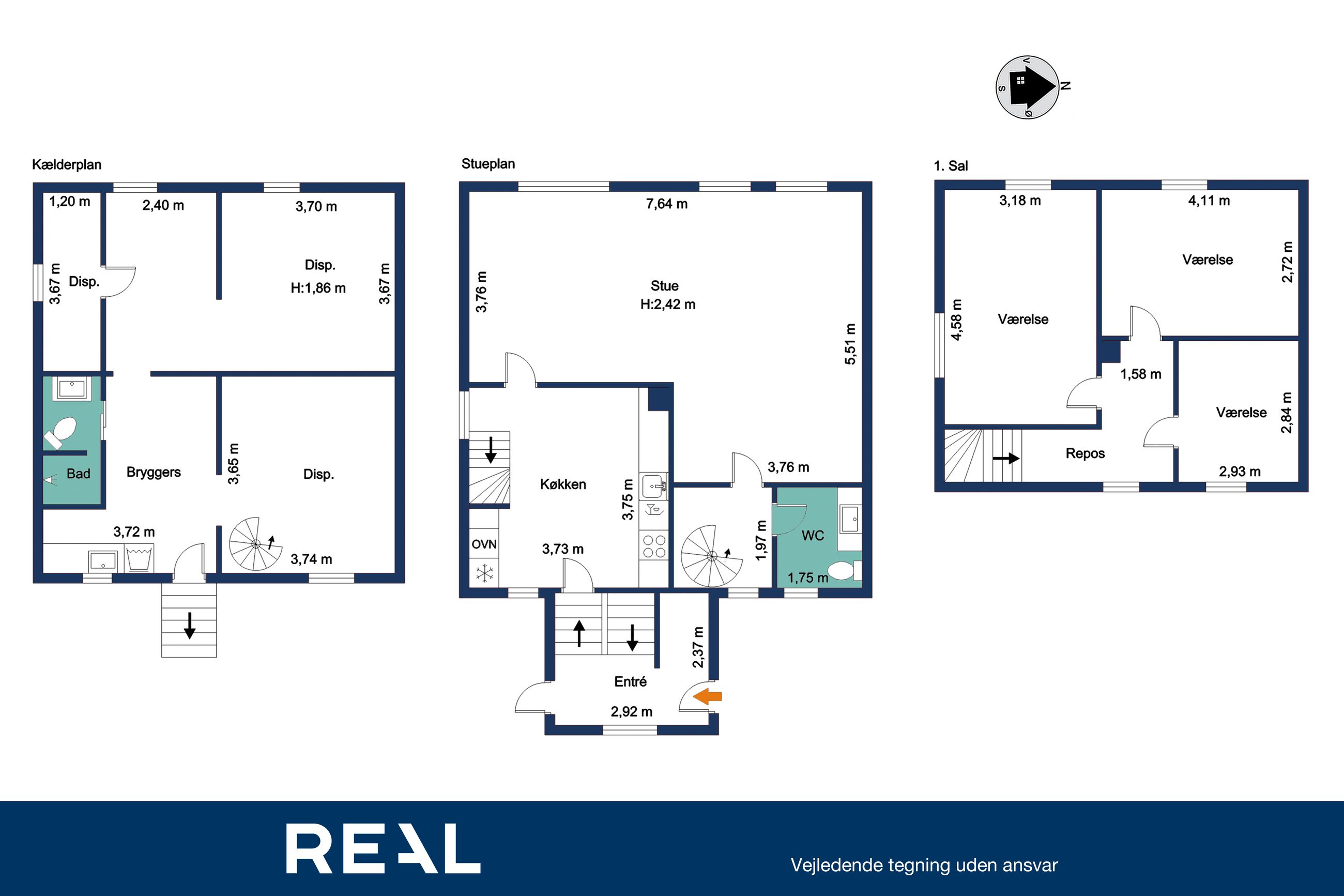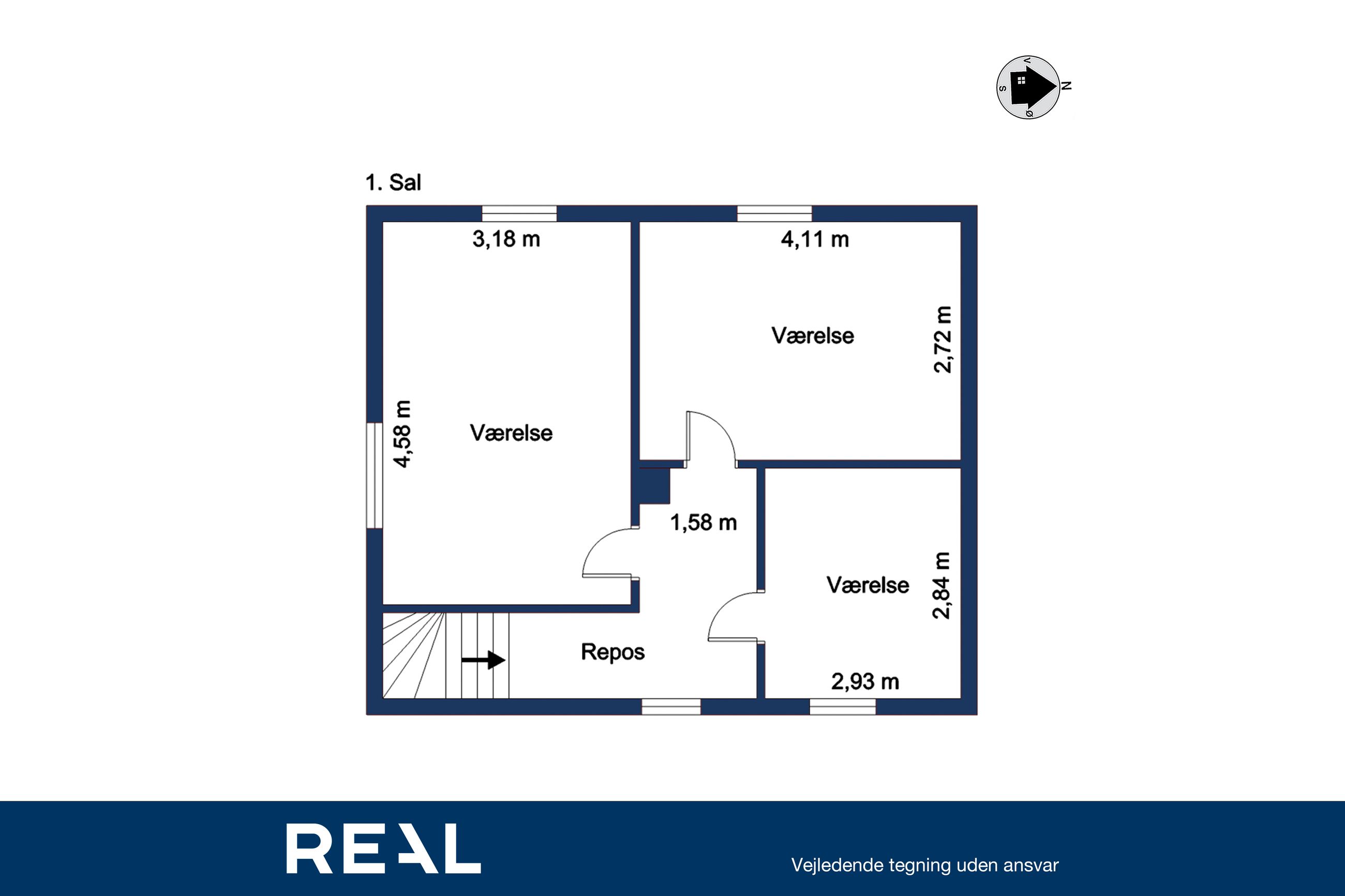 1. sal, 3 gode værelser