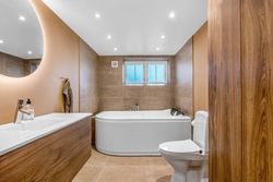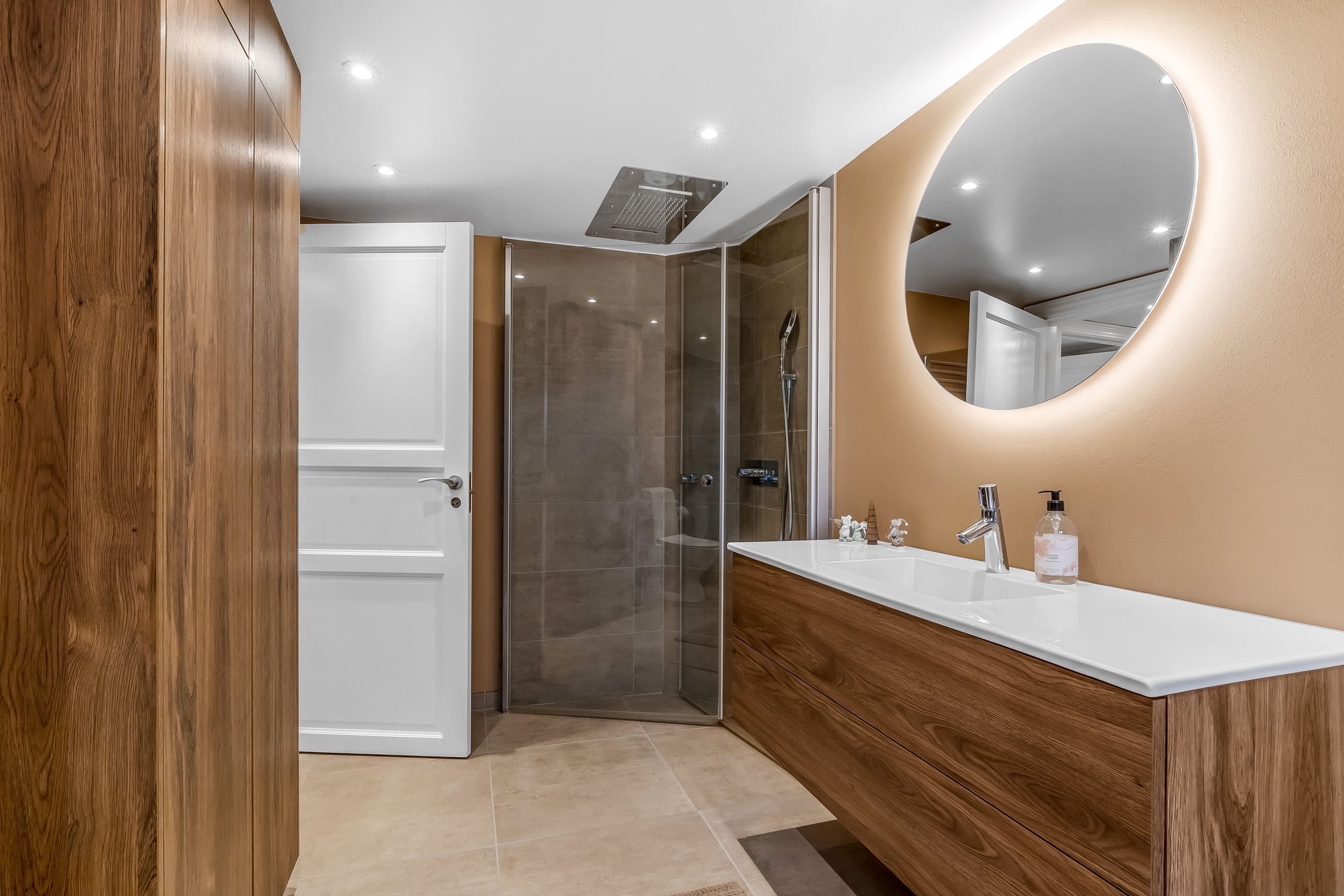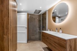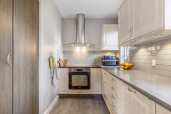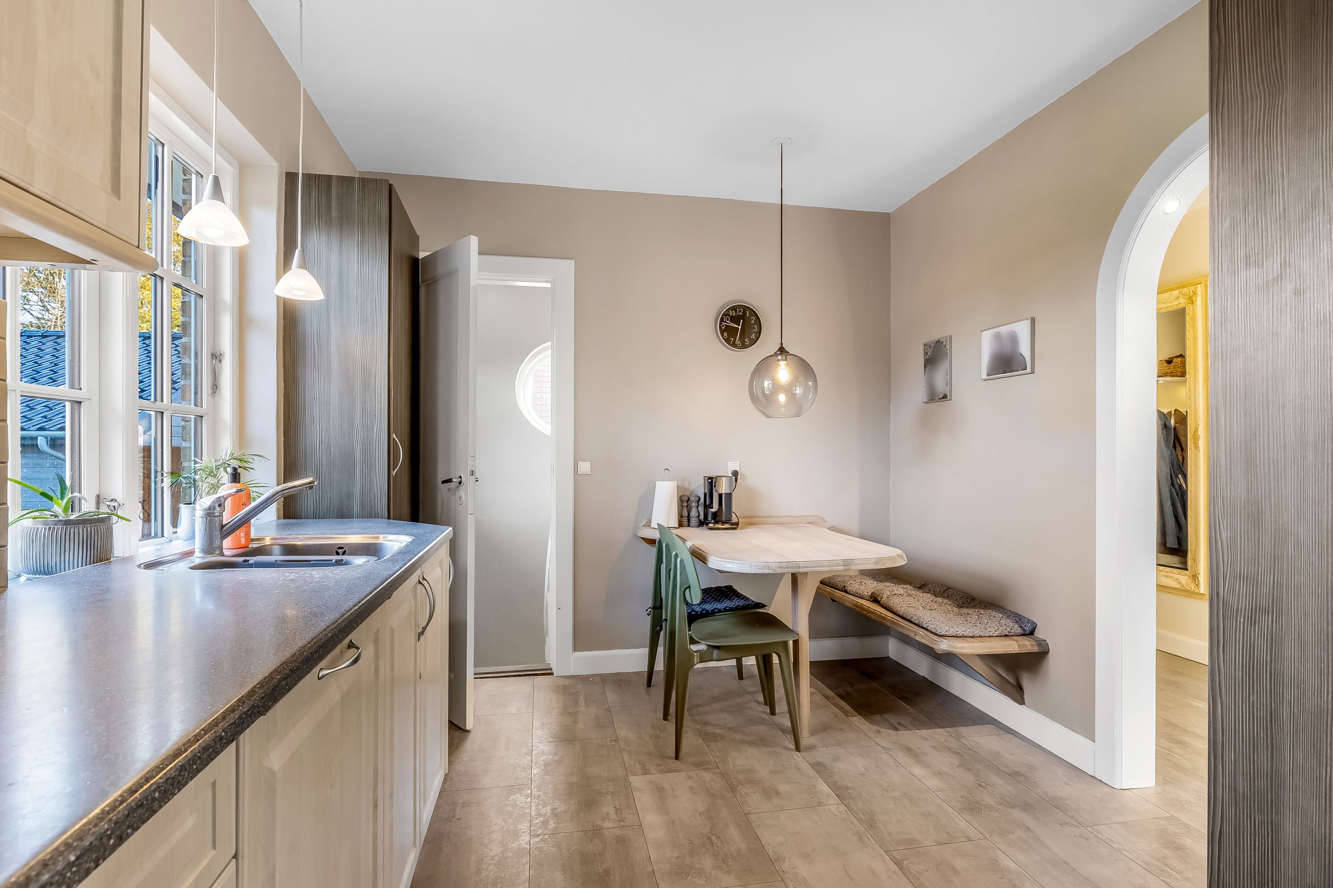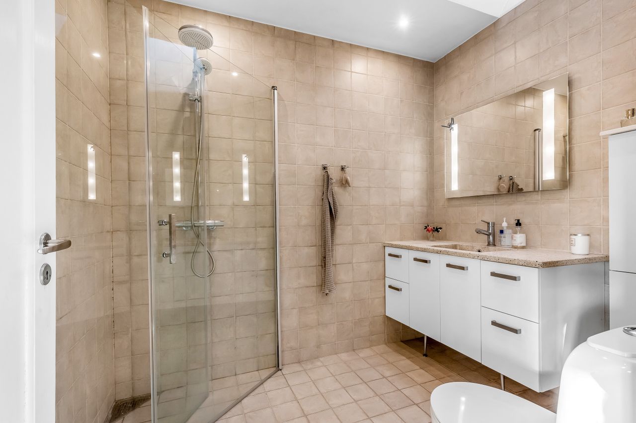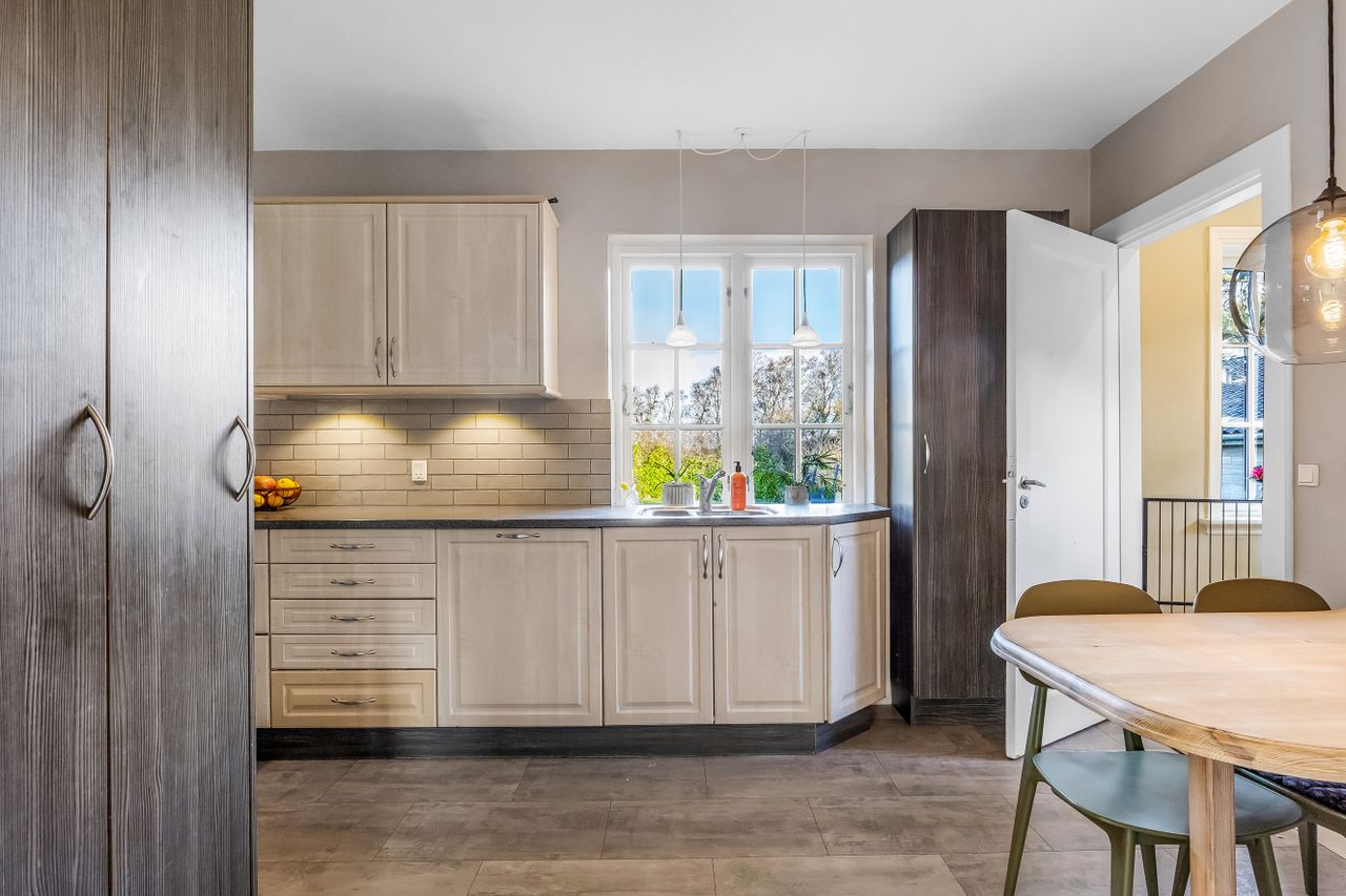 Et velindrettet køkken med god bord- og skabsplads, spiseplads og et roligt, tidløst materialevalg. Et pænt badeværelse med brus og god plads omkring jer, og et ekstra lækkert i kælderen med bl.a. spa og flotte fliser m.v.