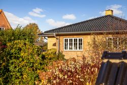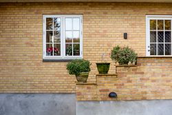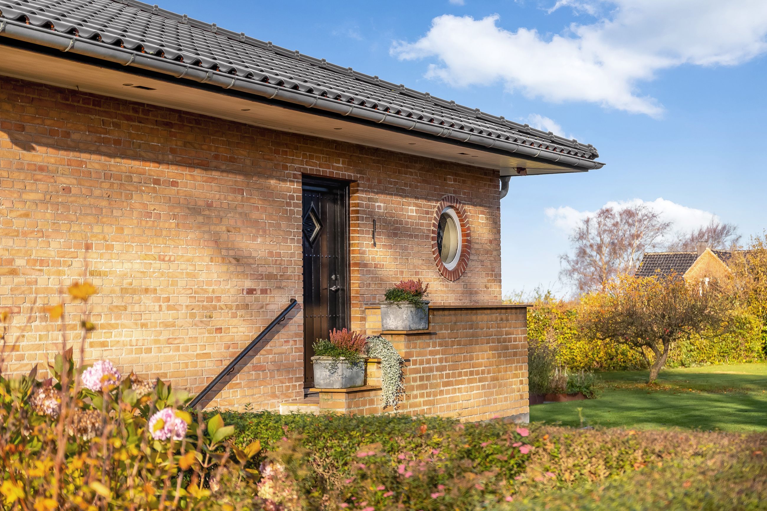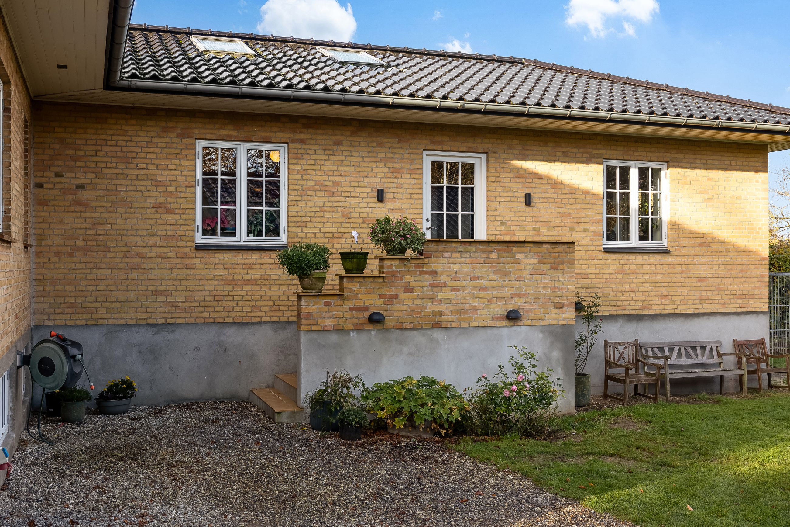 Selve huset er en klassisk villa fra 1943, bygget i en tid, hvor man tog sig god tid til detaljerne. Man fornemmer det allerede udefra: De smukke søjler - de smukke gule mursten, det solide tegltag og proportionerne i facaden. Intet skriger – alt hænger harmonisk sammen. Isoleret garage og carport.