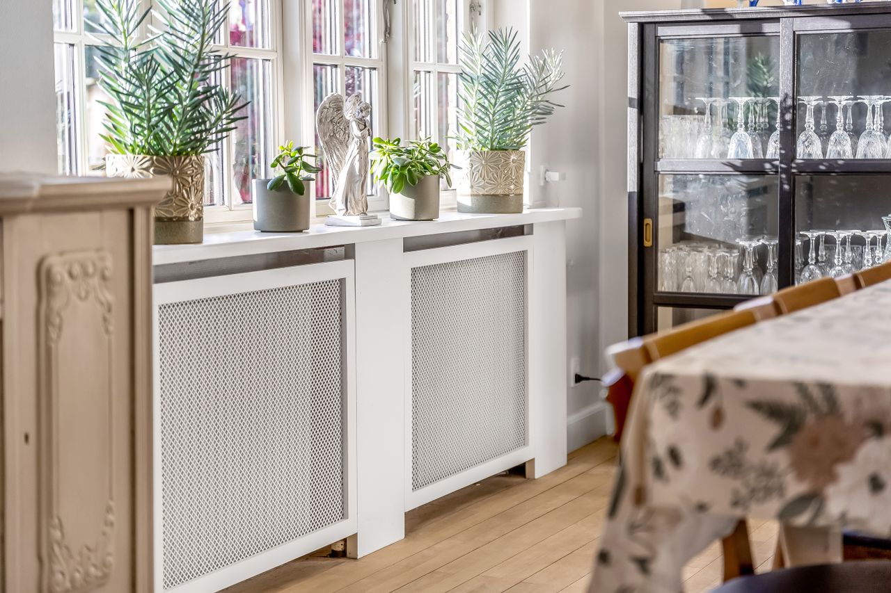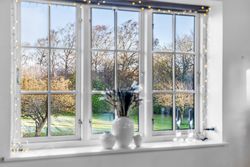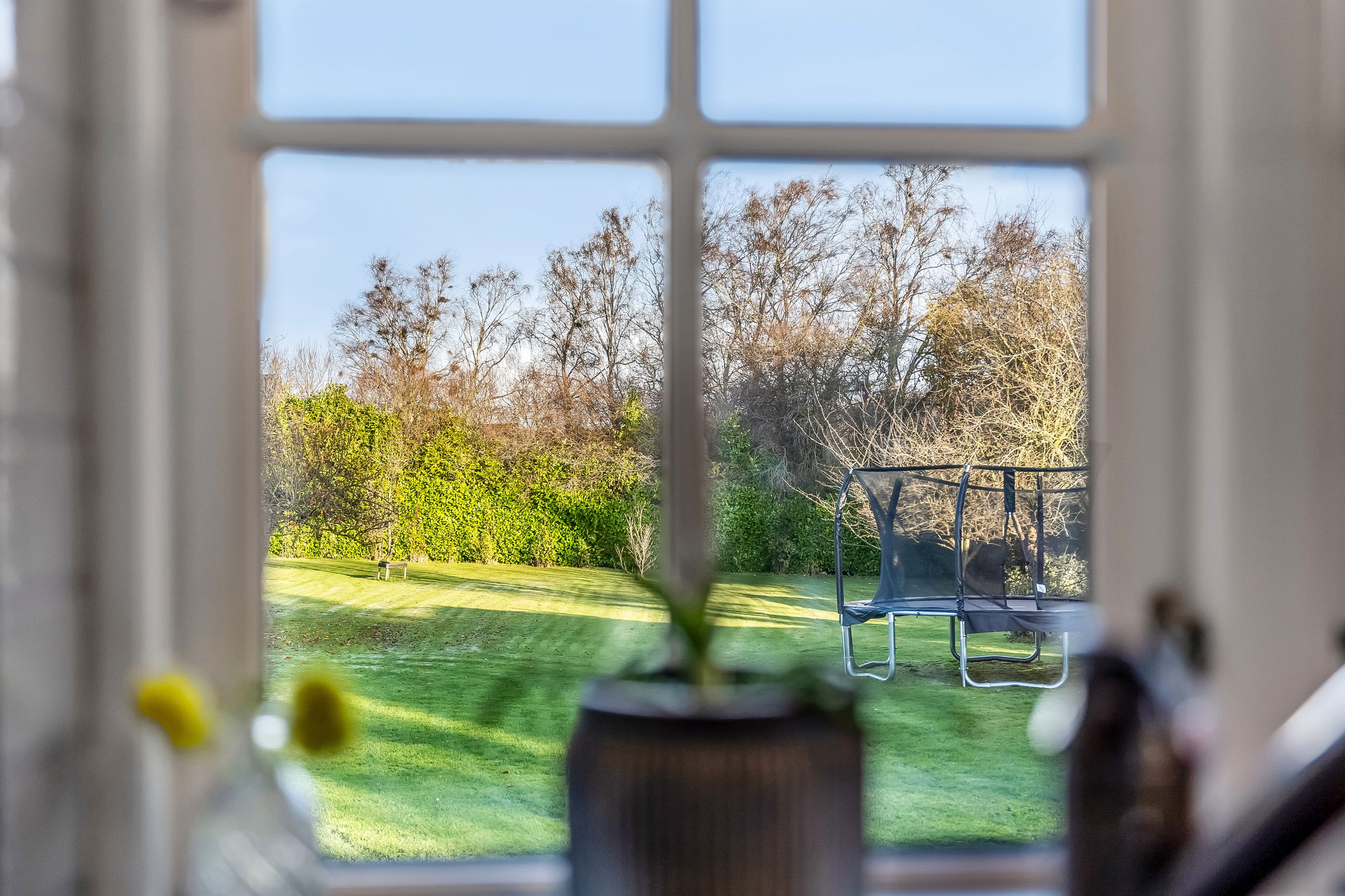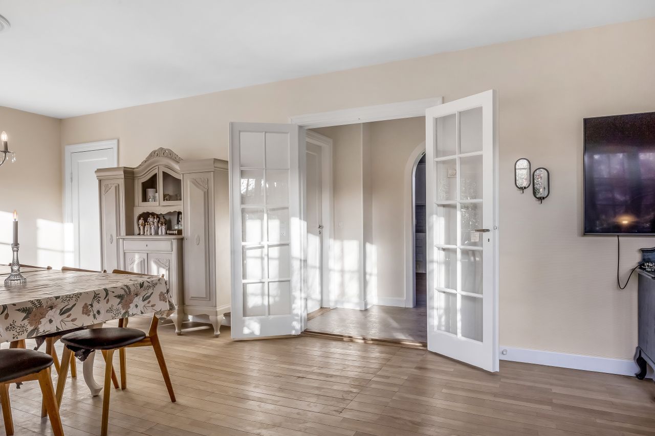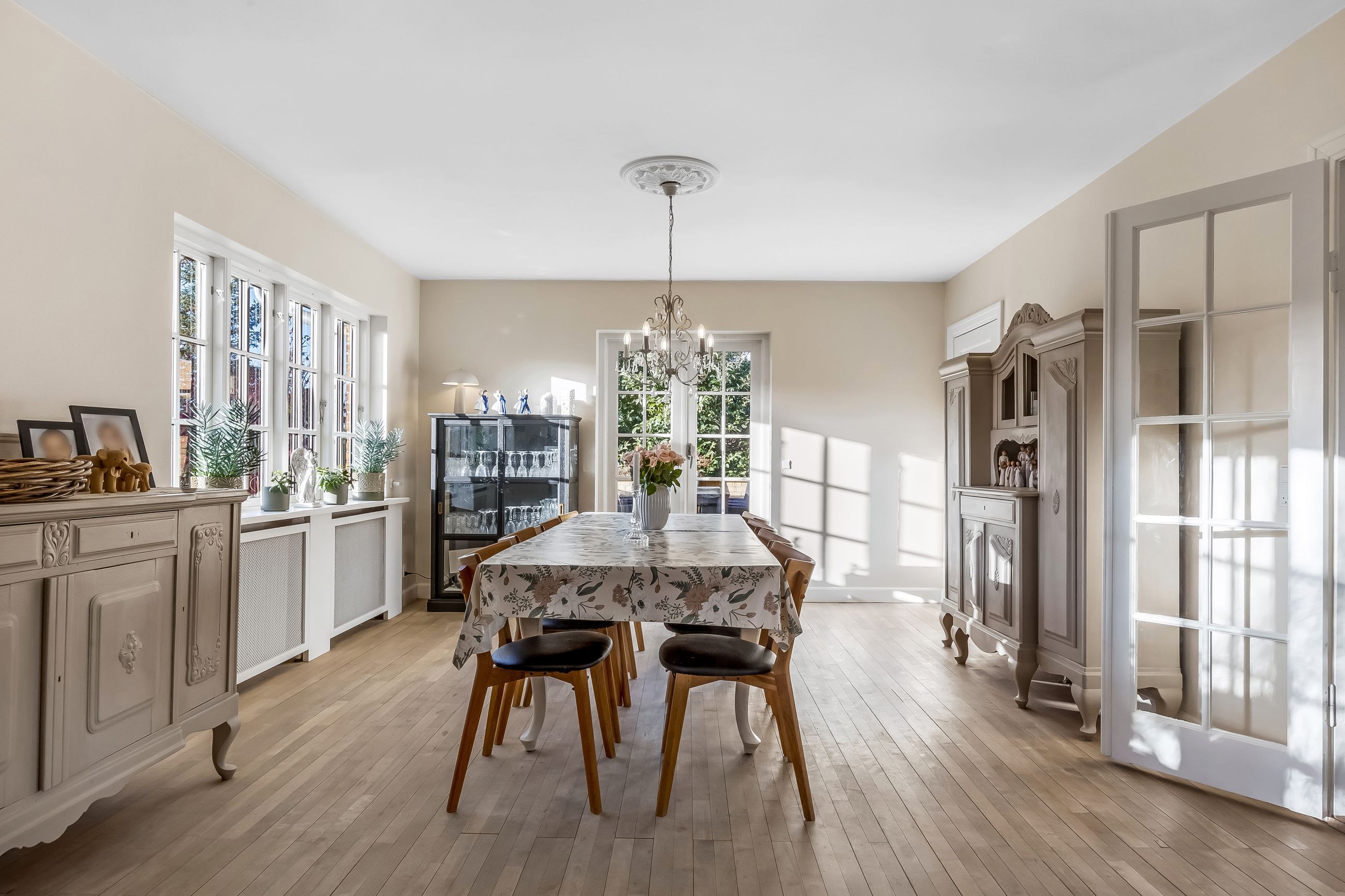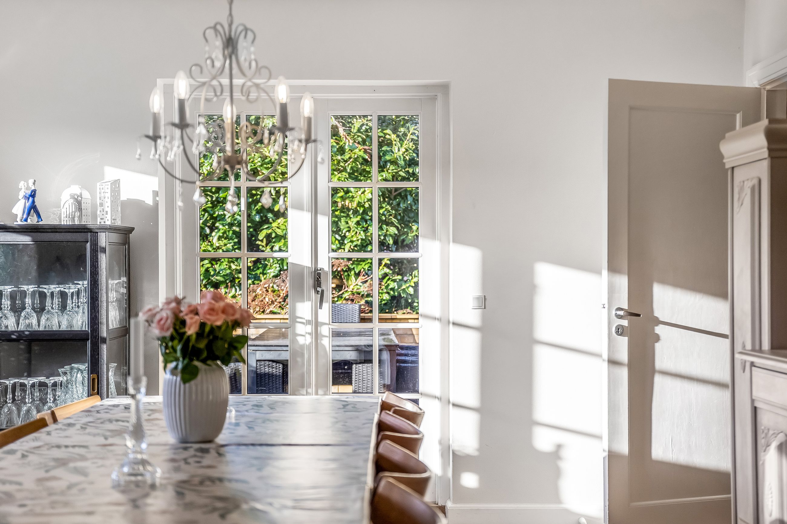 De sprossede vinduer er ikke bare dekorative – de passer til husets alder og stil. I stuen finder I stukrosetter og fine loftsdetaljer, der vidner om, at her er tænkt over helheden fra starten. De klassiske døre og karme er bevaret og giver en autentisk følelse af kvalitet – en slags diskret luksus, man ikke rigtig kan kopiere i nybyggeri.