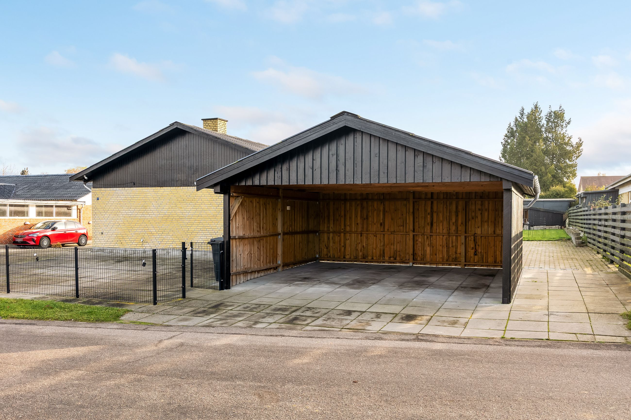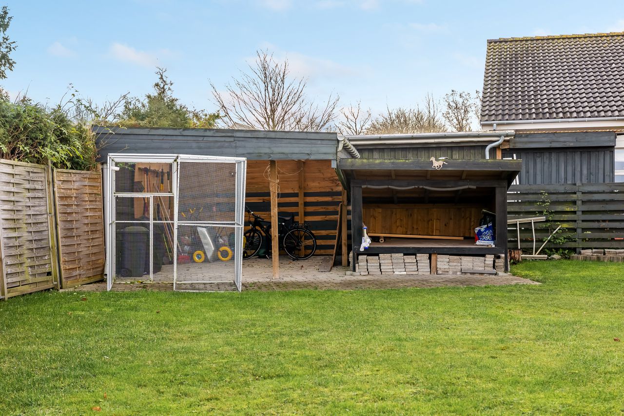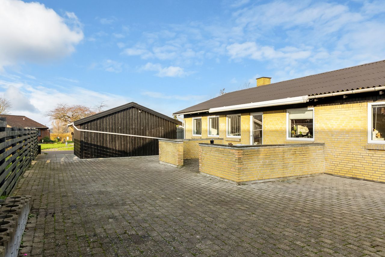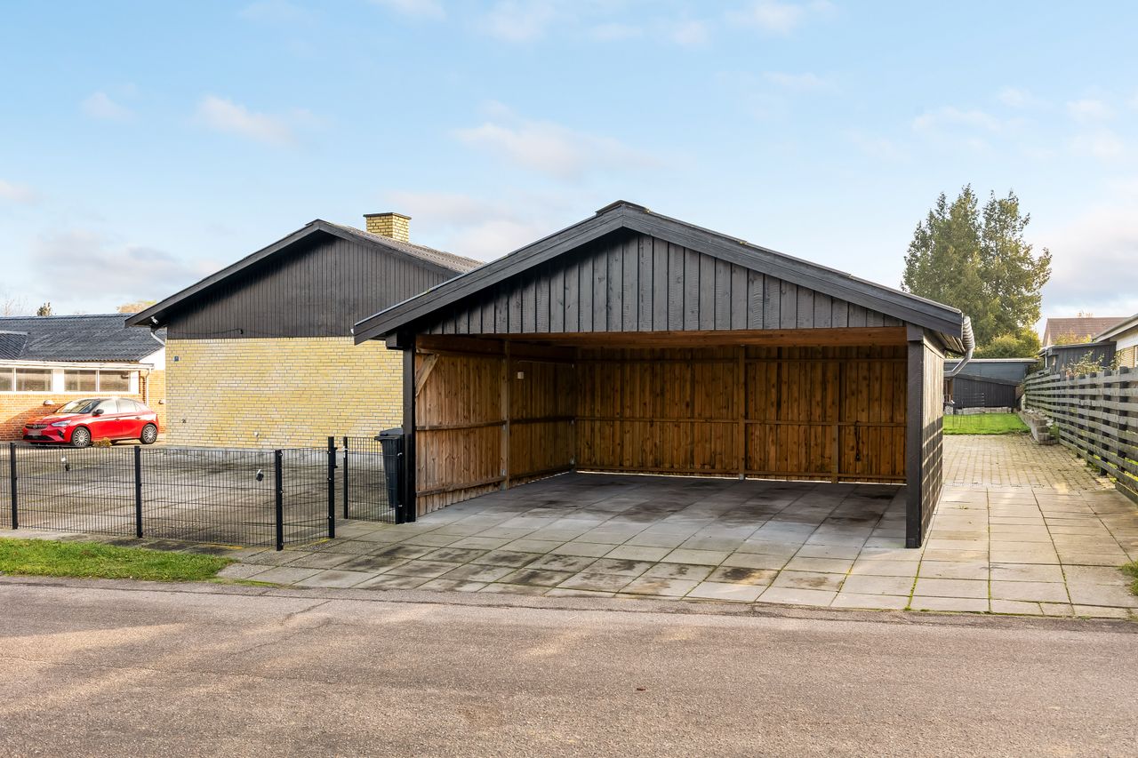 Udenfor får I rigtig meget med i pakken: Foran huset ligger en stor indkørsel og en flot dobbeltcarport fra 2021 på ca. 25 m2 så både biler, cykler og barnevogn står tørt. Derudover er der udhus/disponible rum på ca. 25 m2 i forlængelse af huset som kan bruges til værksted, hobby, opbevaring – eller det hele på én gang.