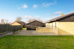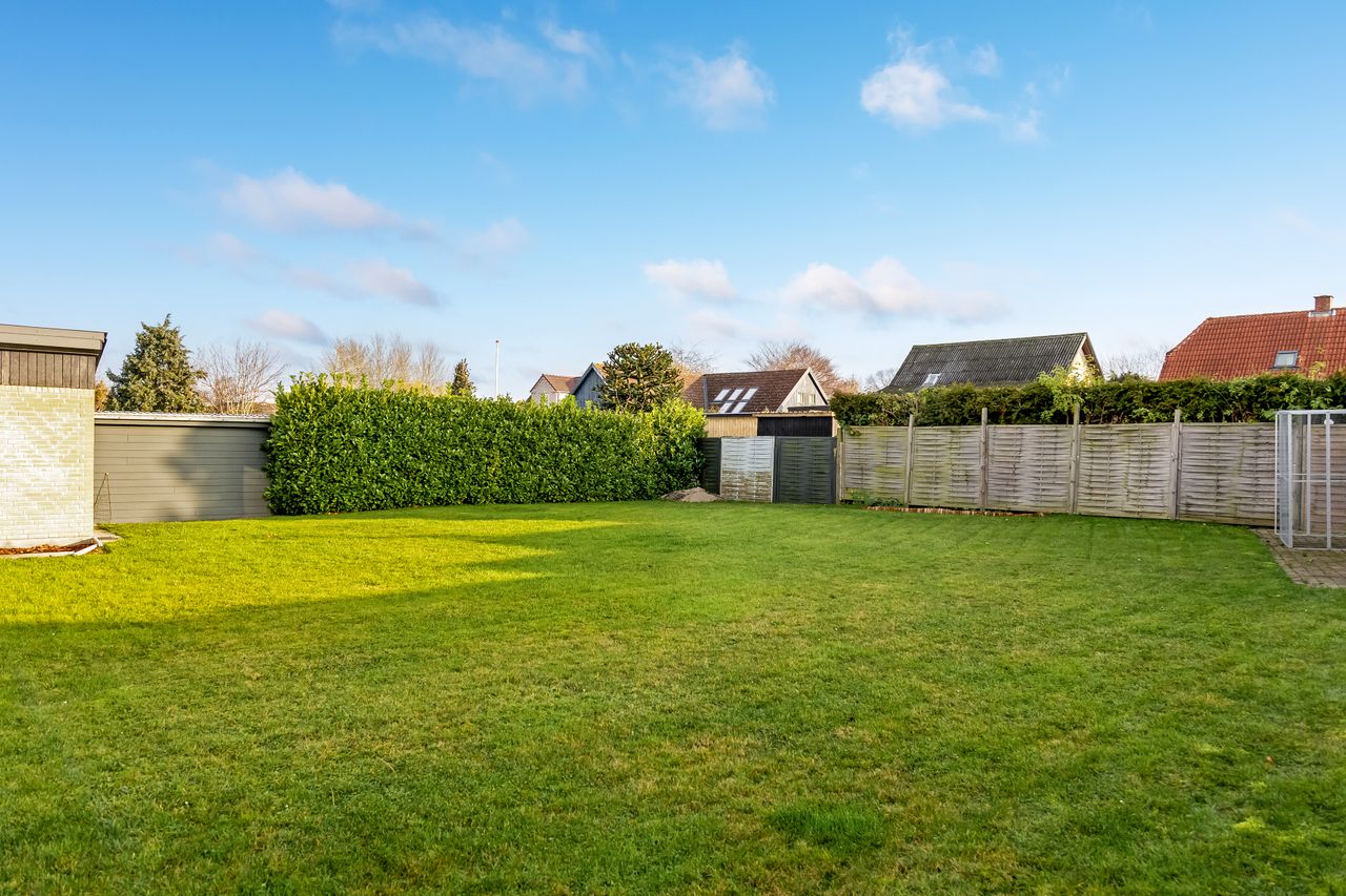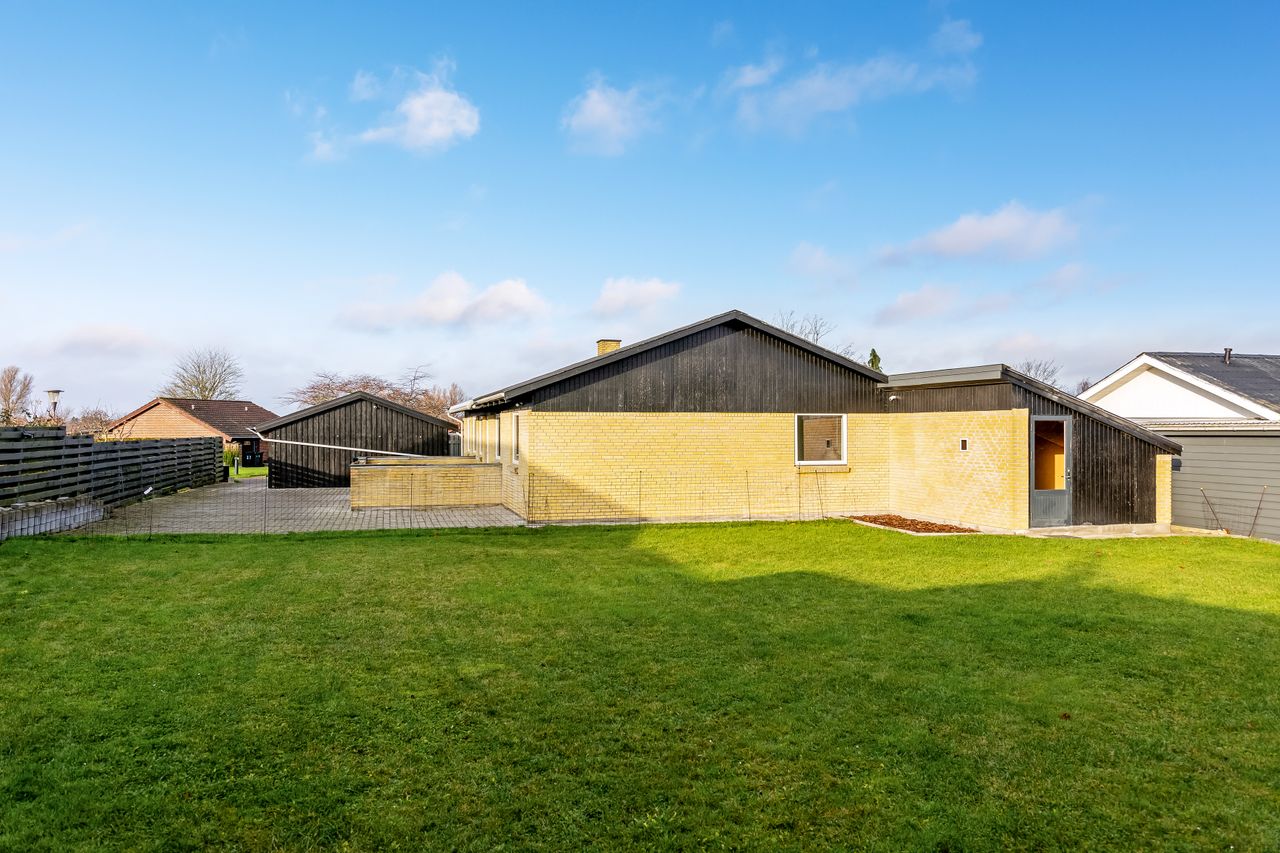 Bag huset venter haven med stor fliseterrasse med sol fra morgen til aften og en god regulær græsplæne. Her er der plads til trampolin, boldspil, badebassin og lange sommeraftener ved grillen. I hjørnet ligger et shelter som bliver et kæmpe hit for både børn og voksne – her kan der soves ude, ristes snobrød og kigges stjerner, uden at man skal køre på spejderlejr.