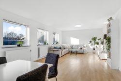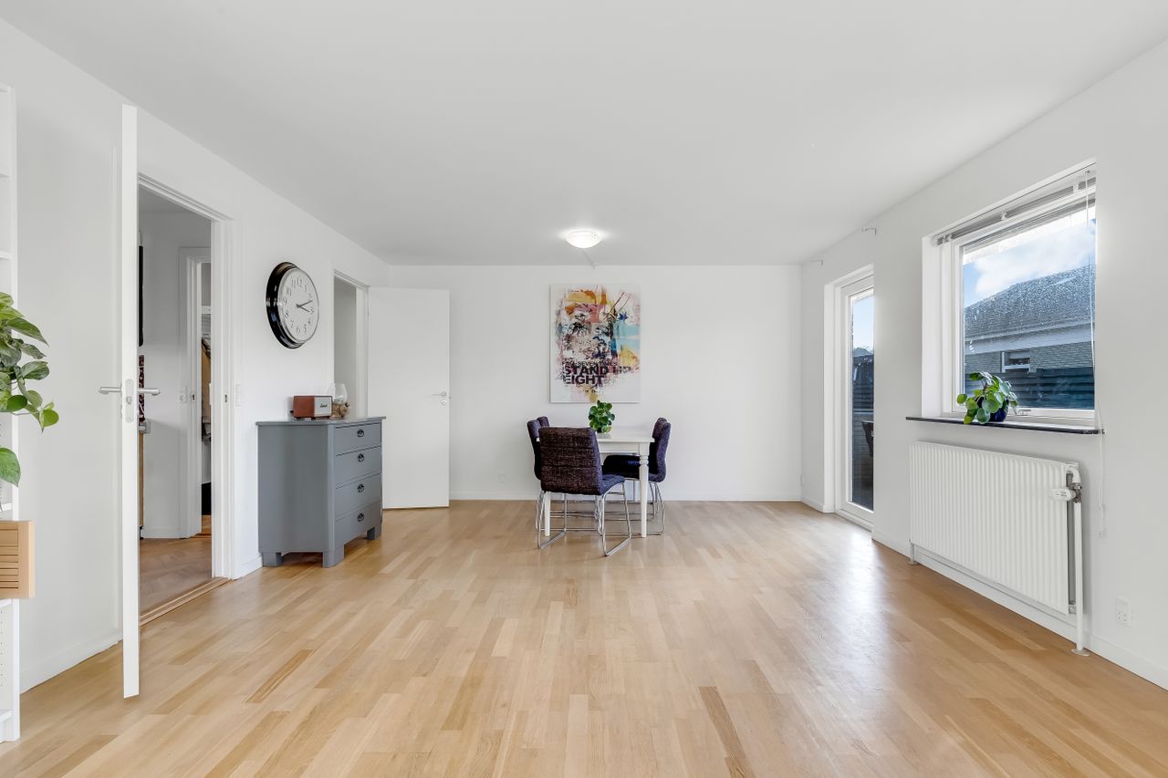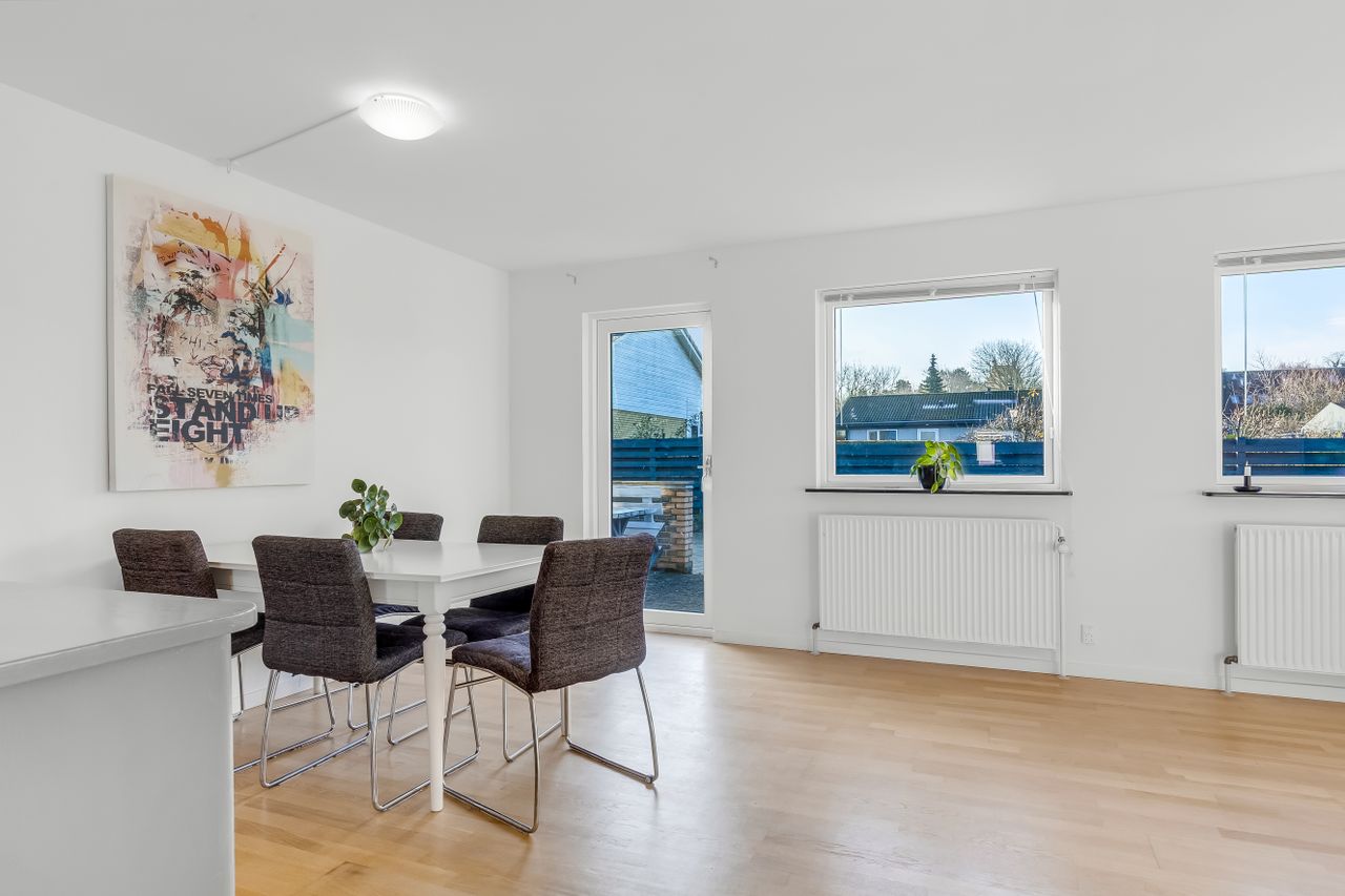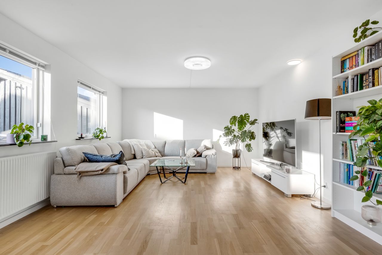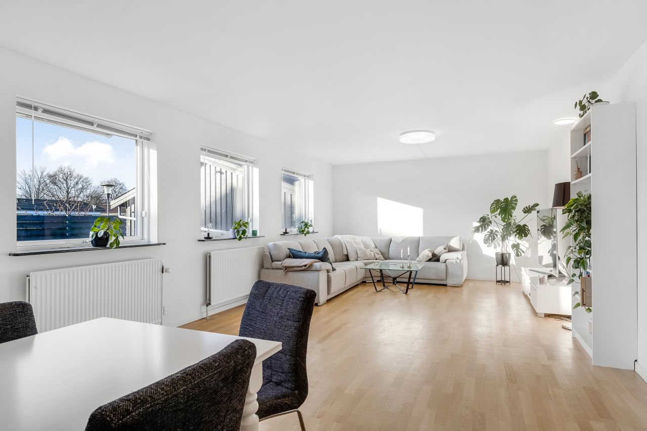 Boligen byder på 126 m2 i ét plan med en planløsning, der bare fungerer. Hjertet i huset er den store, lyse stue med brede vinduer, hvide vægge og flotte gulve, der giver en let og moderne stemning. Her er god plads til den store sofa, TV-hjørne, bogreol og grønne planter – og til både rolig søndag og livlig fredag aften.
