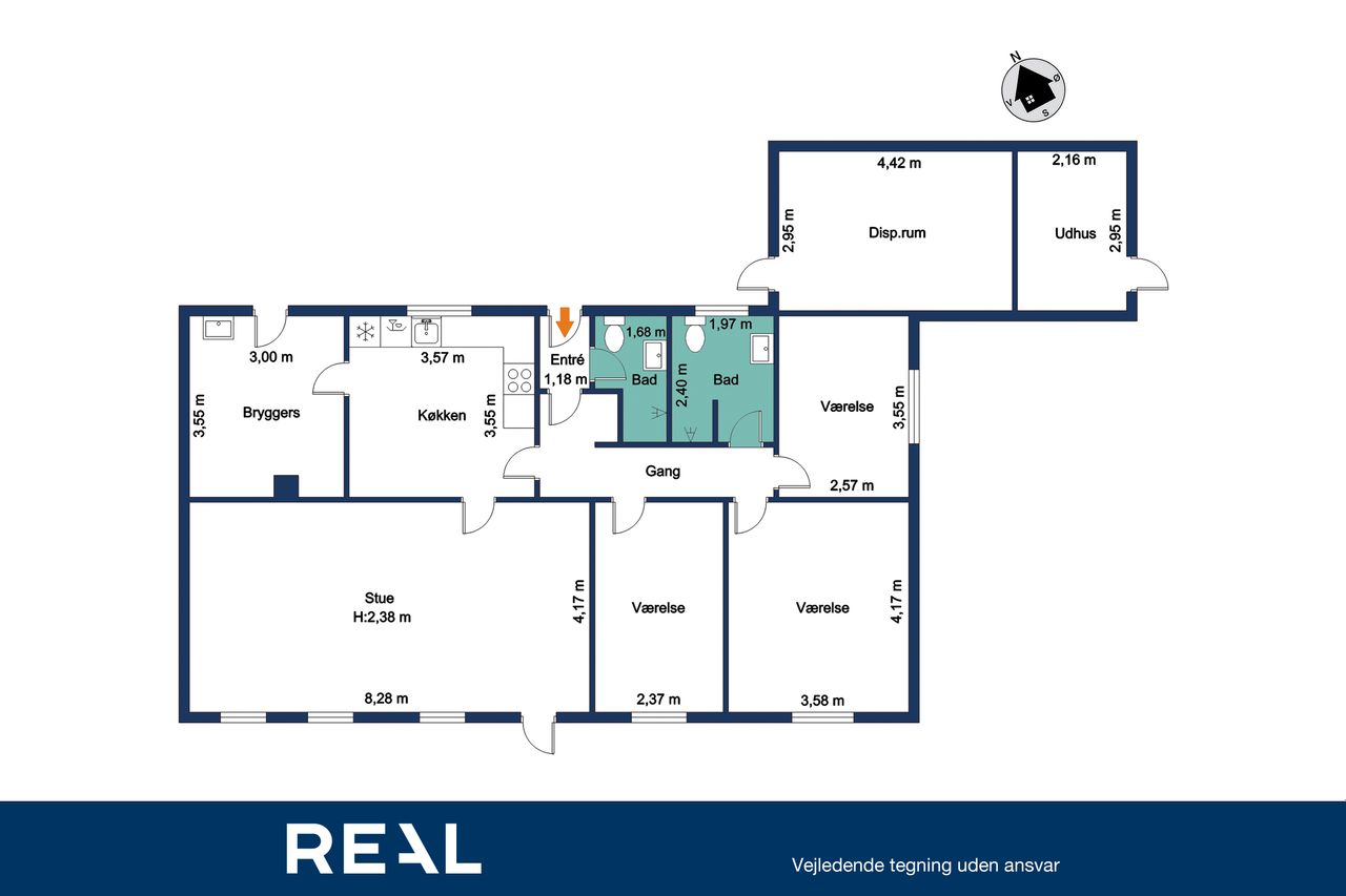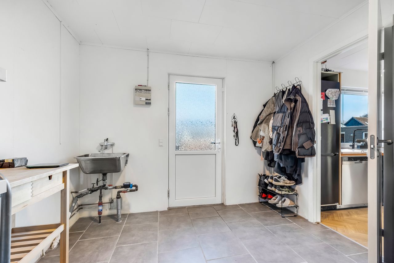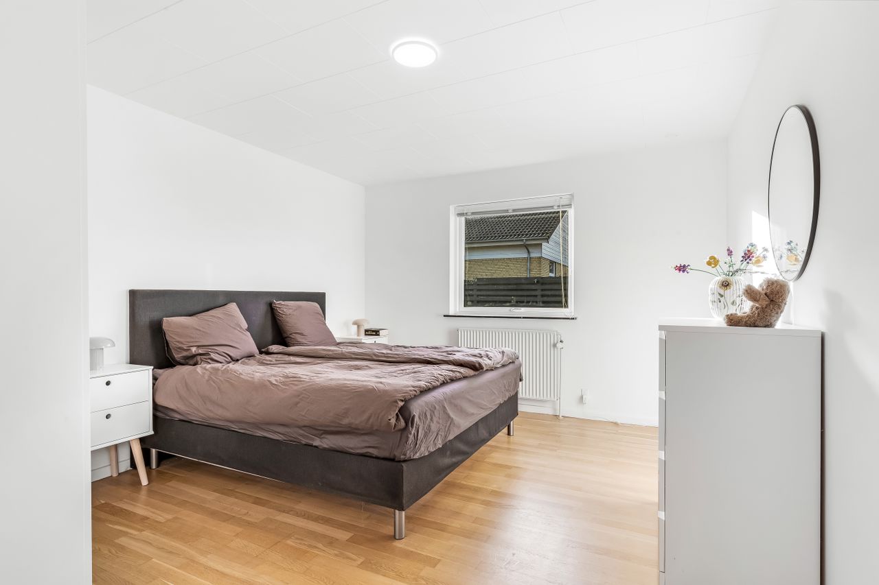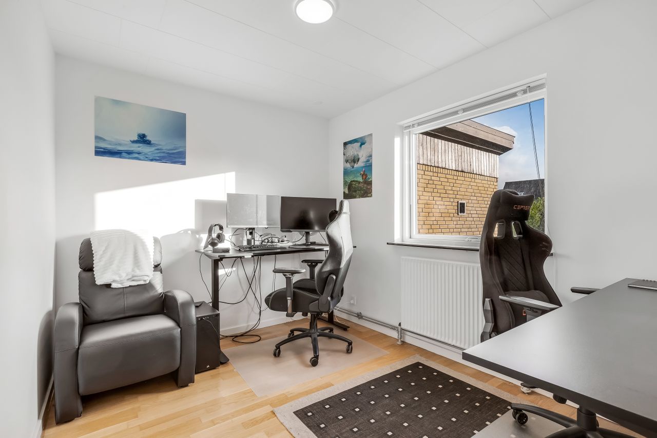 I får i alt 3 gode værelser, som kan indrettes til soveværelse, børneværelser, kontor, gamer-hule eller gæster – alt efter familiekonstellation og drømme. Dertil kommer et stort og praktisk bryggers med egen indgang, klinkegulv, vask og god plads til overtøj, sko og vasketøj – præcis det rum, der gør en travl hverdag meget nemmere.