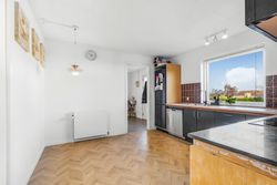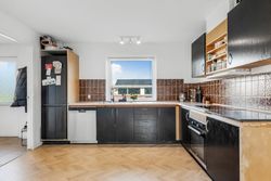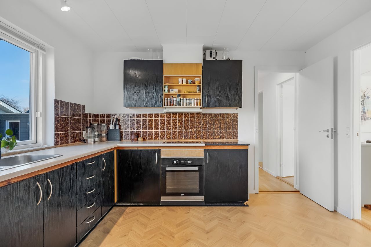Køkkenet er husets arbejdshest: et stort køkken med spiseplads, hvor der er rum til madlavning, lektier og morgenmad på én gang. Indretningen er ældre og trænger til lidt kærlig opdatering, men rummet er regulært og rummeligt, så det er oplagt for den næste ejer at forvandle det til et lækkert, moderne køkken-alrum.