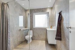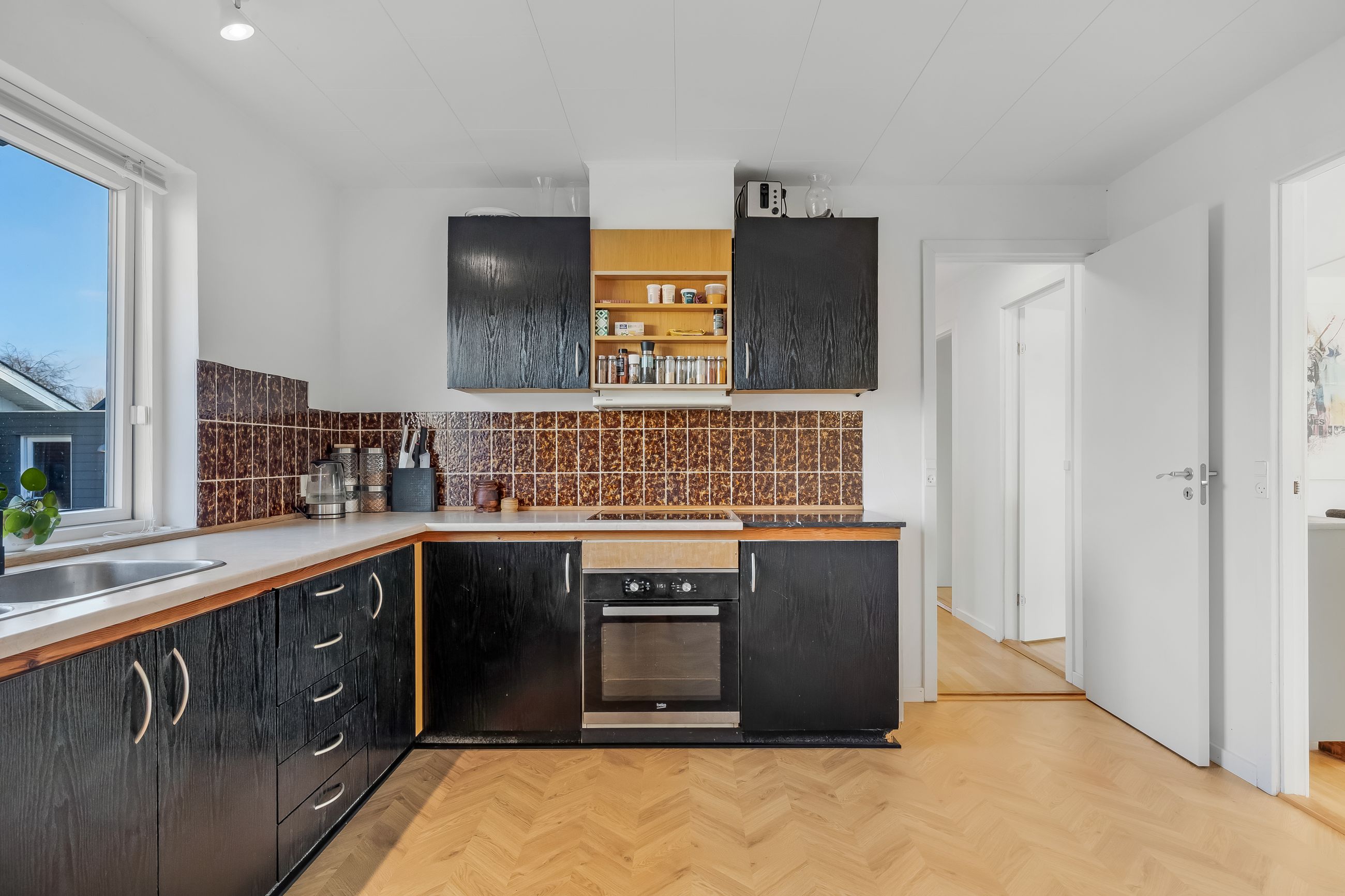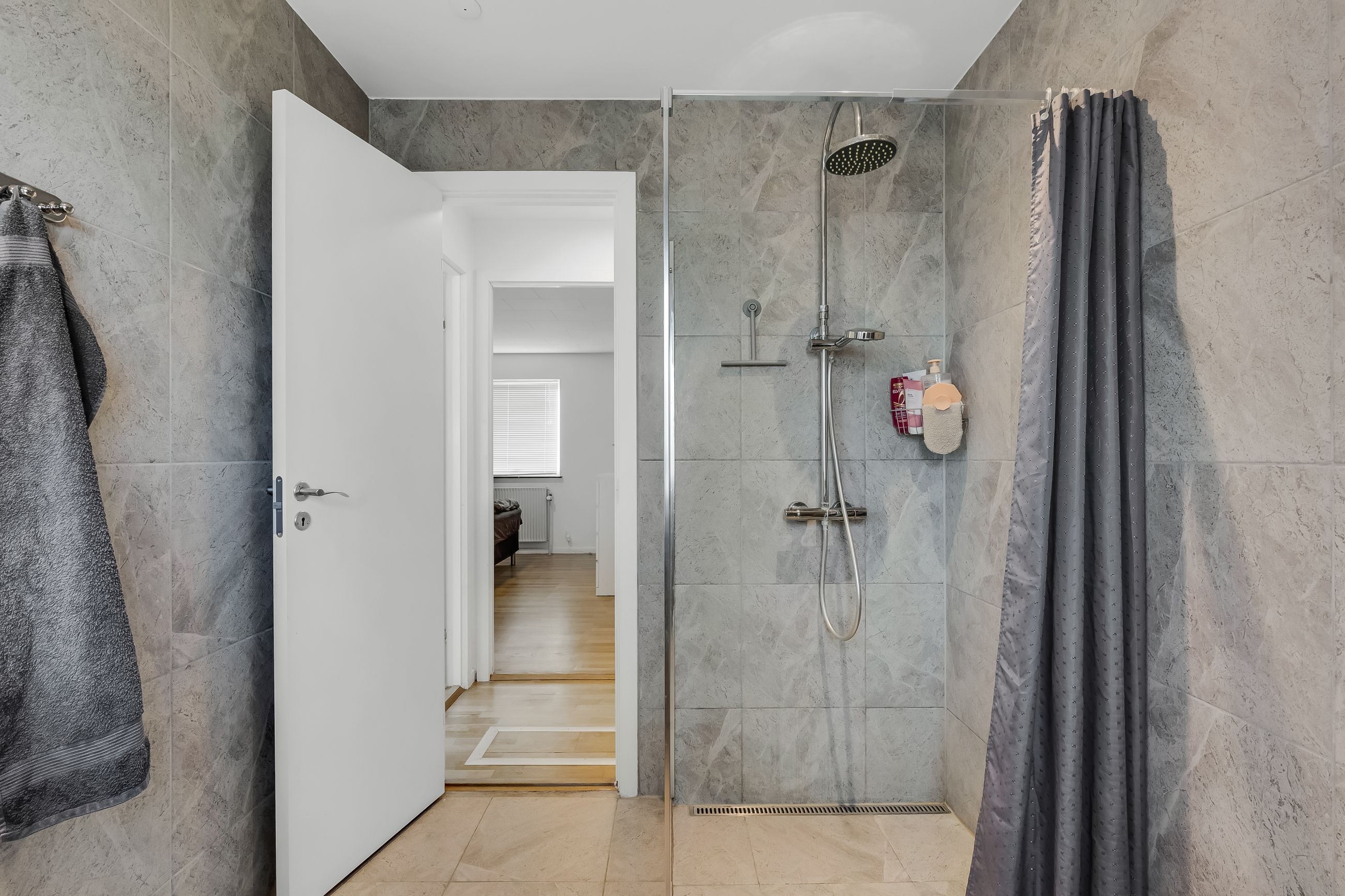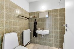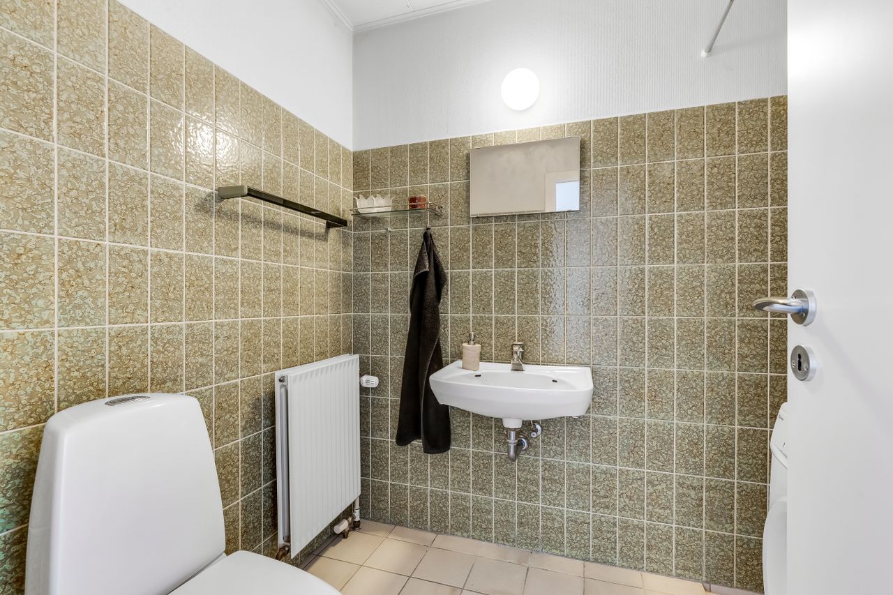 Badeværelsesafdelingen er derimod allerede løftet. Det ene er et lækkert, moderne badeværelse med flotte klinker, gulvvarme, bruseniche, indbygningsspots og god plads – lige til at nyde hver morgen. Ved siden af ligger et velholdt gæstebadeværelse i original 70’er-stil, som giver ekstra komfort i hverdagen.
