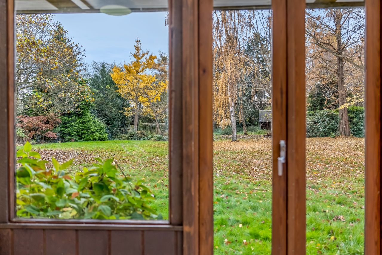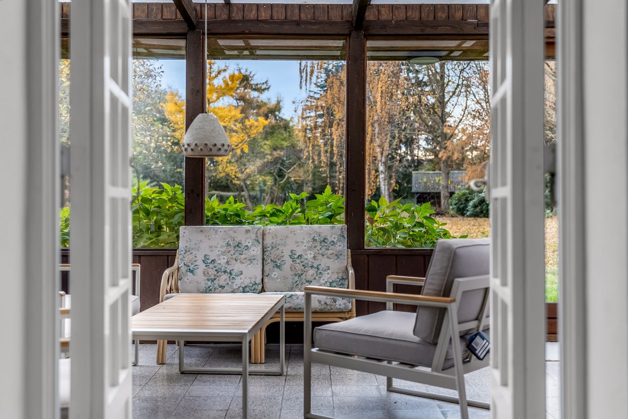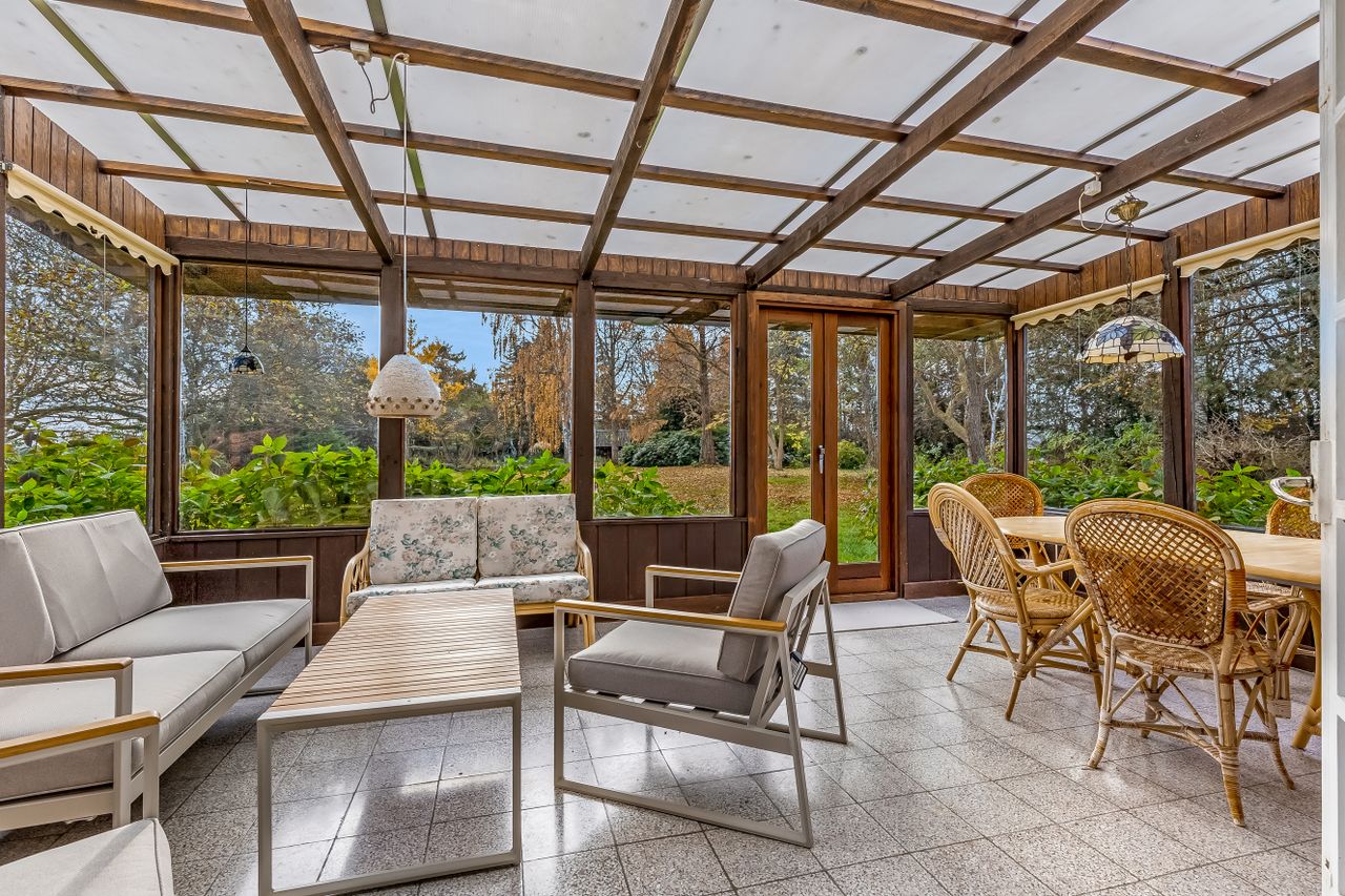 Hyggelig udestue med store glaspartier, hvor I kan sidde helt tæt på haven det meste af året. Det er nemt at forestille sig lange sommeraftener, spil ved bordet og børn, der løber ud og ind.