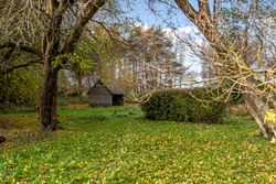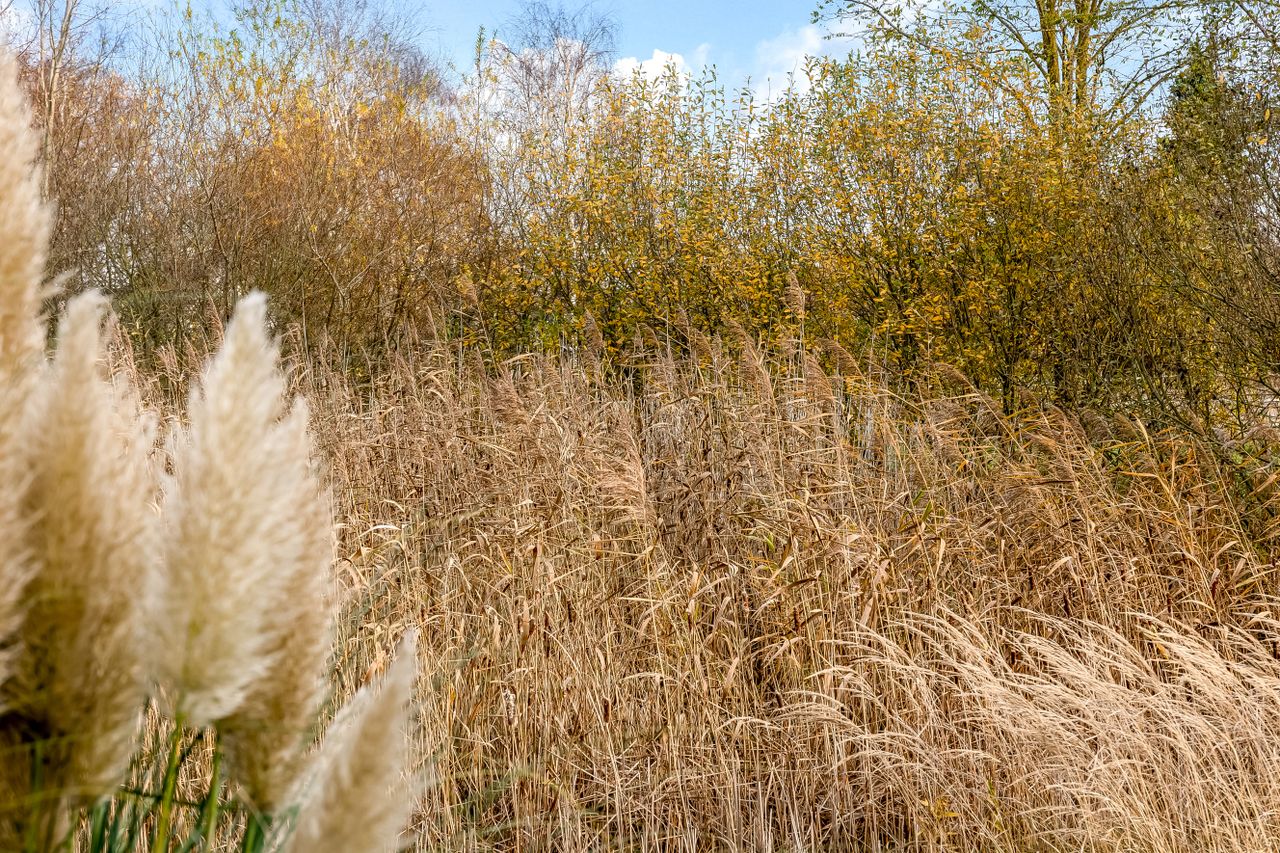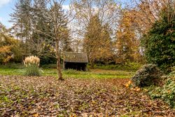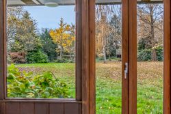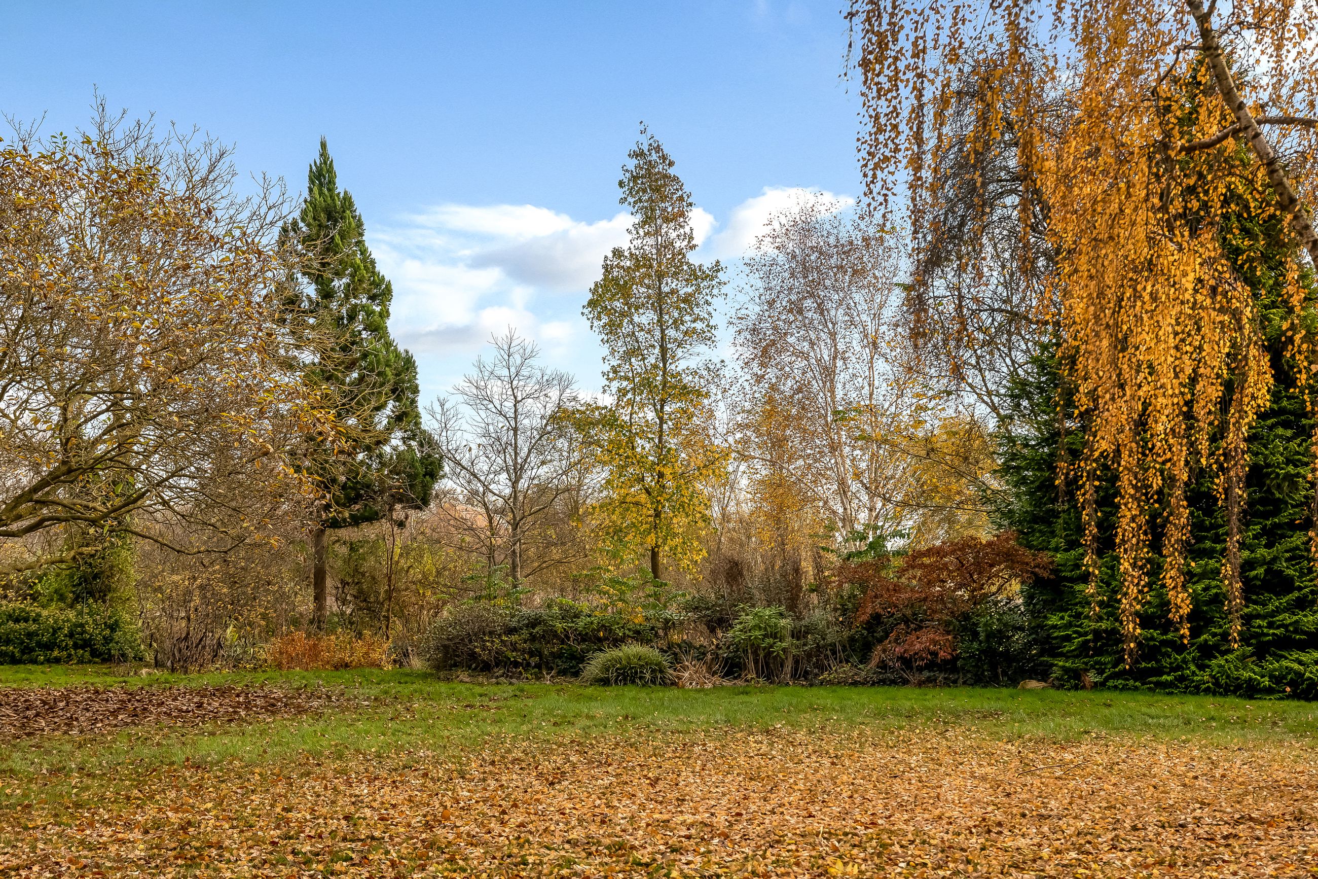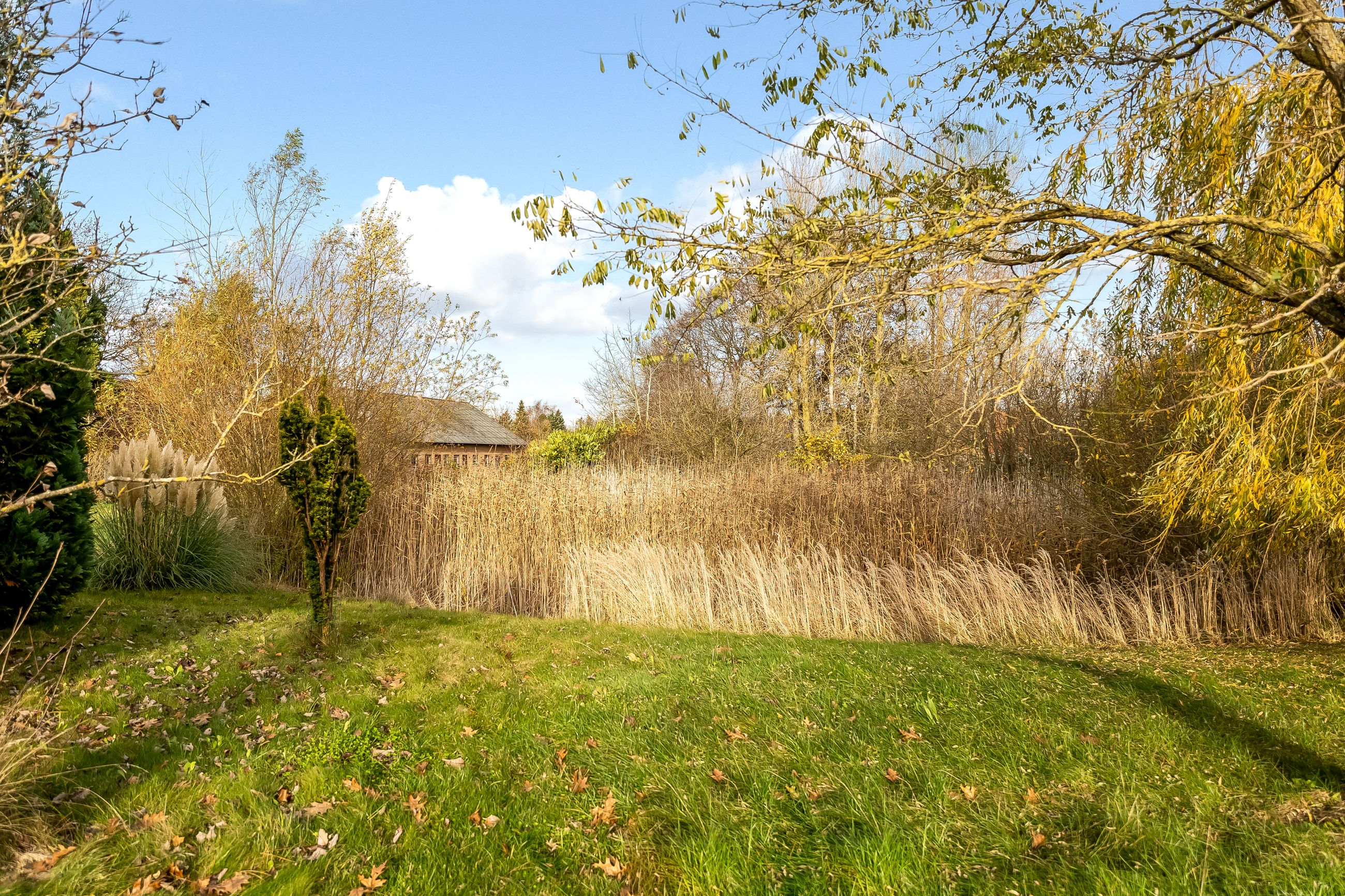 Udenfor er grunden noget helt særligt. Rundt om huset har I en parklignende have med store græsarealer, gamle træer, buske og farverige efterårsscener. Længere ude bliver det mere vildt og naturnært med højt græs, siv og et lille sø-/vandhul, hvor fugle, frøer og insekter trives.