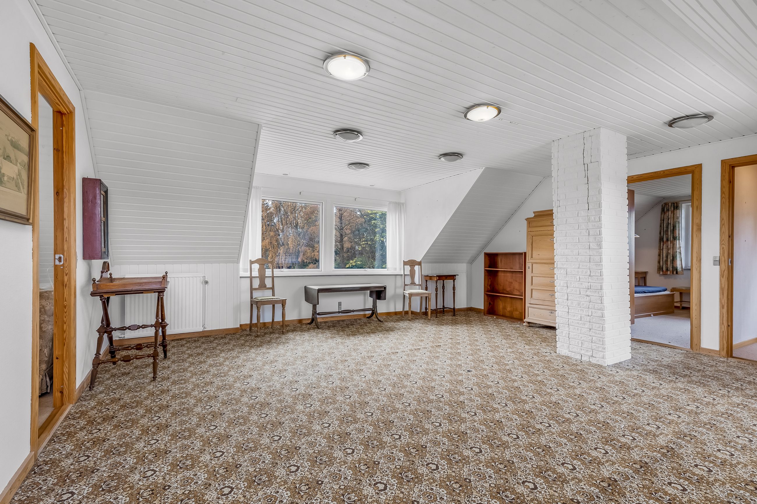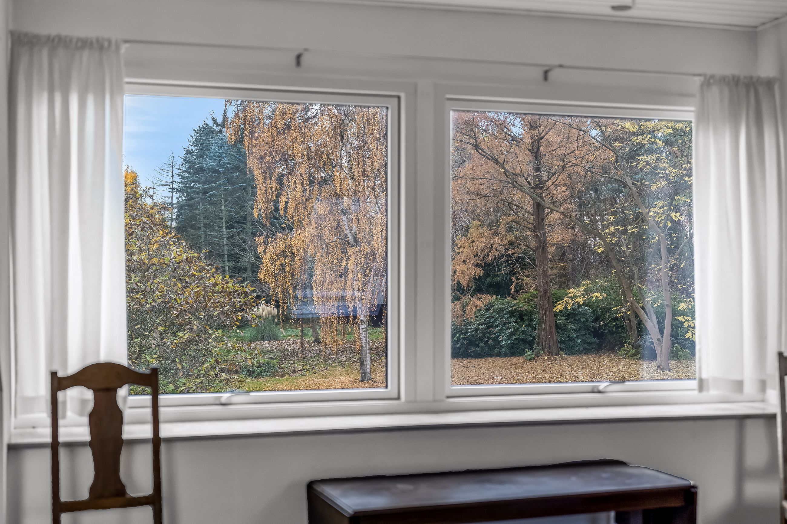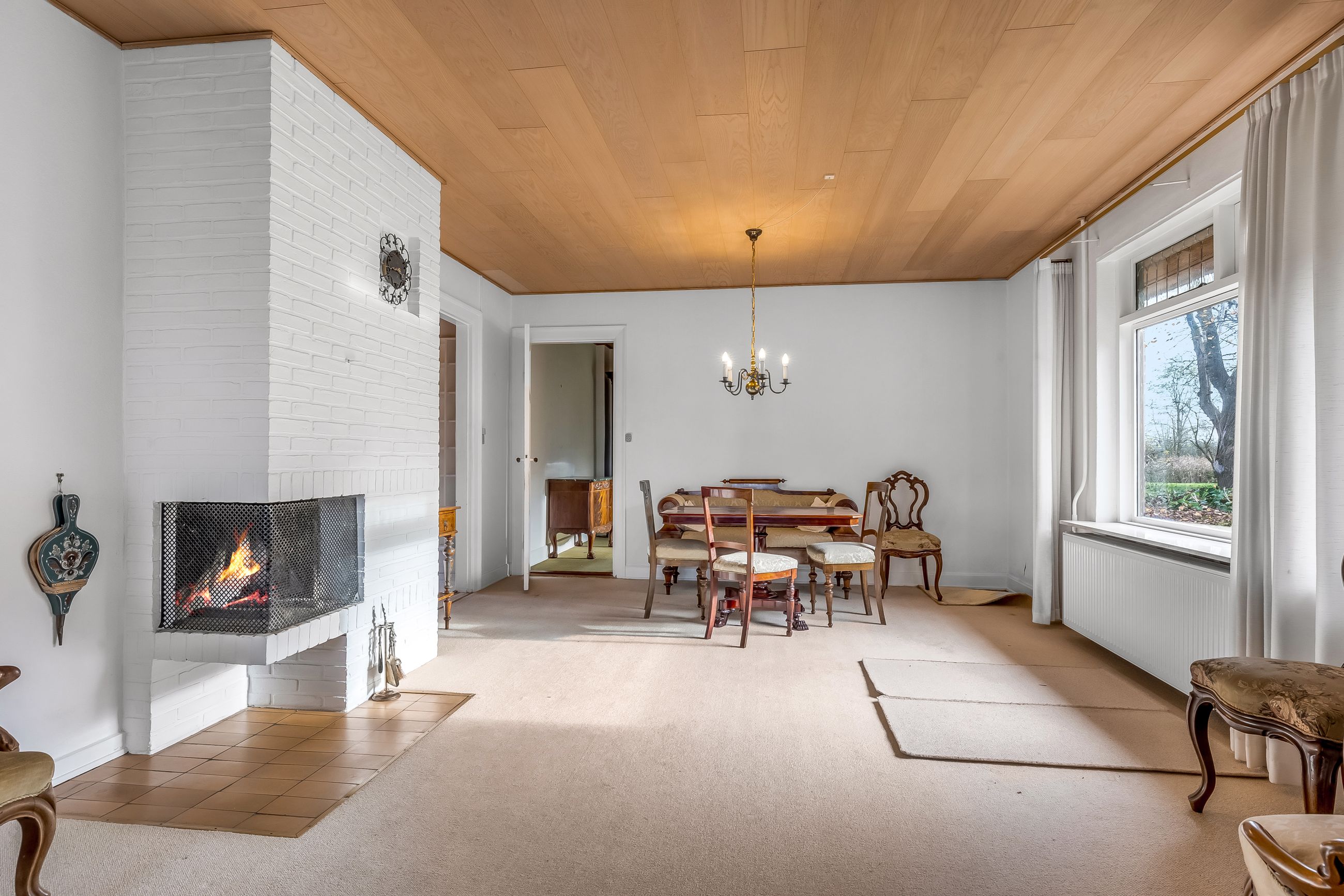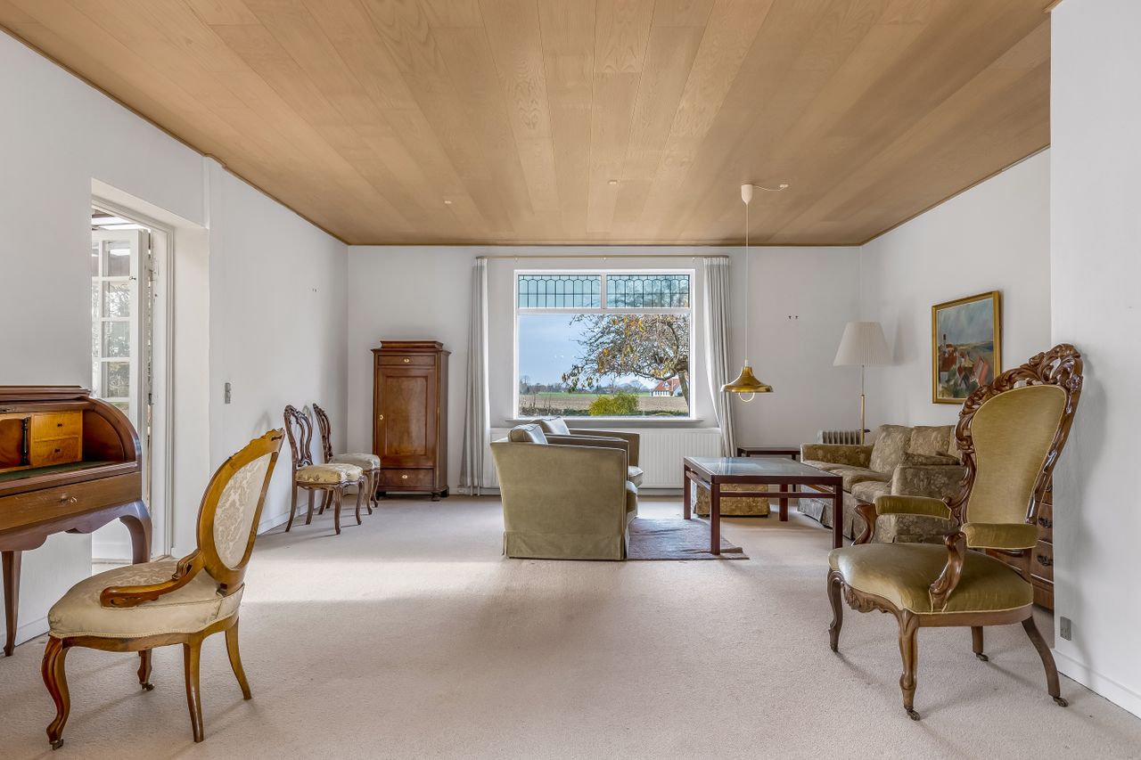 Stor vinkelstue med pejs og et smukt, bredt vindue med kig over markerne. Her er god plads til både spisebord og sofahjørne, og den åbne sammenhæng til den tilstødende stue giver et lyst og rummeligt opholdsareal.
