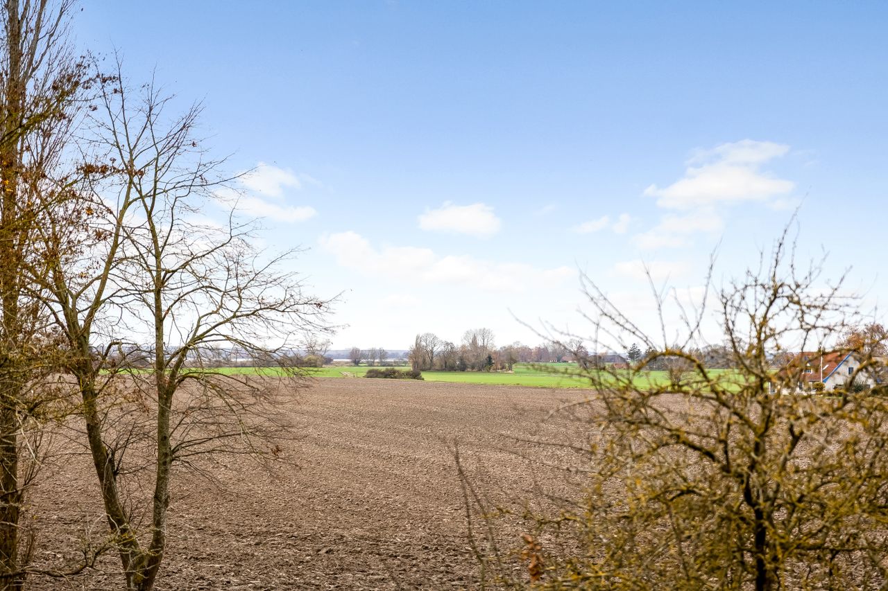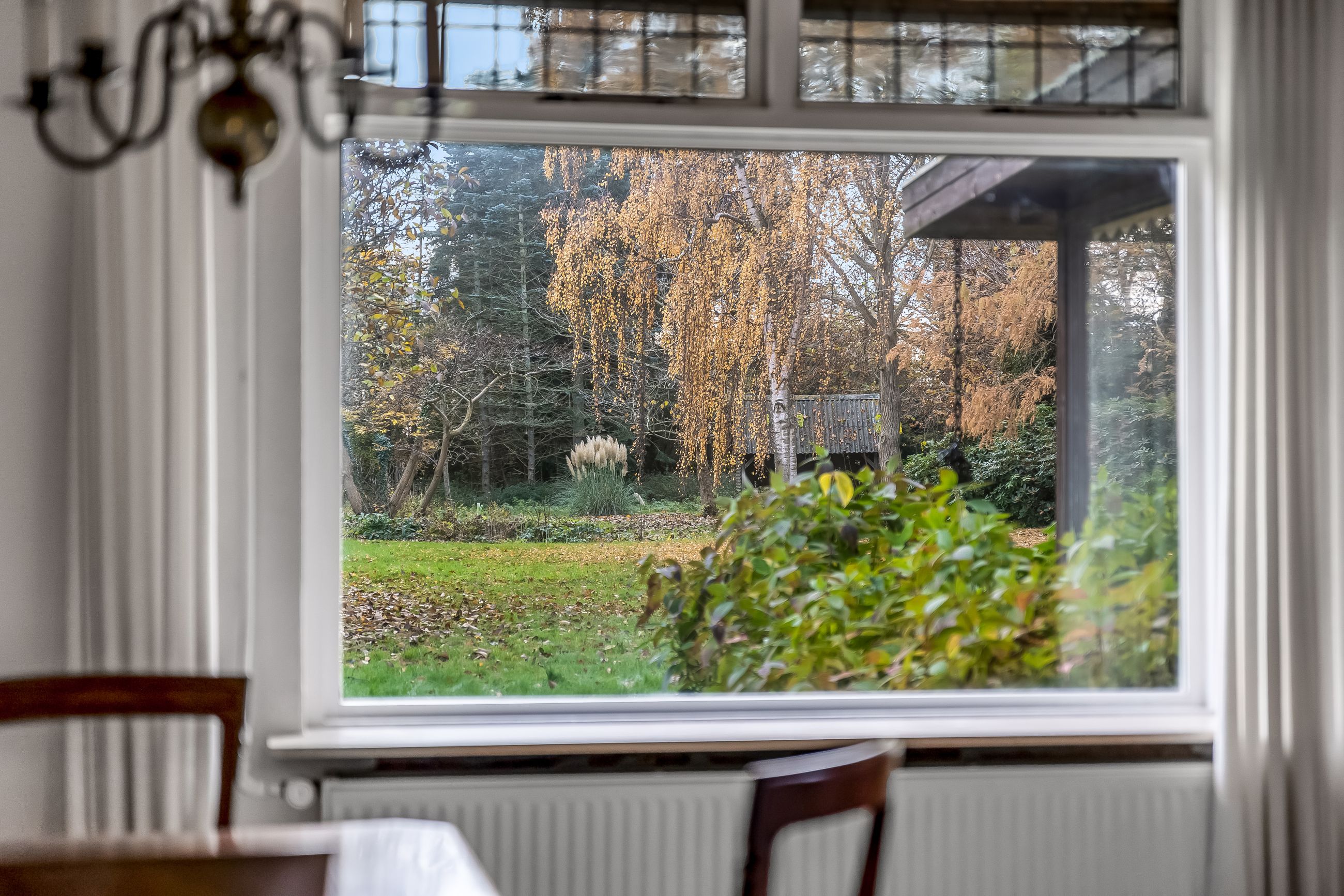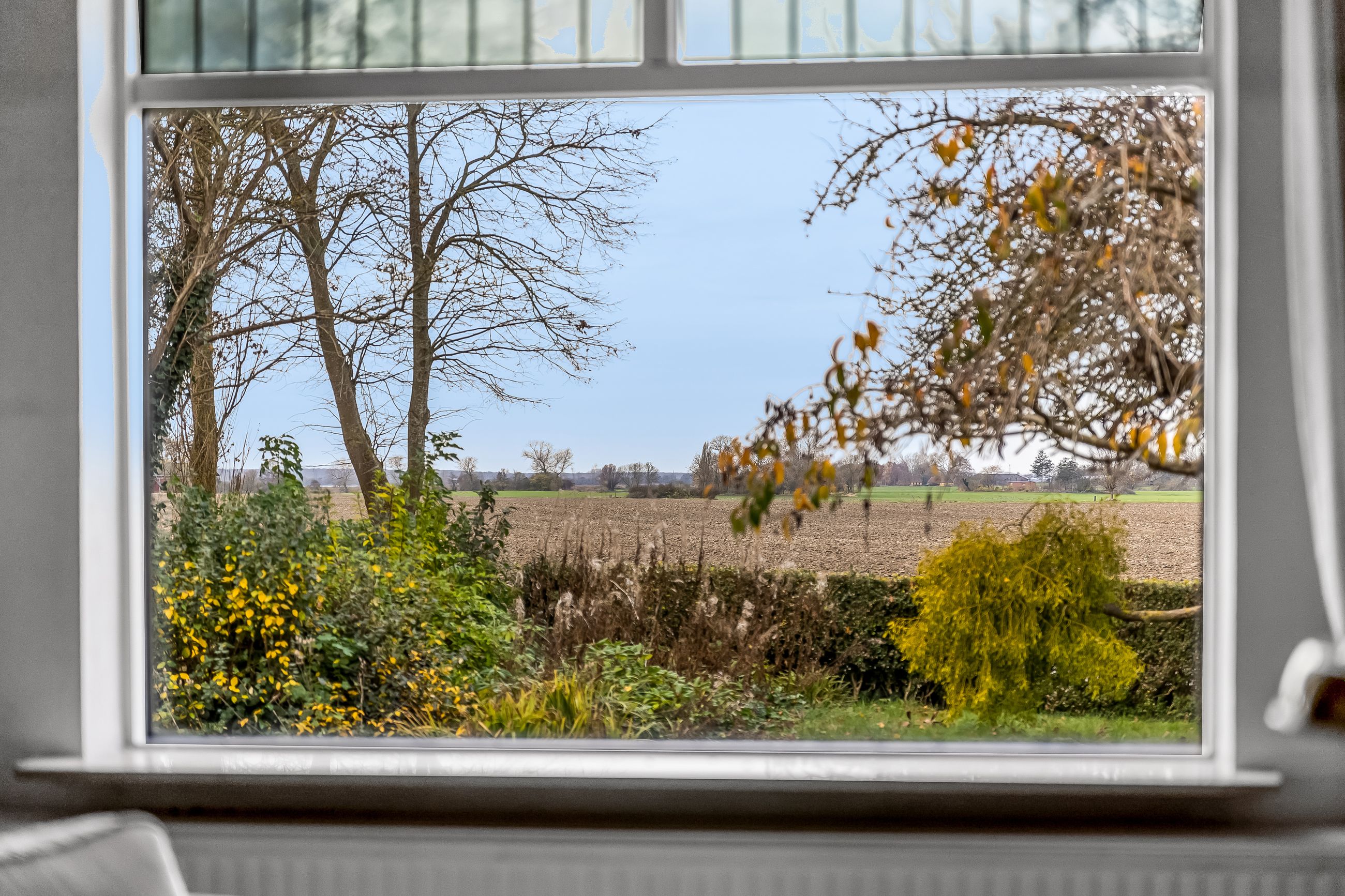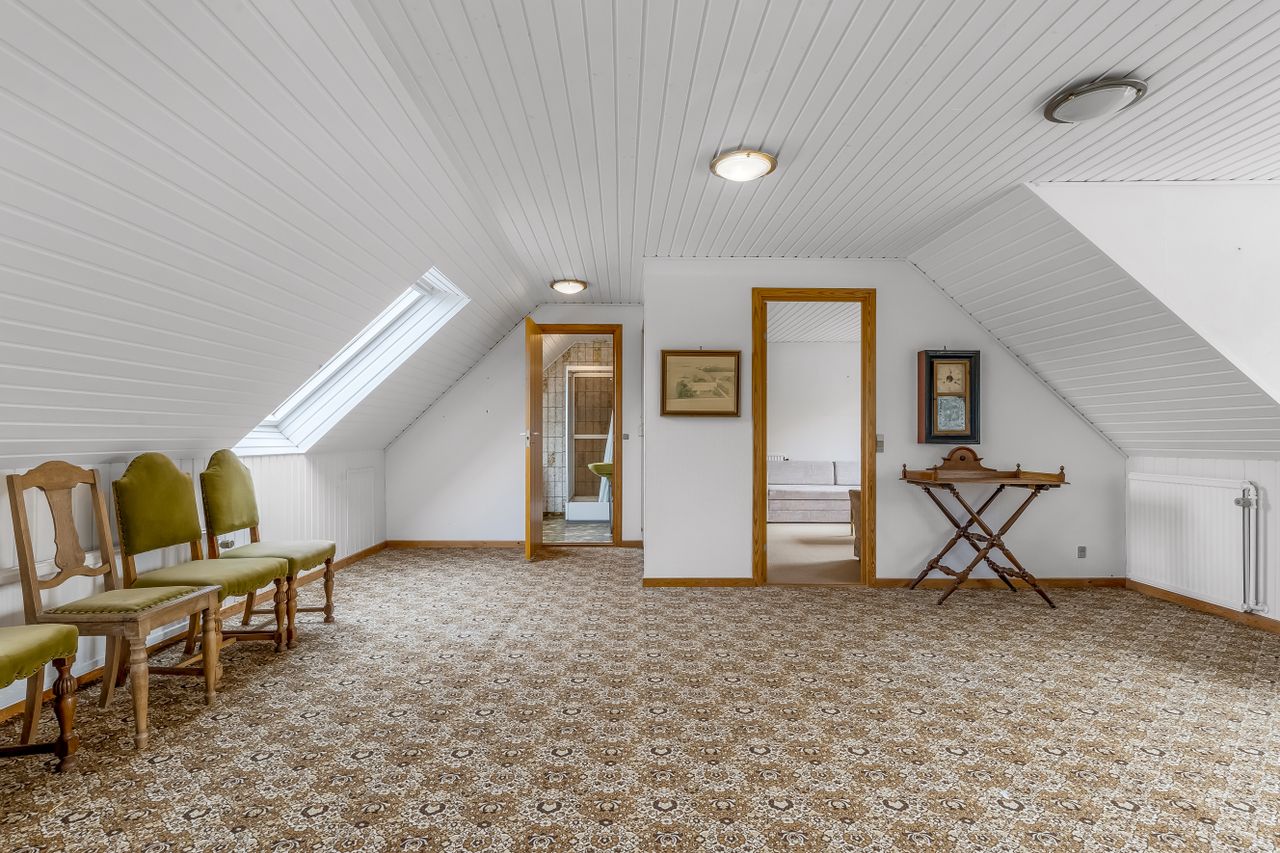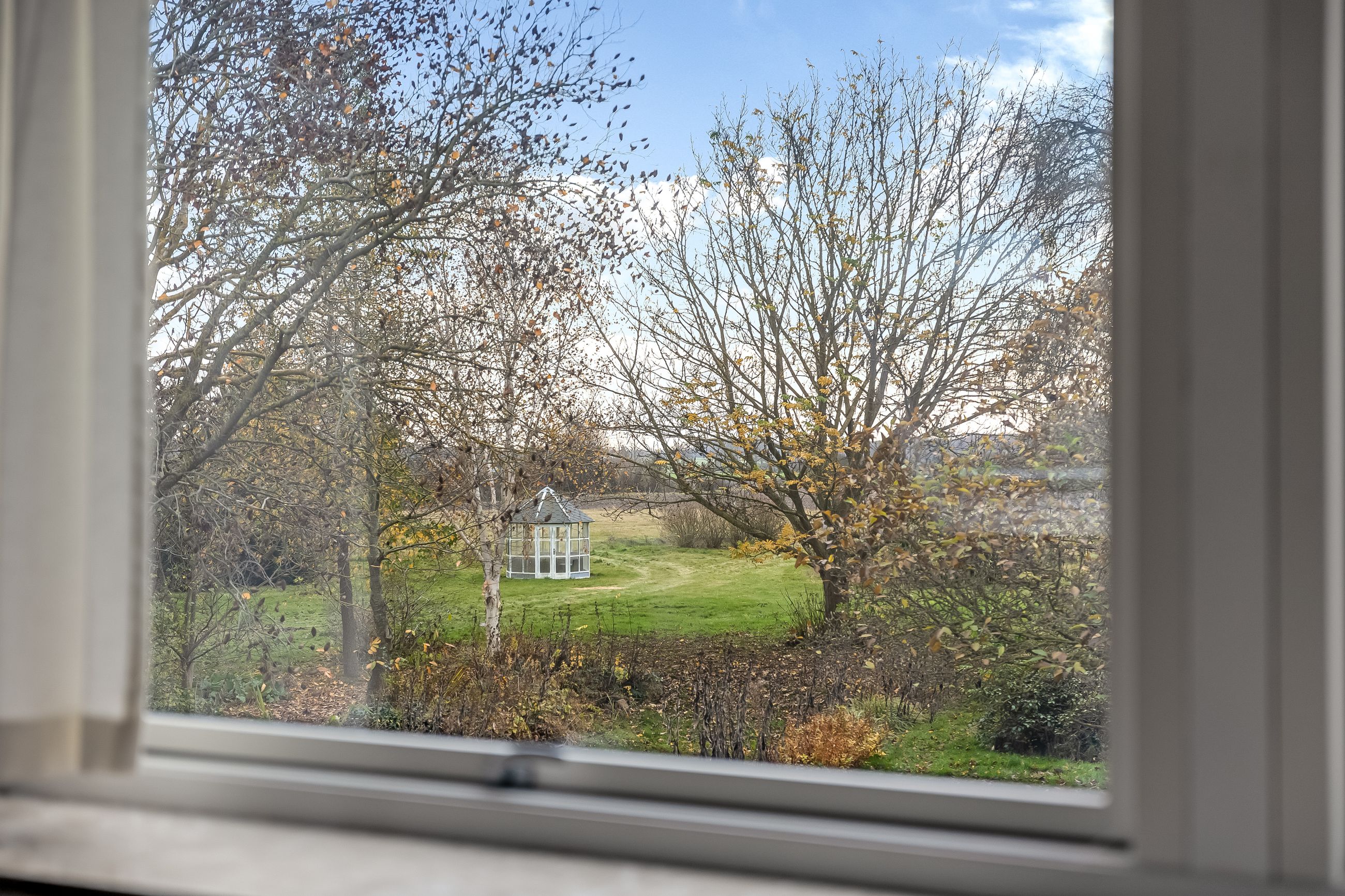 Stor vinkelstue med pejs og et smukt, bredt vindue med kig over markerne. Her er god plads til både spisebord og sofahjørne, og den åbne sammenhæng til den tilstødende stue giver et lyst og rummeligt opholdsareal.