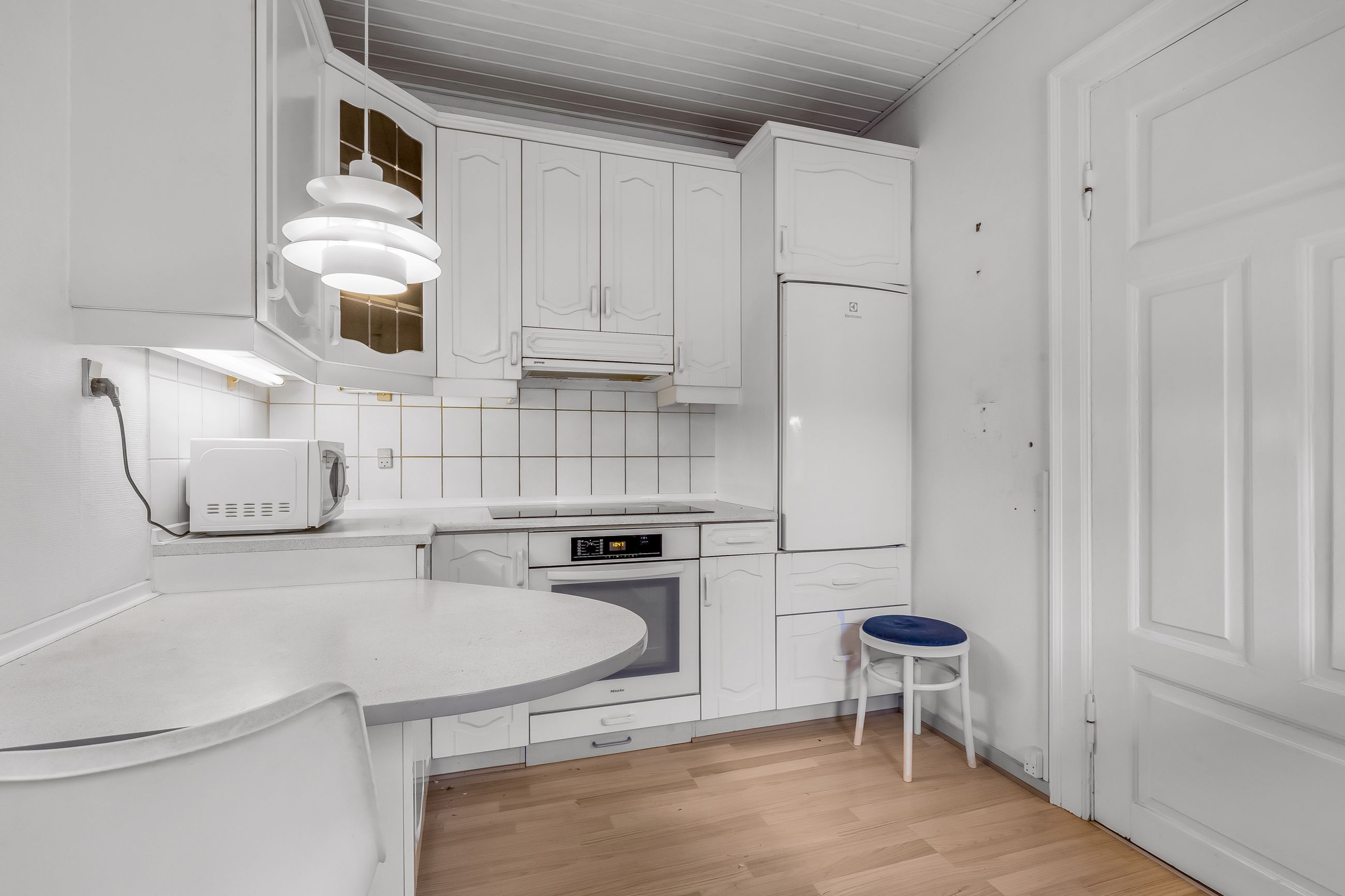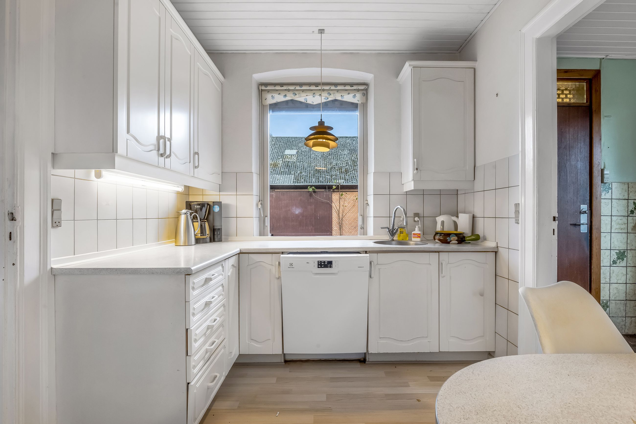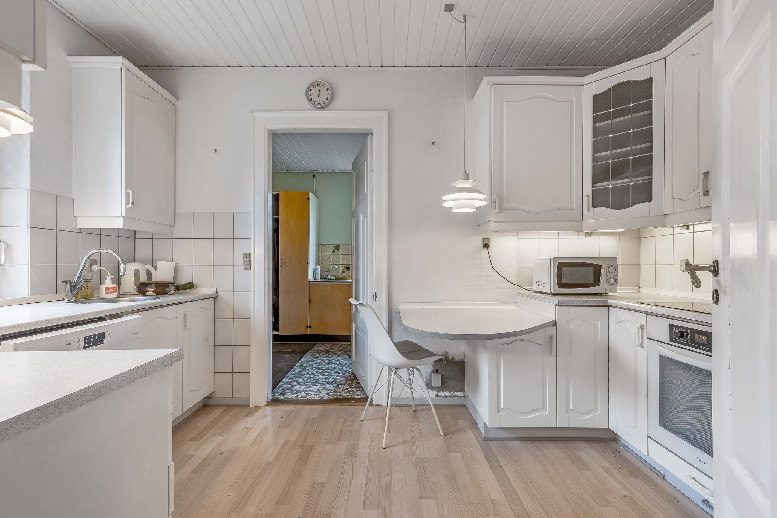 Køkken i klassisk hvid stil, som ikke er nyt, men pænt og funktionelt, med god skabsplads og lille spiseplads til hverdagens hurtige måltider og lektier.