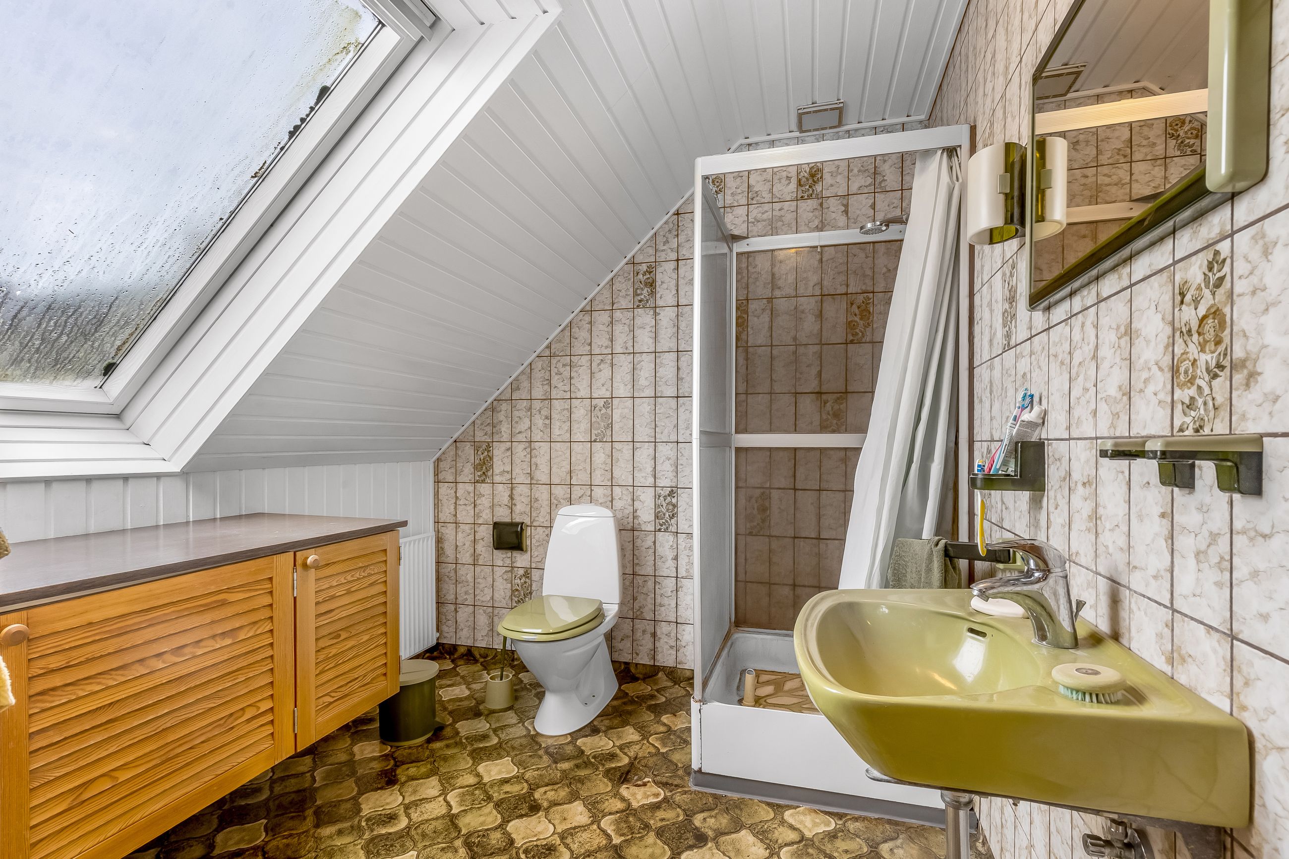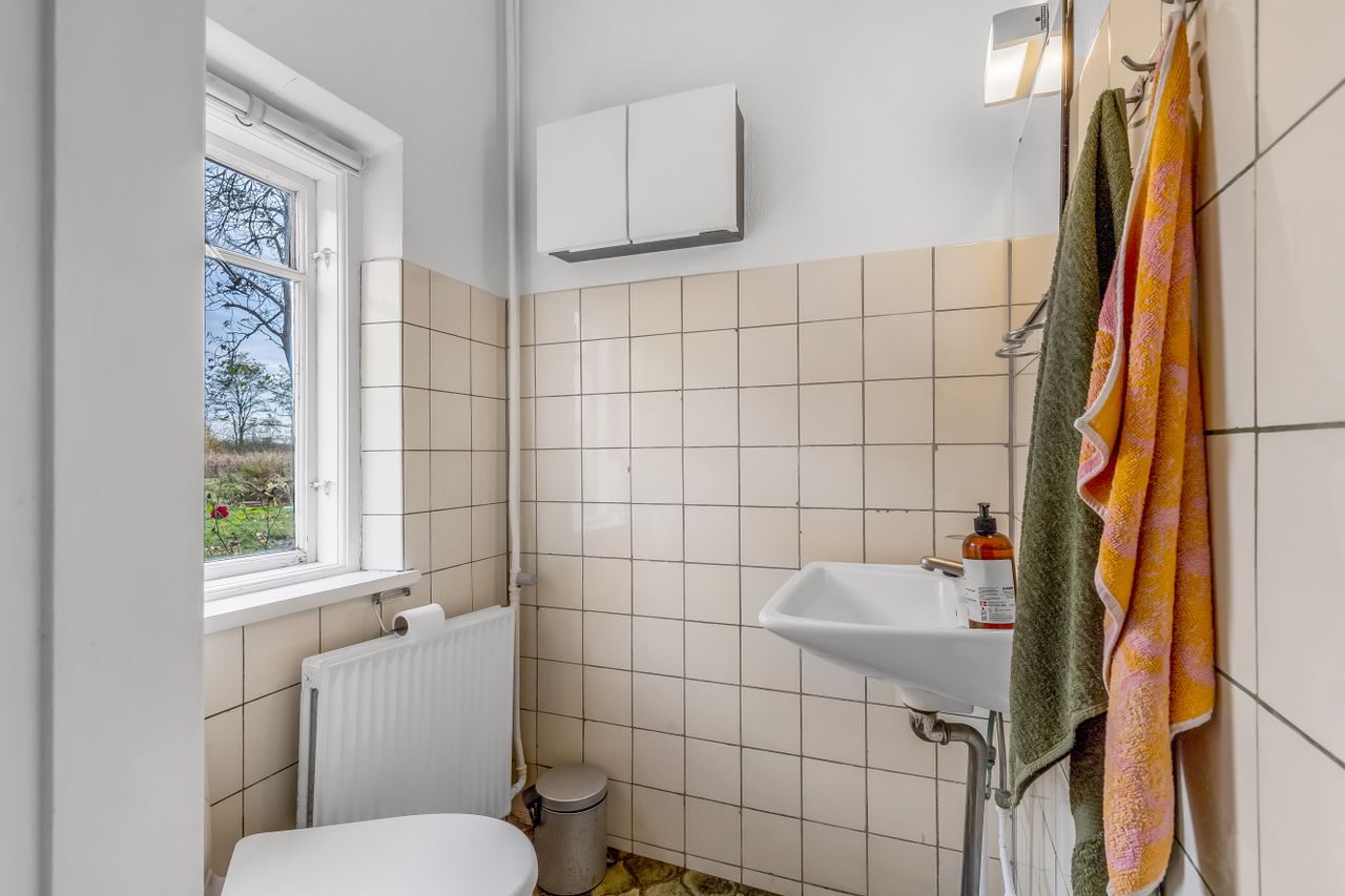 Et badeværelse med bruseniche og velholdt retroindretning, ovenlysvindue og god bordplads – så morgenerne kan glide lidt nemmere, når alle skal ud ad døren.