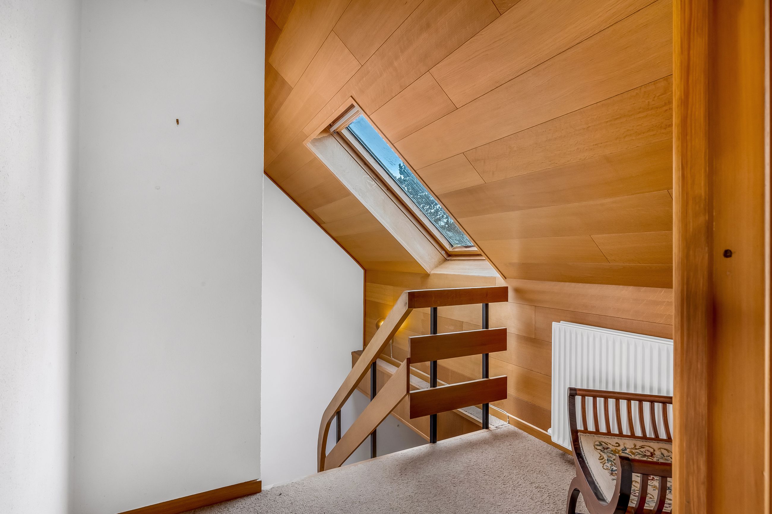 En stor, lys stue/opholdsrum i midten med skråvægge og brede vinduer mod haven – perfekt til legerum, TV-stue, gaming-hule eller fælles lounge, hvor børnene kan “have deres egen etage”.