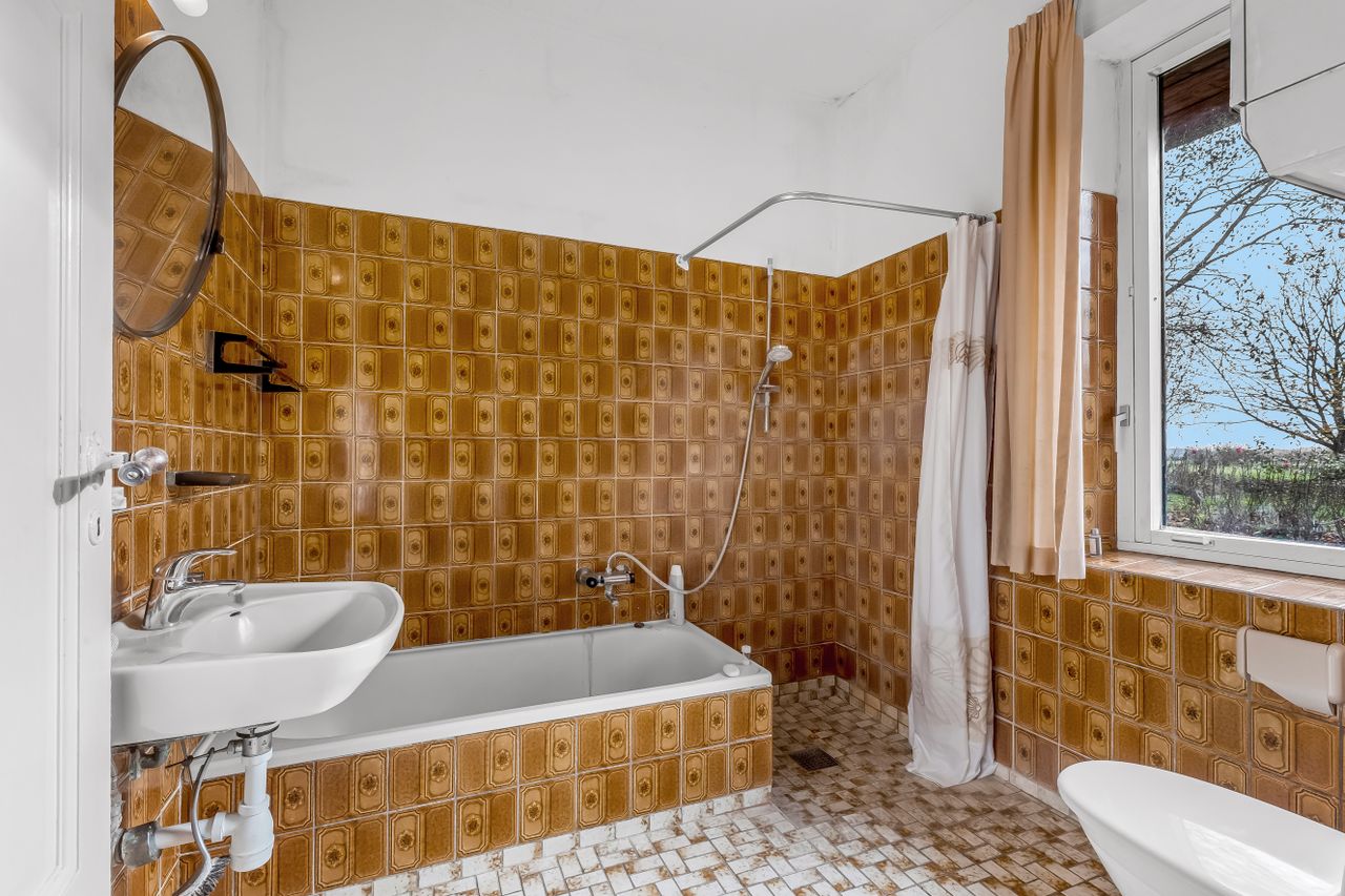 Badeværelse med badekar og originale retro-fliser, som enten kan blive jeres næste “before/after”-projekt – eller elskes for sin charmerende 70’er-stil.