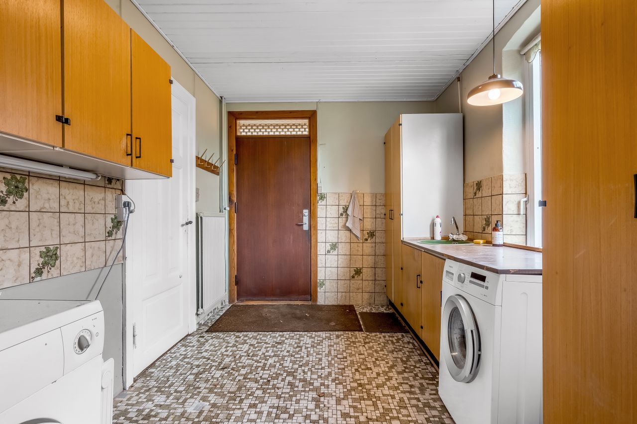 Praktisk bryggers/baggang med direkte udgang – perfekt til gummistøvler, sportstasker og hundepoter på våde dage.