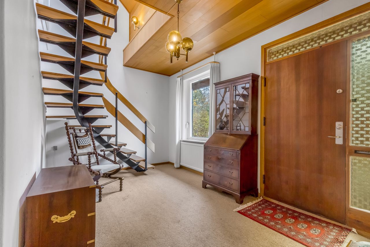 Indenfor mødes I af en højloftet entré med den karakteristiske svungne trappe til 1. sal – en entré, der føles som et rum i sig selv og sætter stemningen med det samme.