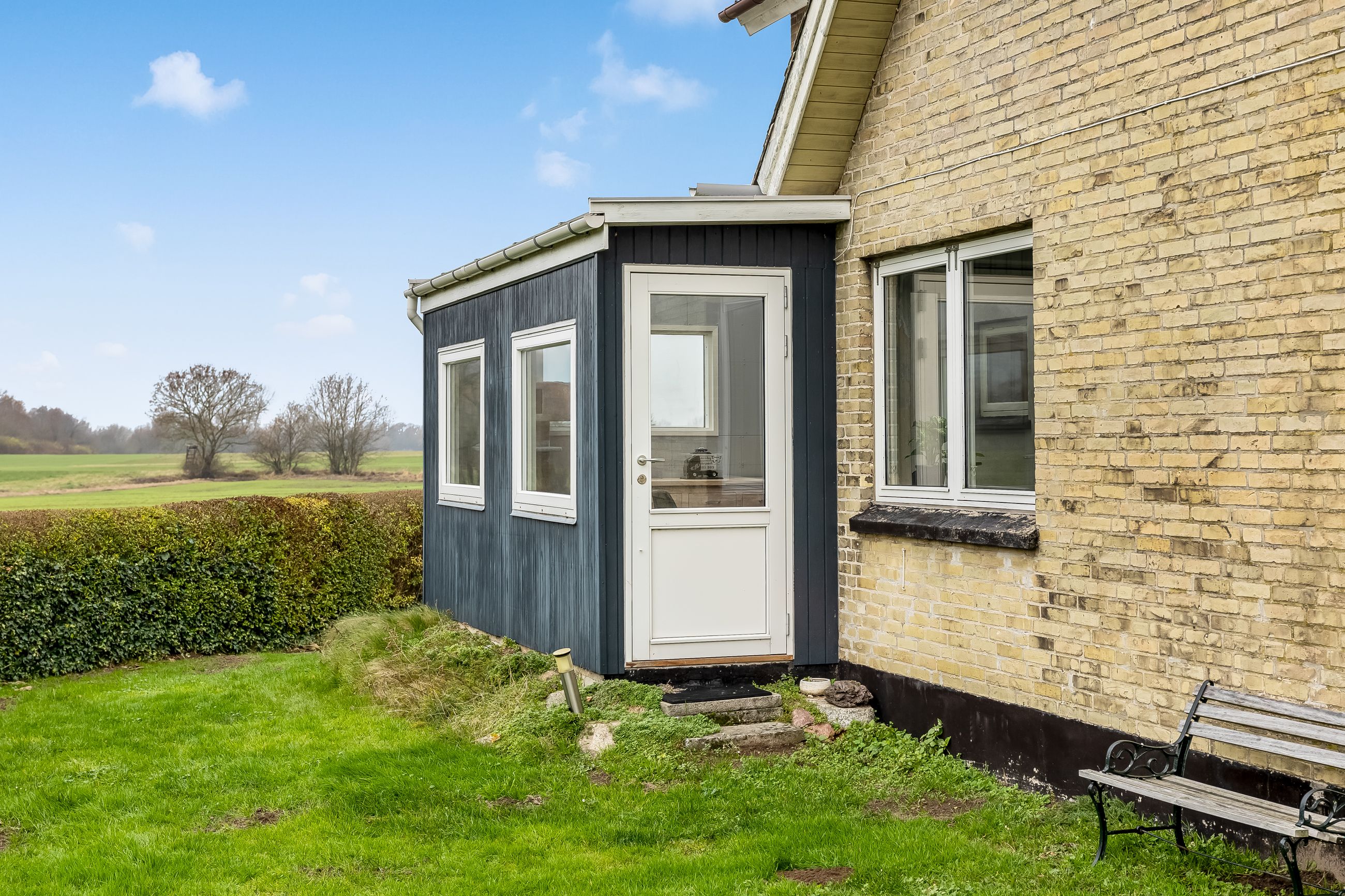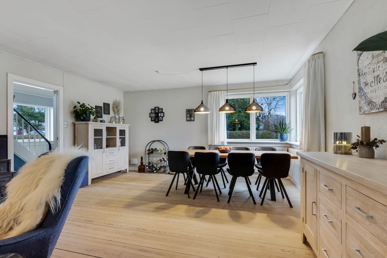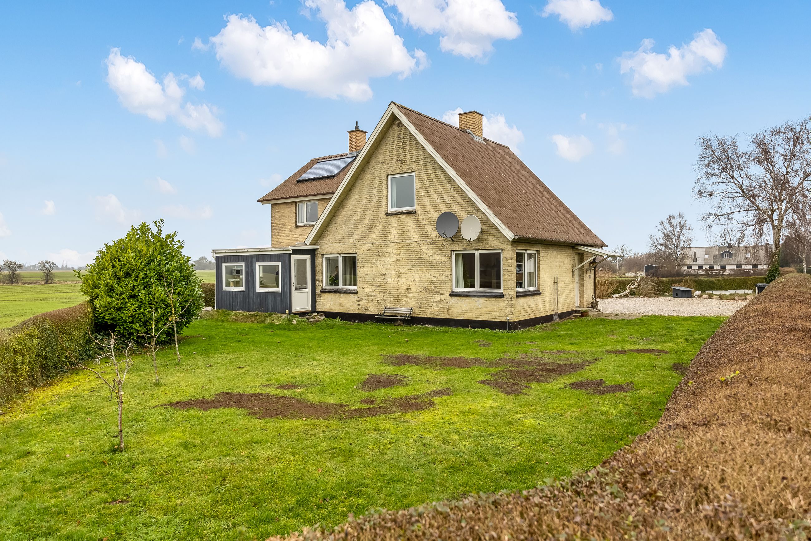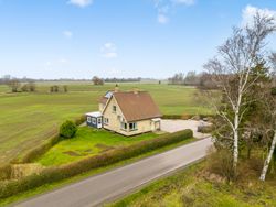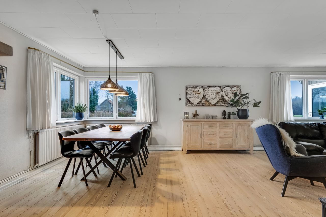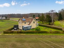 Boligen rummer ca. 134 m2 og opleves lys og imødekommende. I stueplan bliver du mødt af en entré/hall med trappe til førstesalen og videre adgang til et moderniseret køkken med god bordplads og lille spiseplads, hvor man nemt samles til dagens hurtige måltider. Herfra er der adgang til et rummeligt bryggers med vaskefaciliteter og masser af plads til hverdagens praktiske opbevaring. Husets hjerte er den store stue, hvor der både er plads til langt spisebord og stor sofagruppe, og hvor de store vinduer trækker udsigten til markerne helt ind i rummet. Den hyggelige brændeovn sørger for ekstra varme og stemning i de kølige måneder. I stueplan findes desuden et badeværelse med badekar og de originale, charmerende blå fliser samt adgang til et fyrrum. Fra stuen er der udgang til en dejlig, lys udestue på omkring 18 m2, som nærmest fungerer som et ekstra opholdsrum det meste af året og giver første parket til naturen udenfor.
