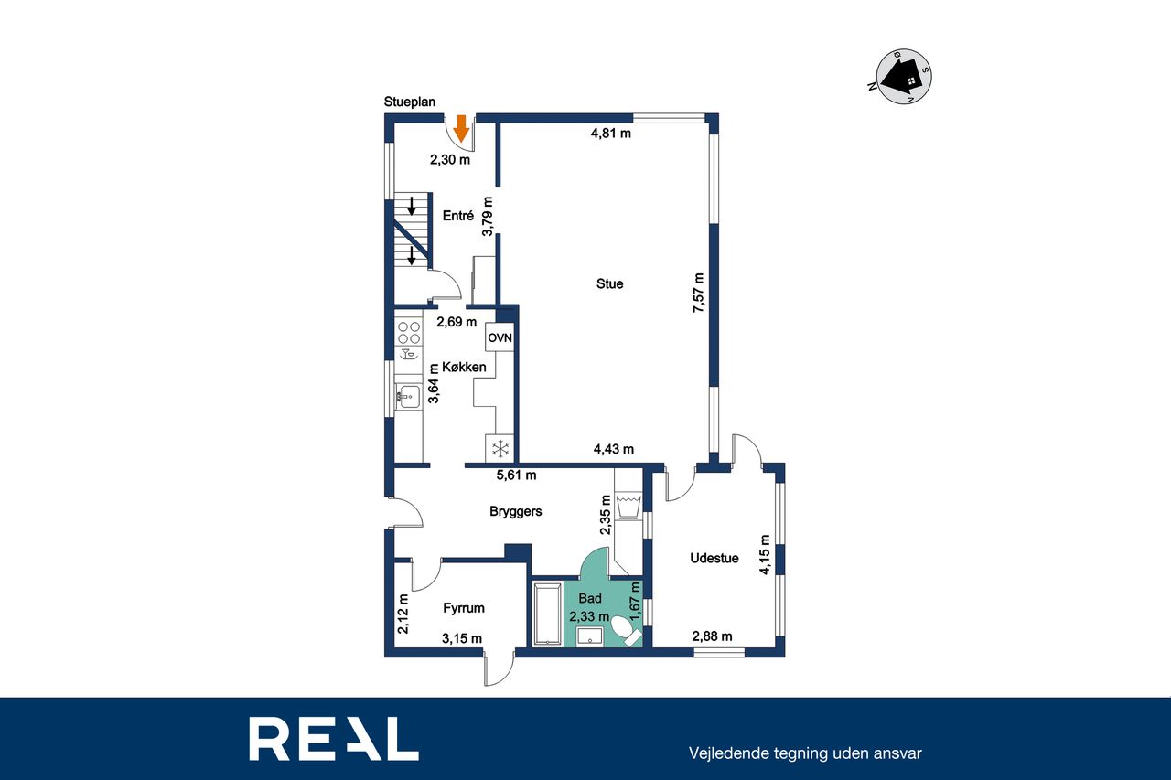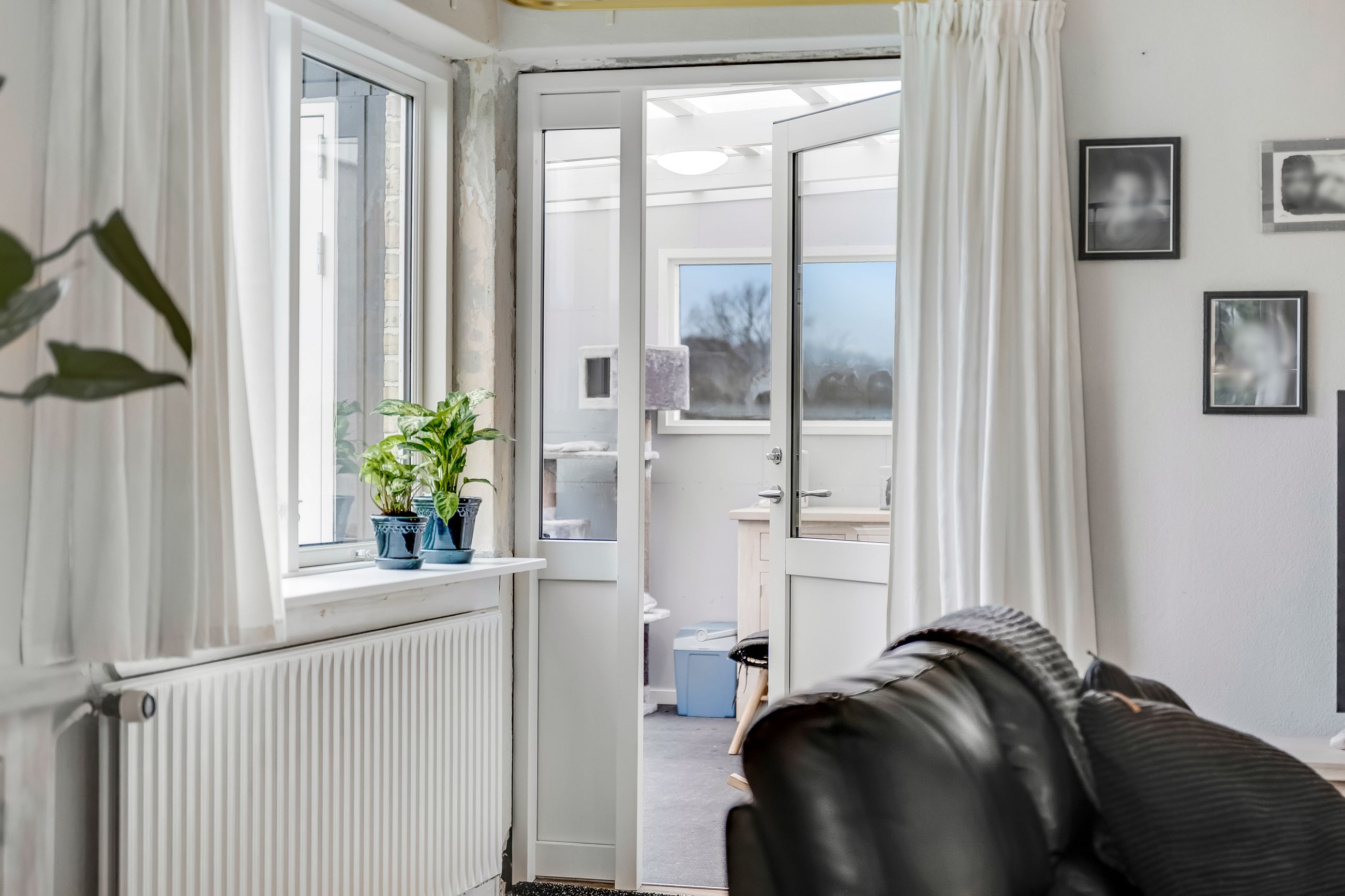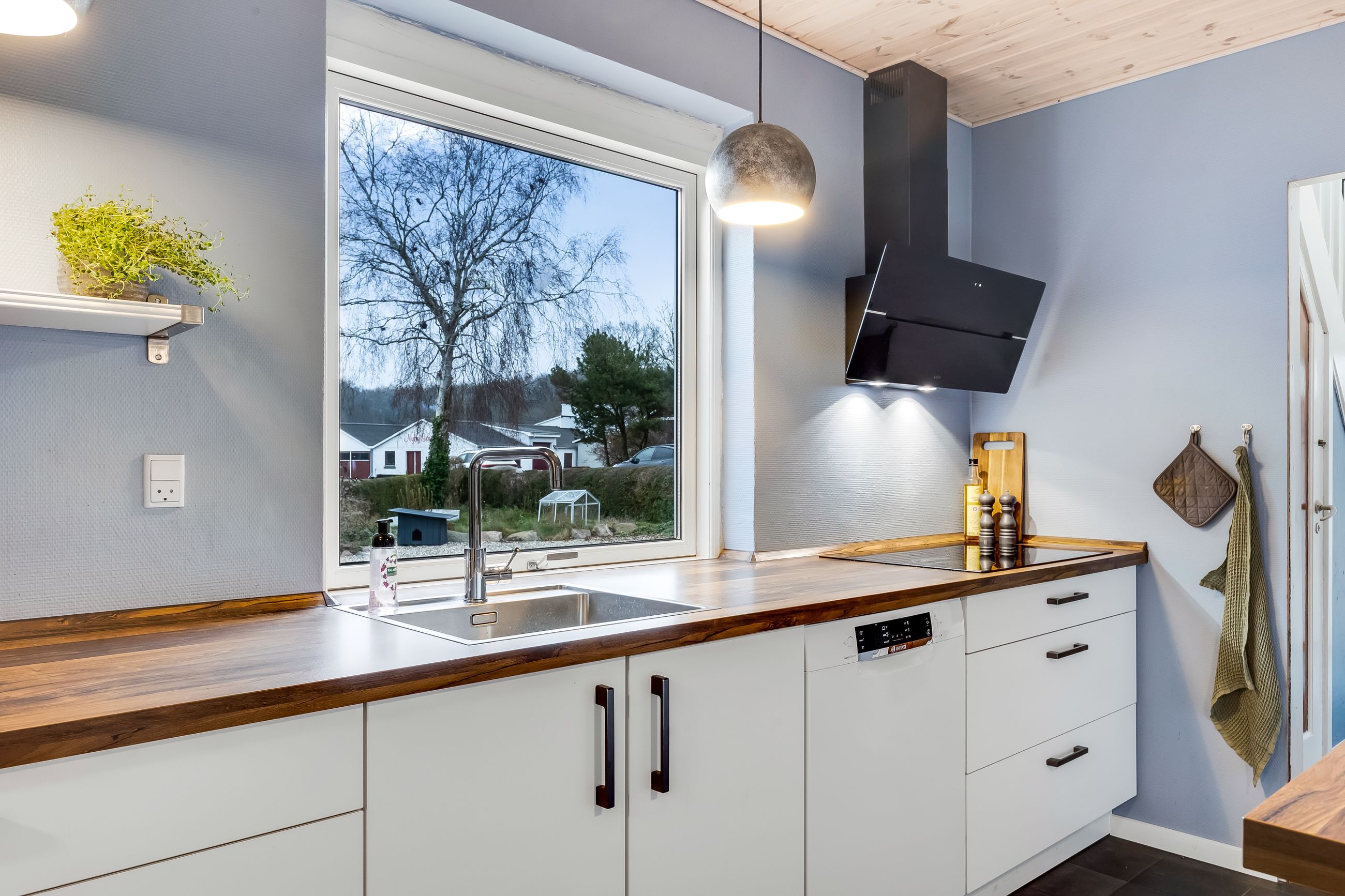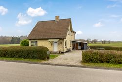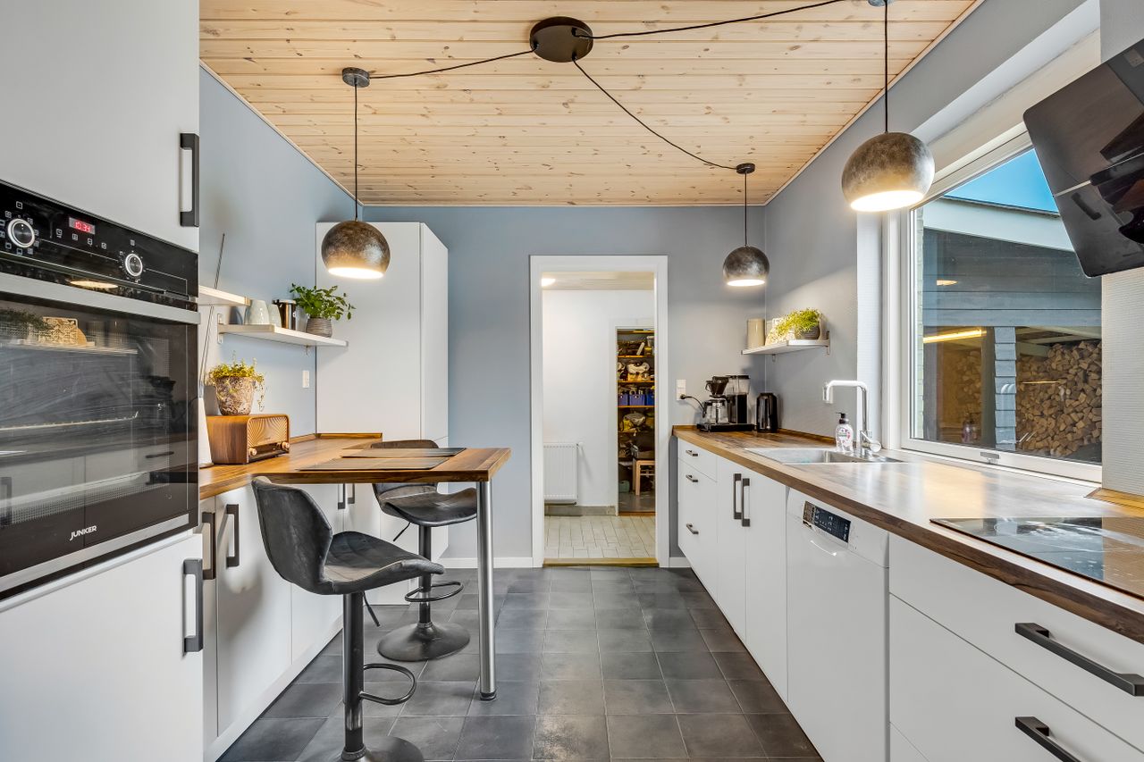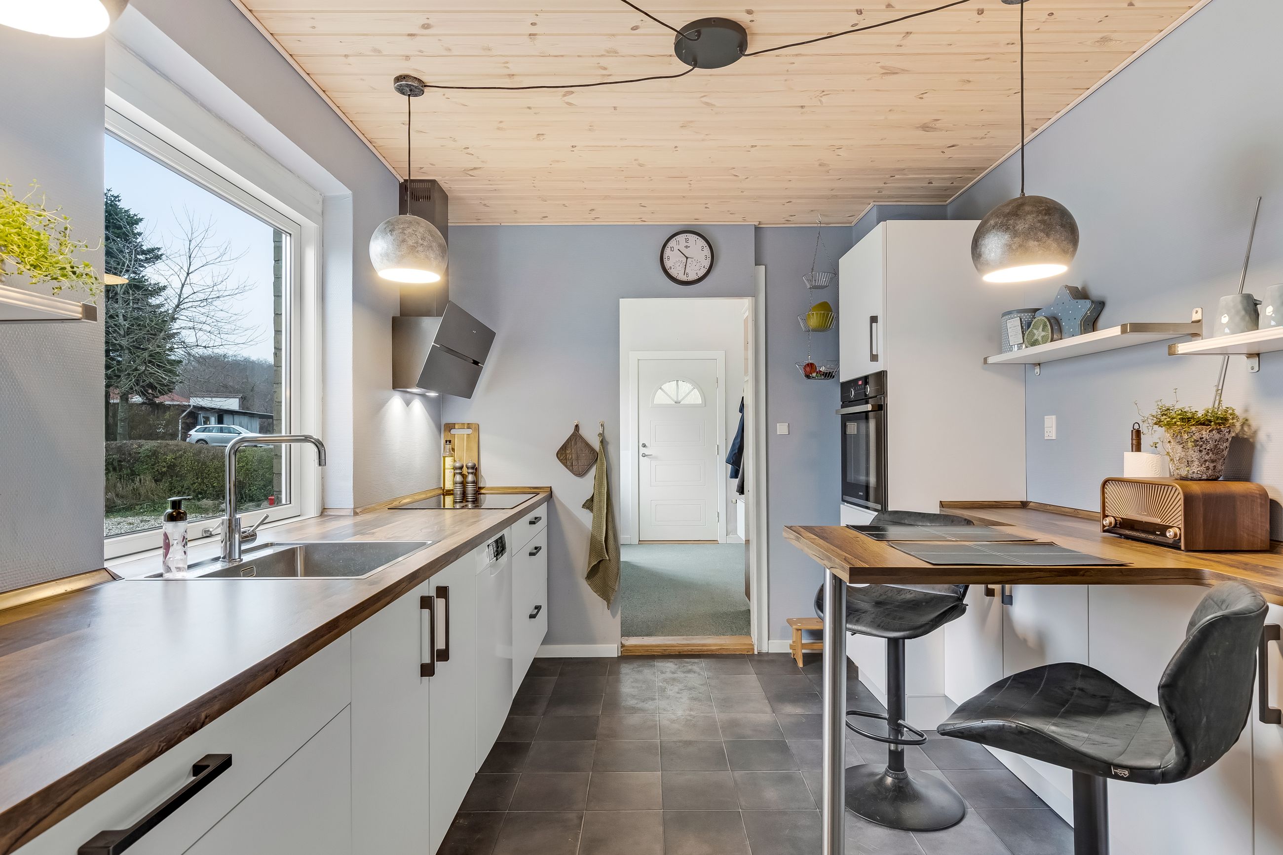 Boligen rummer ca. 134 m2 og opleves lys og imødekommende. I stueplan bliver du mødt af en entré/hall med trappe til førstesalen og videre adgang til et moderniseret køkken med god bordplads og lille spiseplads, hvor man nemt samles til dagens hurtige måltider. Herfra er der adgang til et rummeligt bryggers med vaskefaciliteter og masser af plads til hverdagens praktiske opbevaring. Husets hjerte er den store stue, hvor der både er plads til langt spisebord og stor sofagruppe, og hvor de store vinduer trækker udsigten til markerne helt ind i rummet. Den hyggelige brændeovn sørger for ekstra varme og stemning i de kølige måneder. I stueplan findes desuden et badeværelse med badekar og de originale, charmerende blå fliser samt adgang til et fyrrum. Fra stuen er der udgang til en dejlig, lys udestue på omkring 18 m2, som nærmest fungerer som et ekstra opholdsrum det meste af året og giver første parket til naturen udenfor.