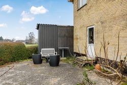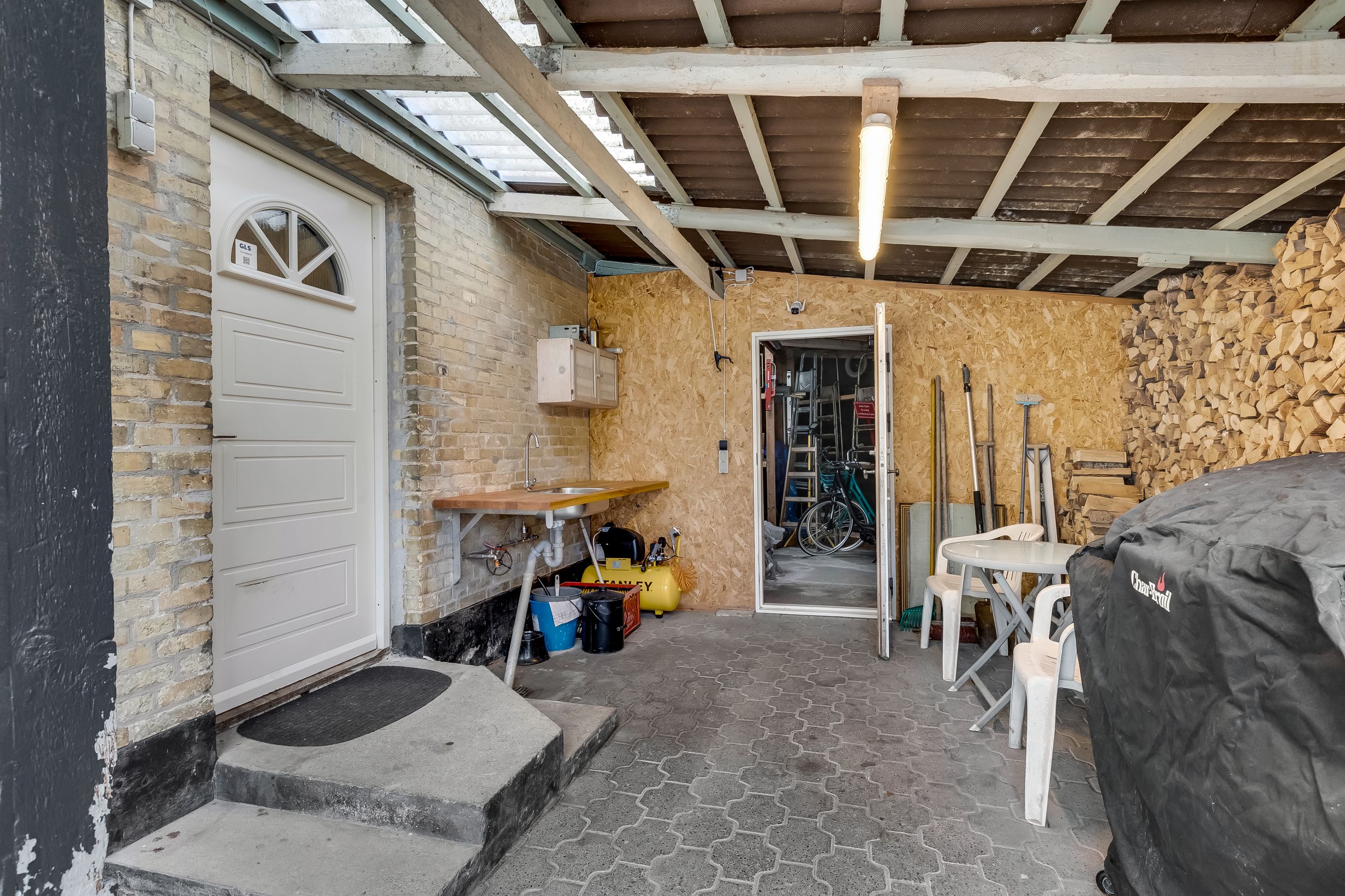 Udenfor er grunden anlagt enkelt med græs og hæk, så haven er nem at passe, og foran huset er der rigelig plads til parkering til biler, trailer og måske en campingvogn. Et udhus på ca. 27 m2 samt overdækning giver yderligere plads til brænde, cykler og haveredskaber.