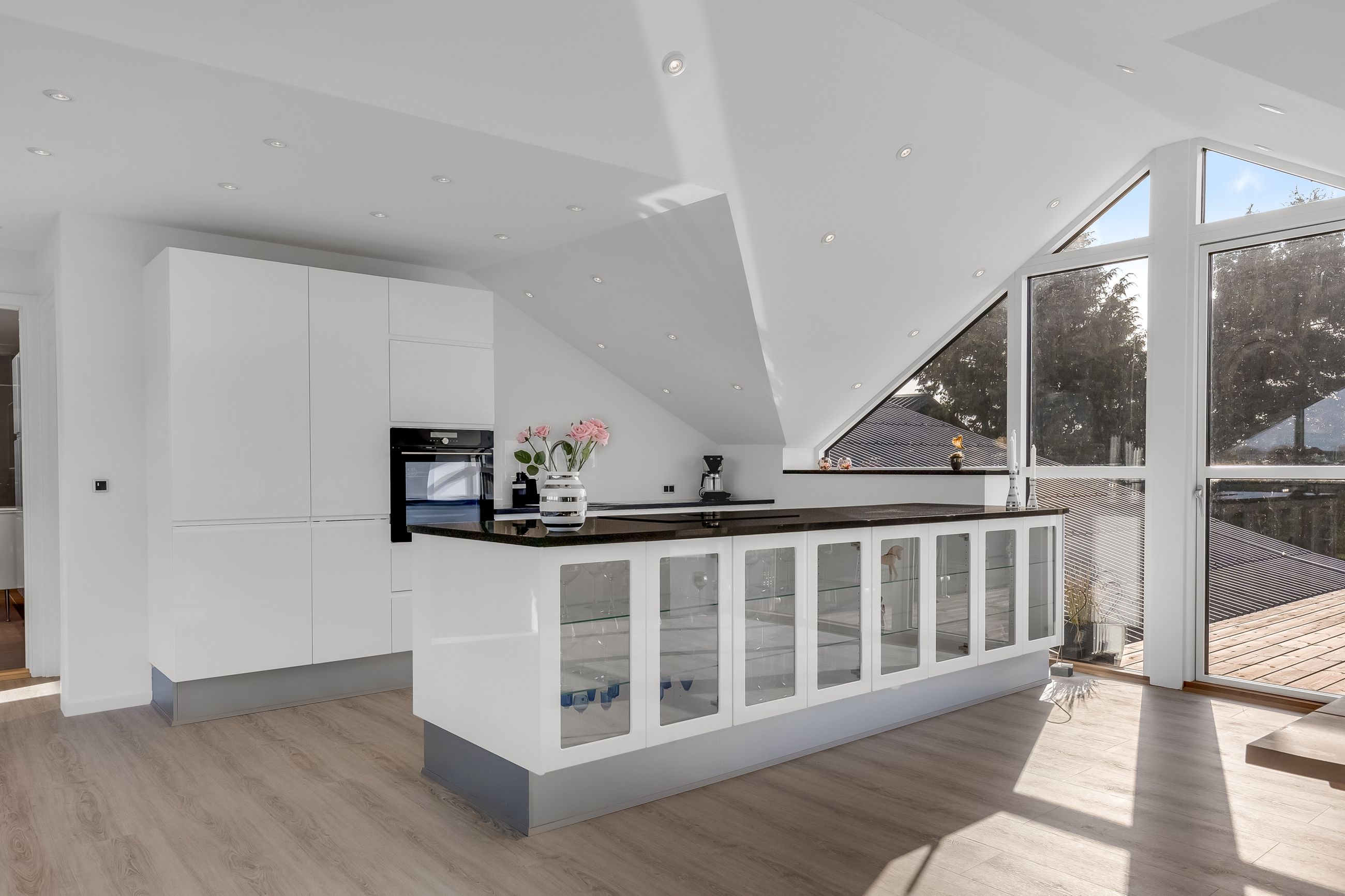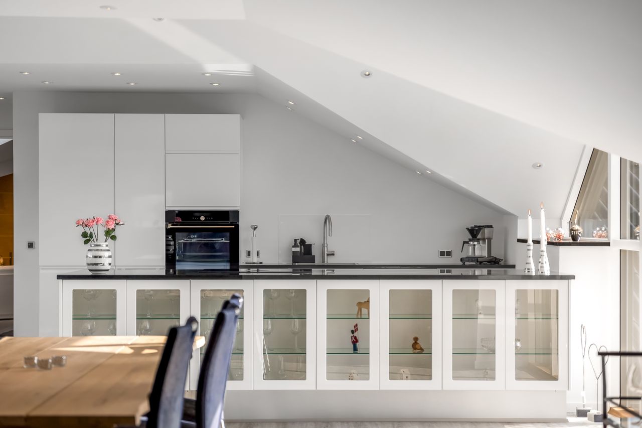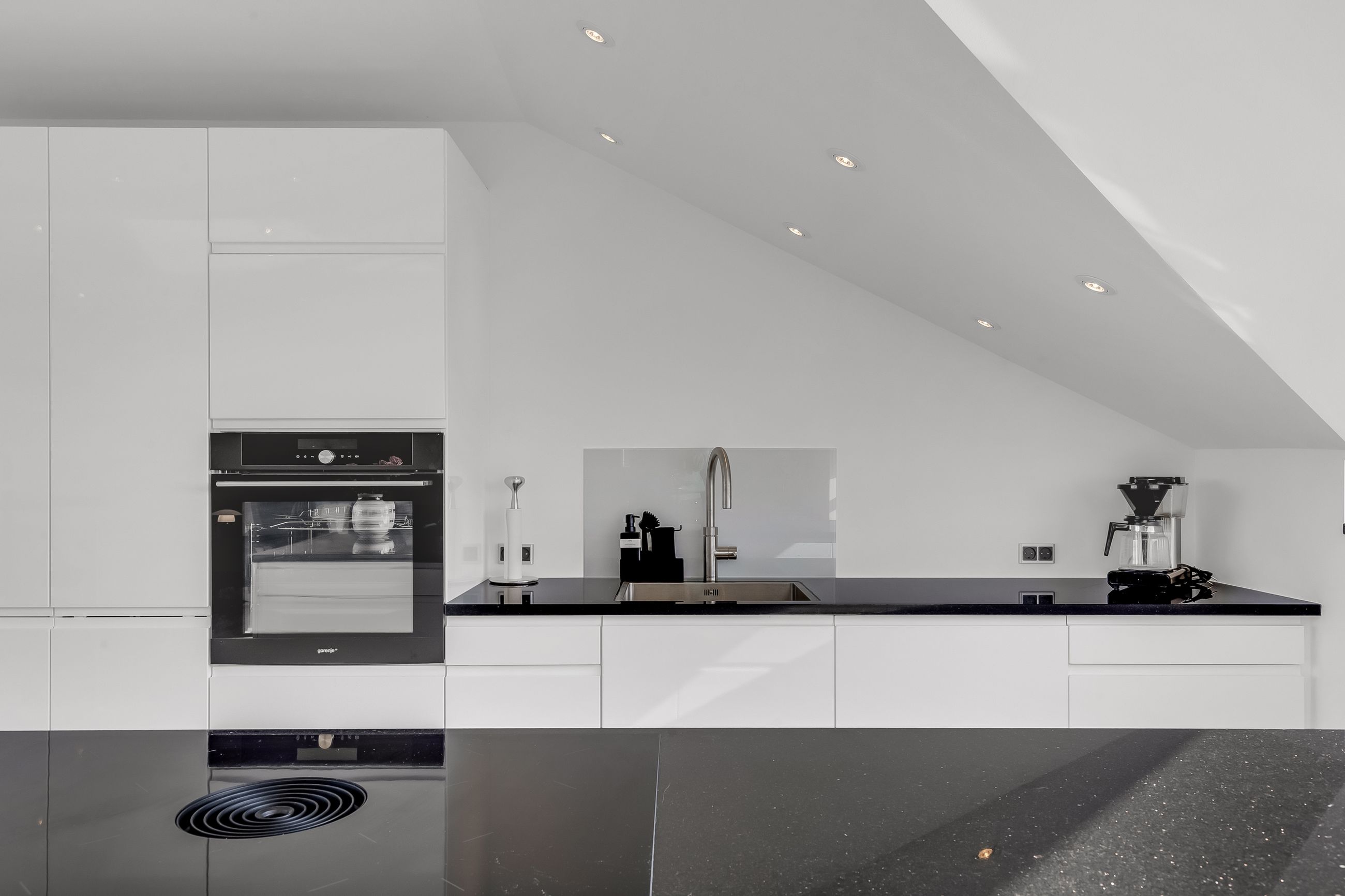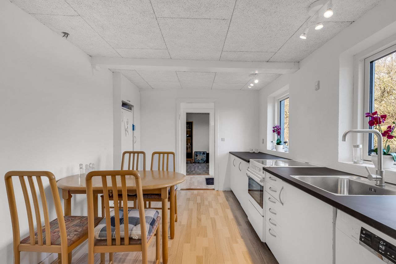 Køkkenet ligger i åben forbindelse med alrum og stue og danner et naturligt samlingspunkt i hjemmet – et rum hvor hverdagen leves og gæster samles. Forældresoveværelset med walk-in samt badeværelset med både bruseniche og hjørnebadekar skaber en følelse af privat oase. Alt er lavet i absolut topklasse håndværk og materialer.