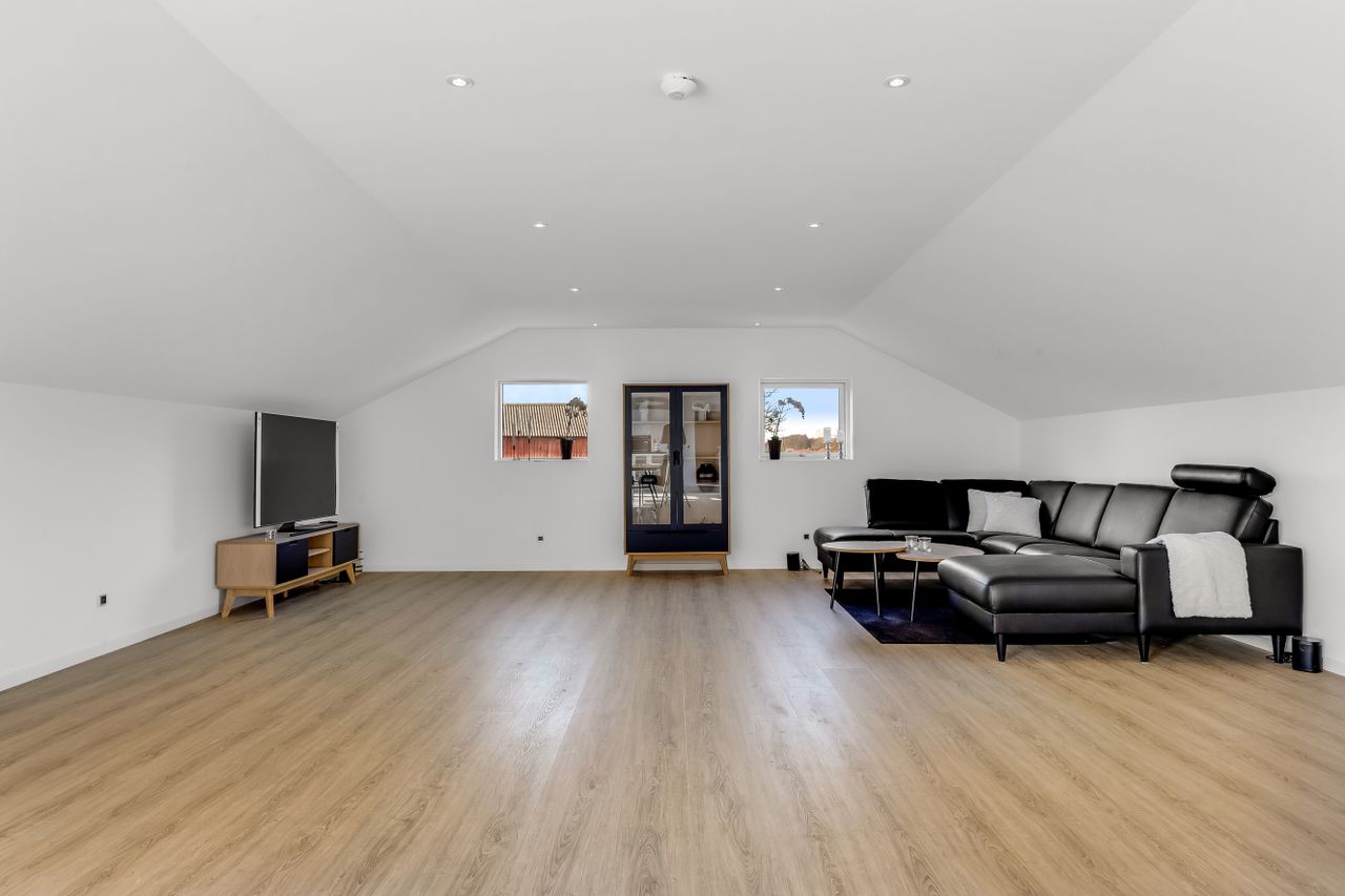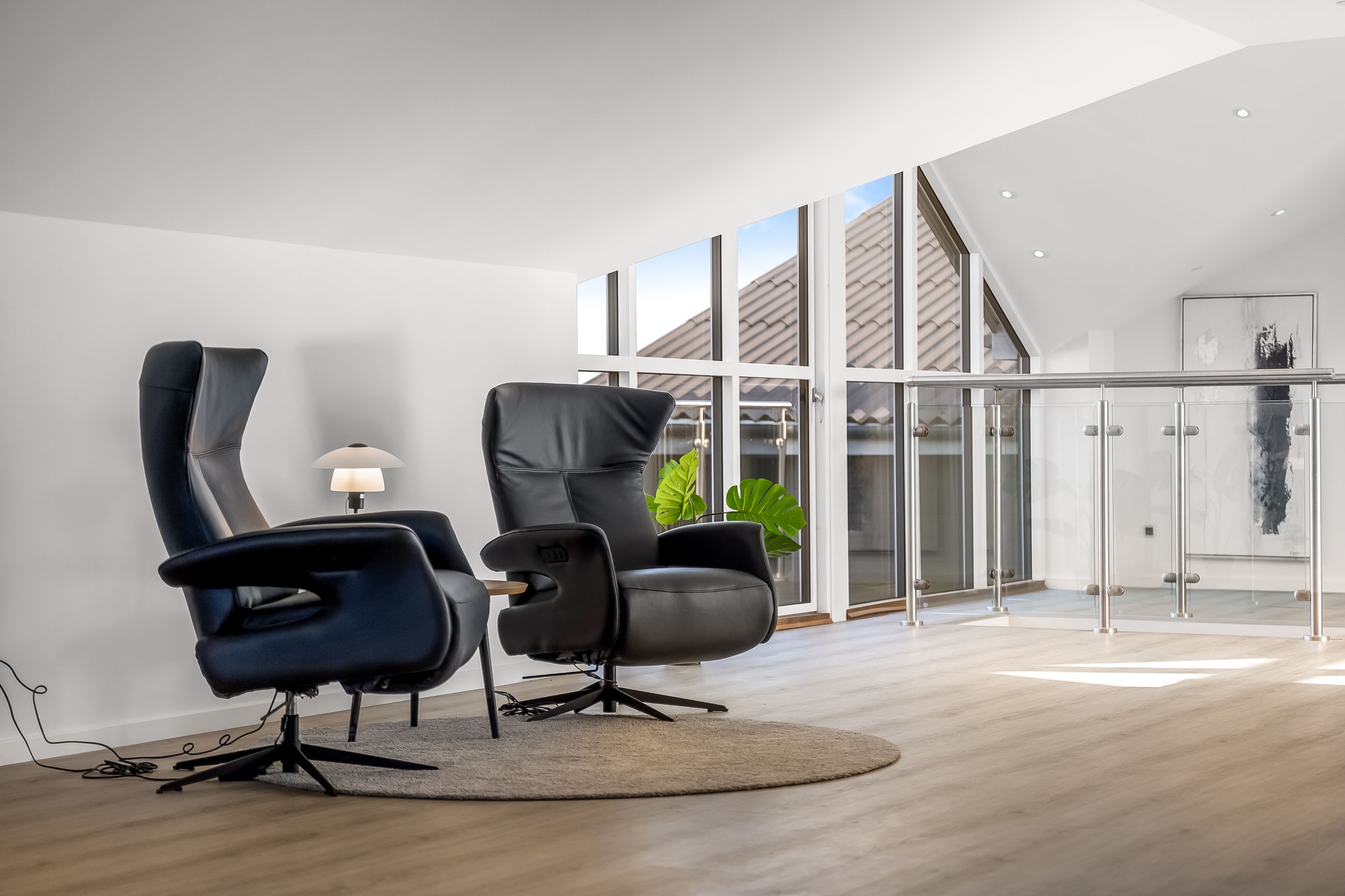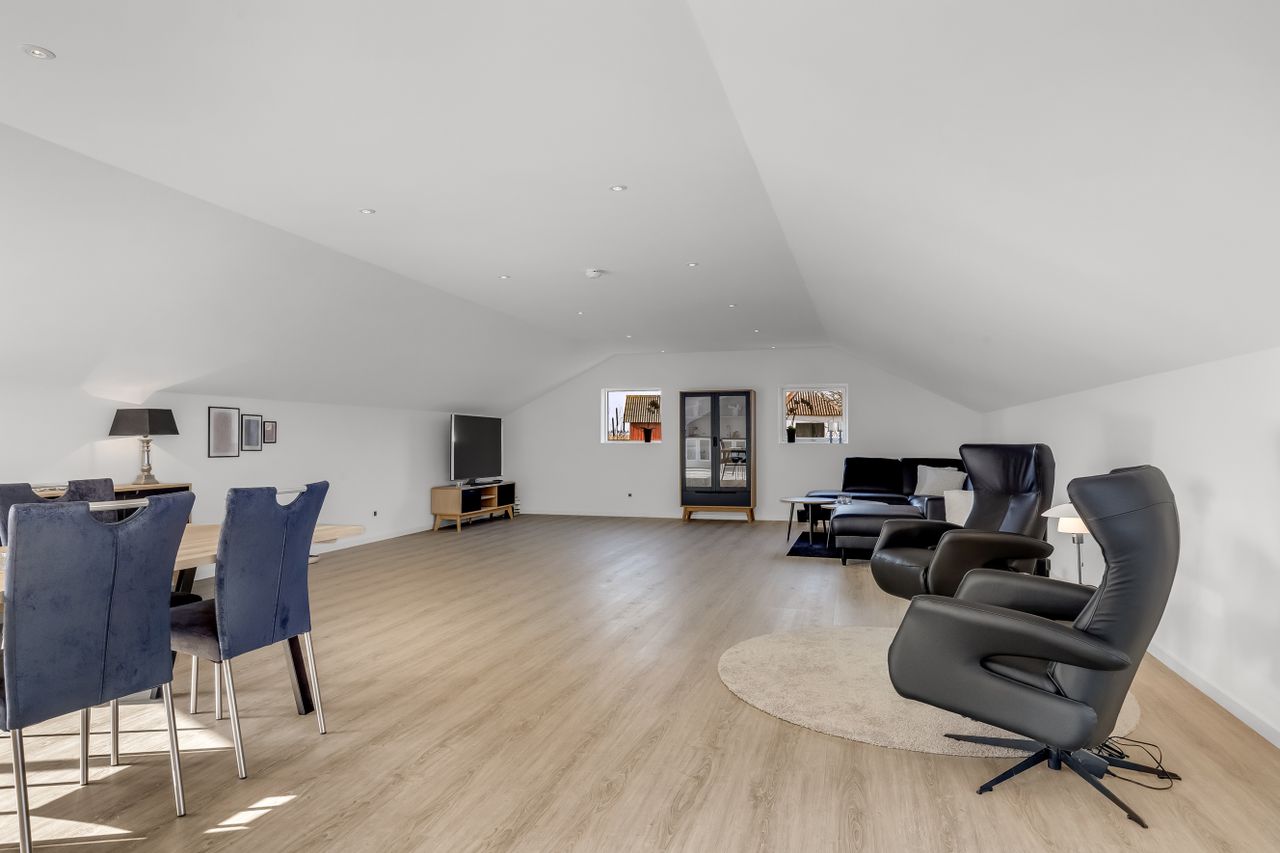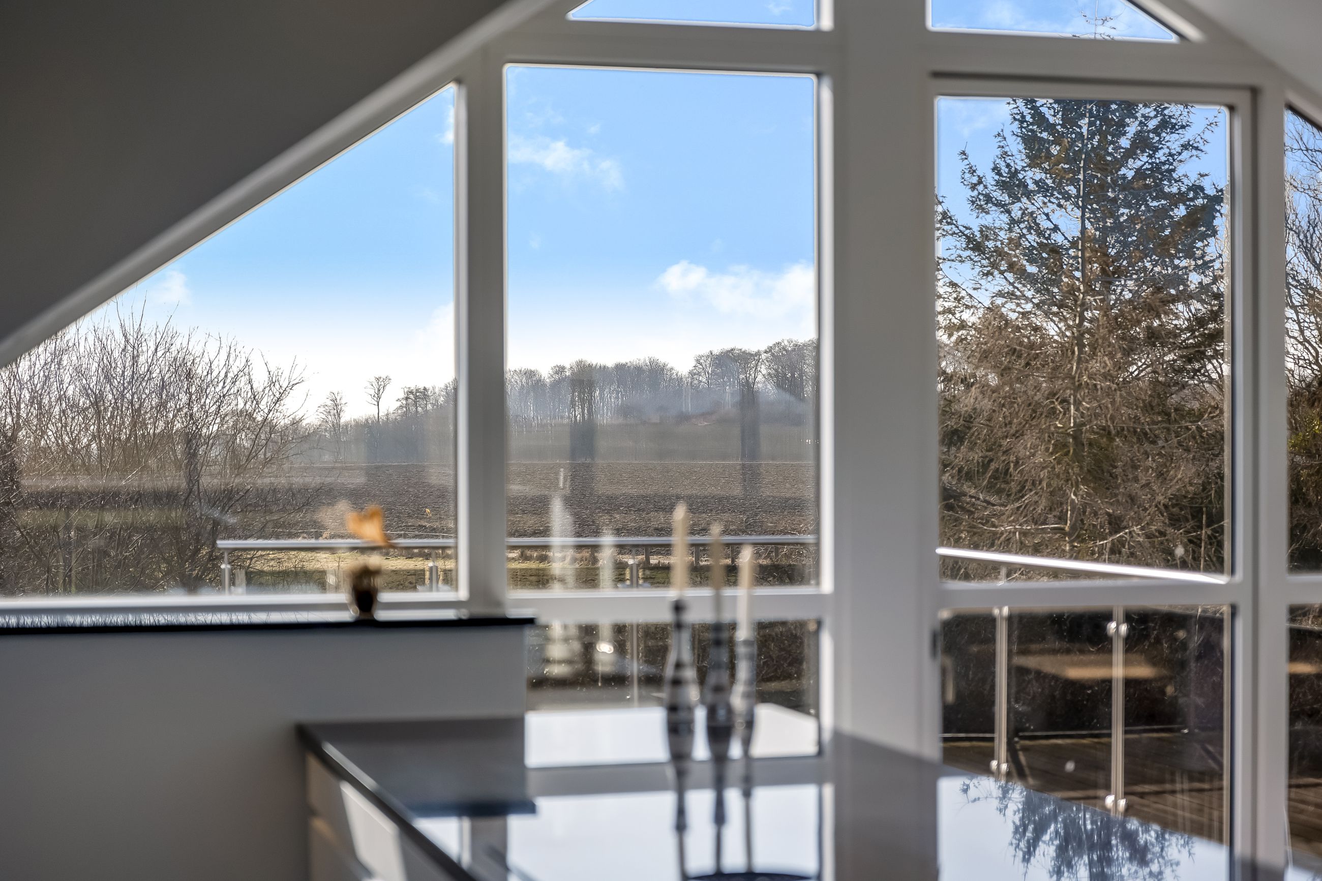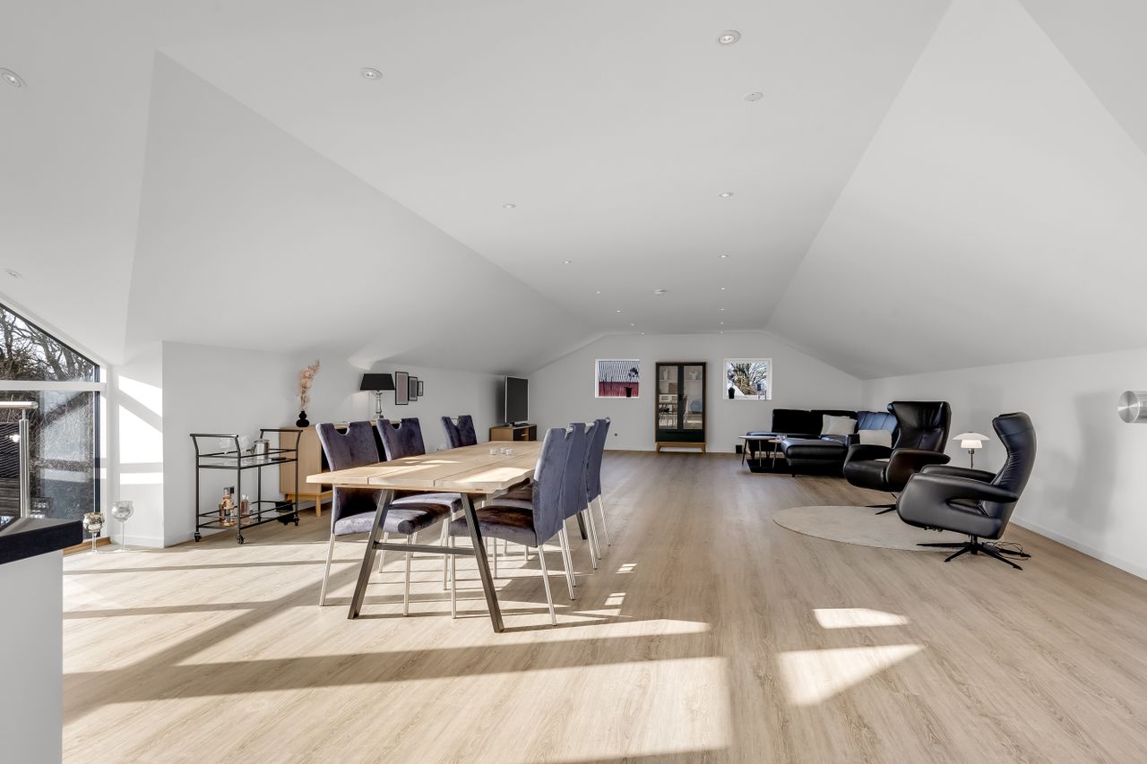 På førstesalen åbner boligen sig i lys og volumen med loft til kip og store vinduespartier, hvor naturen udenfor bliver en naturlig del af indretningen. Herfra er der udgang til både altan og tagterrasse, hvor udsigten over det åbne landskab kan nydes i rolige omgivelser.