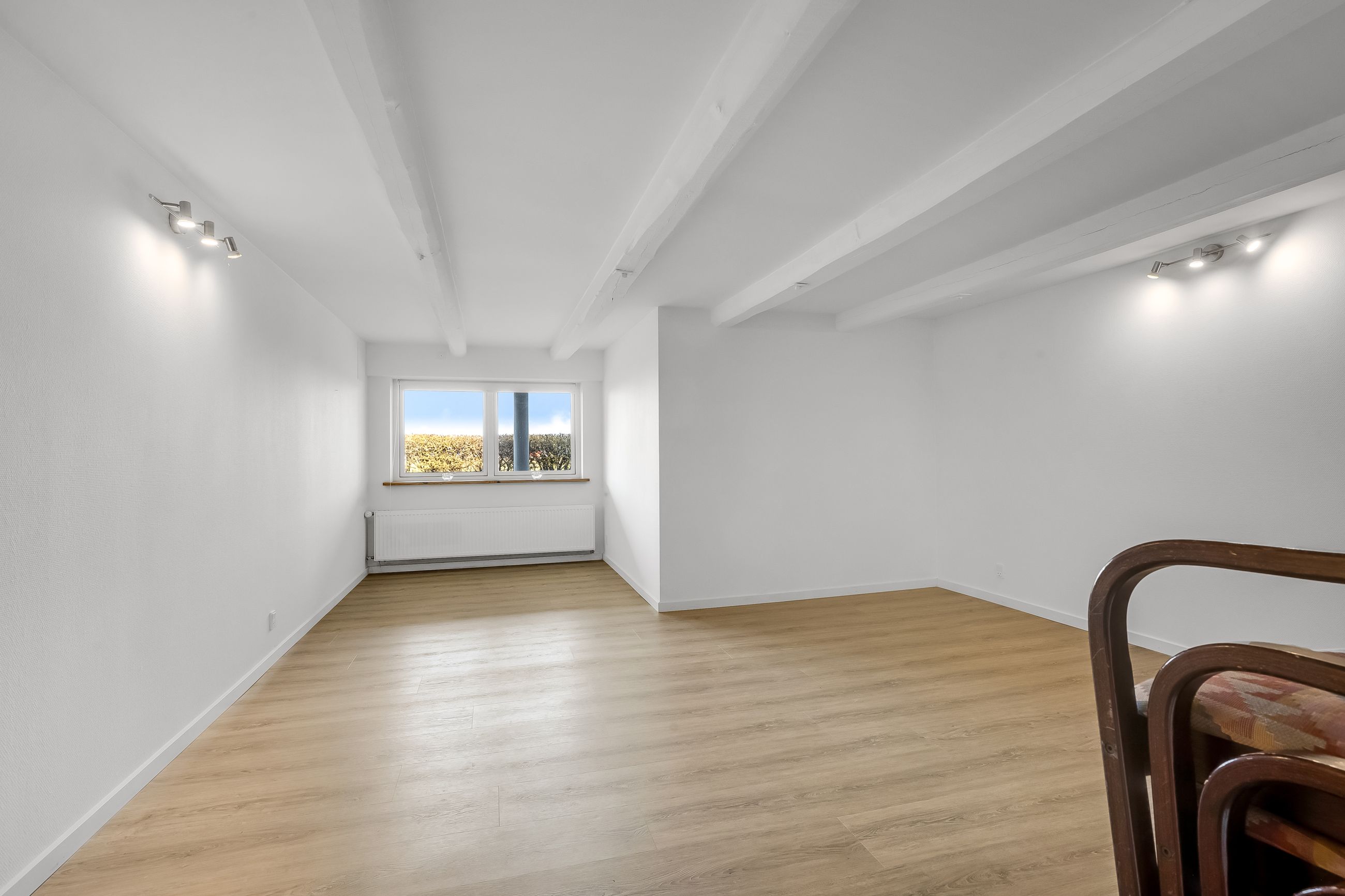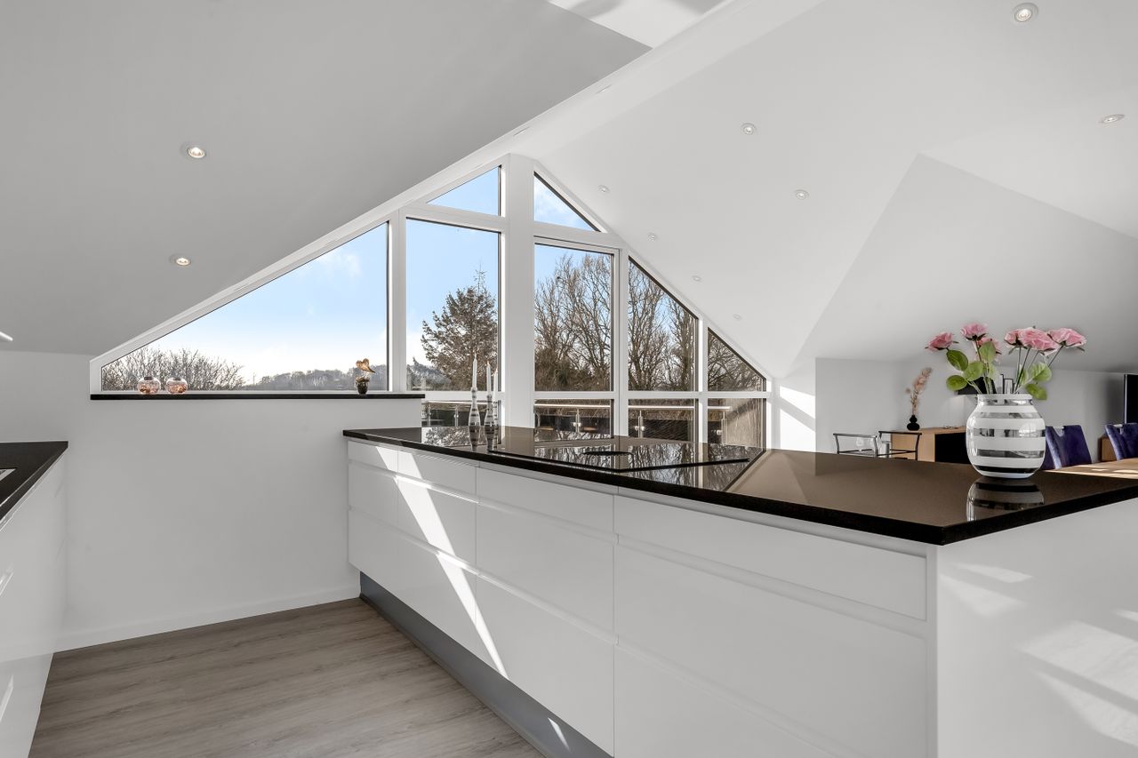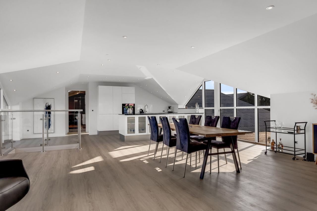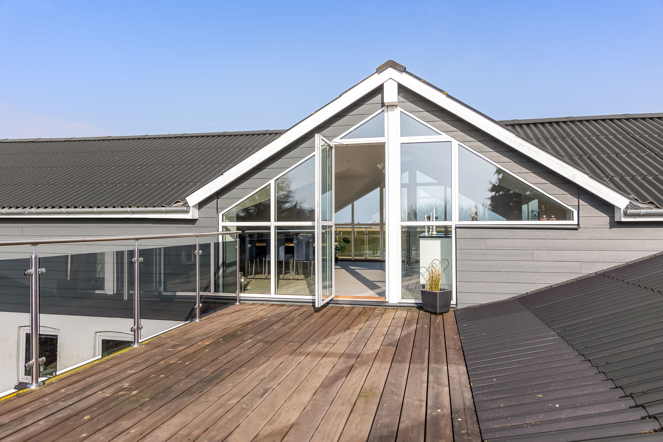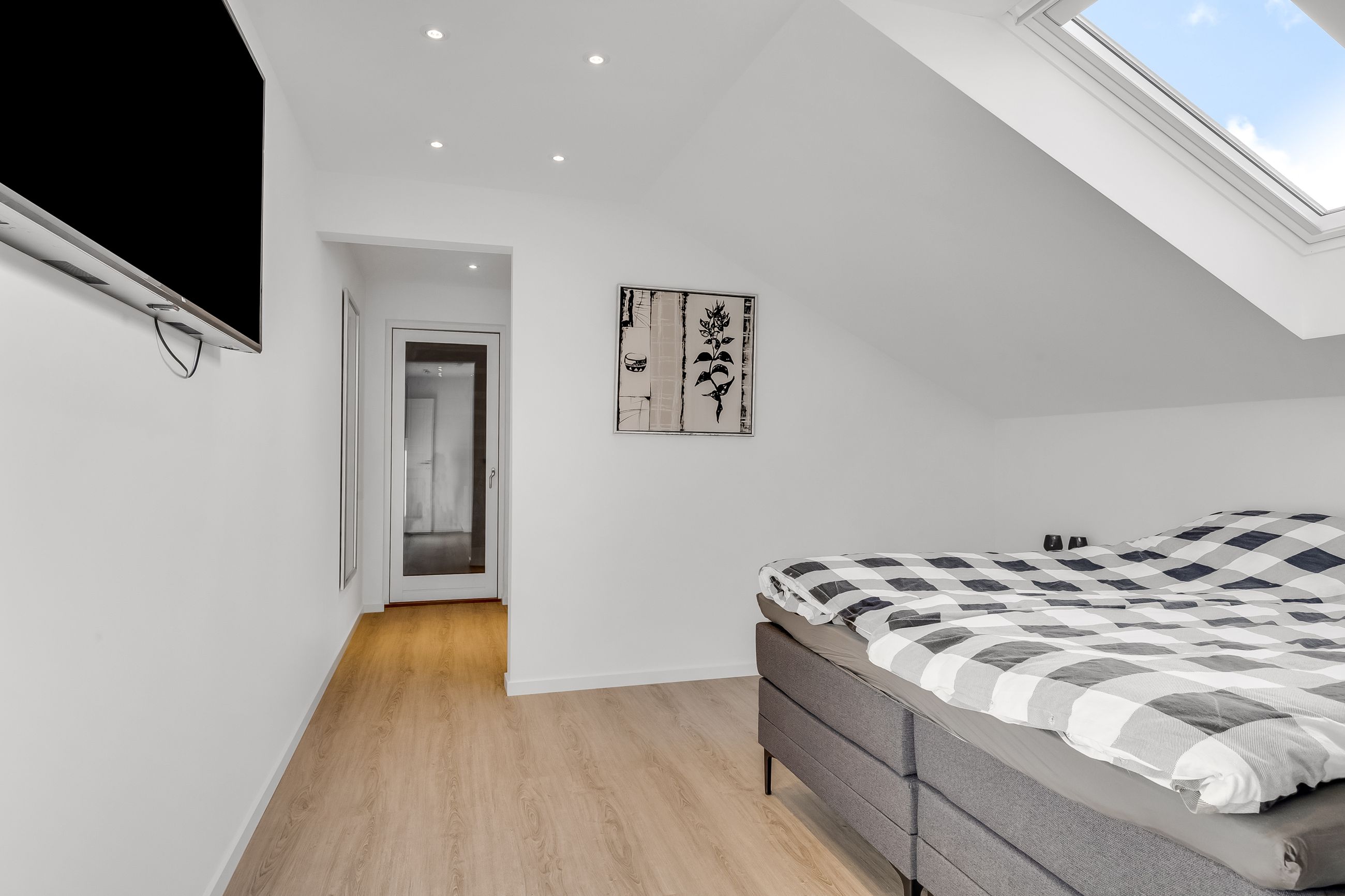 På førstesalen åbner boligen sig i lys og volumen med loft til kip og store vinduespartier, hvor naturen udenfor bliver en naturlig del af indretningen. Herfra er der udgang til både altan og tagterrasse, hvor udsigten over det åbne landskab kan nydes i rolige omgivelser.