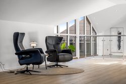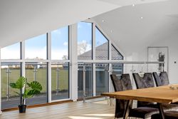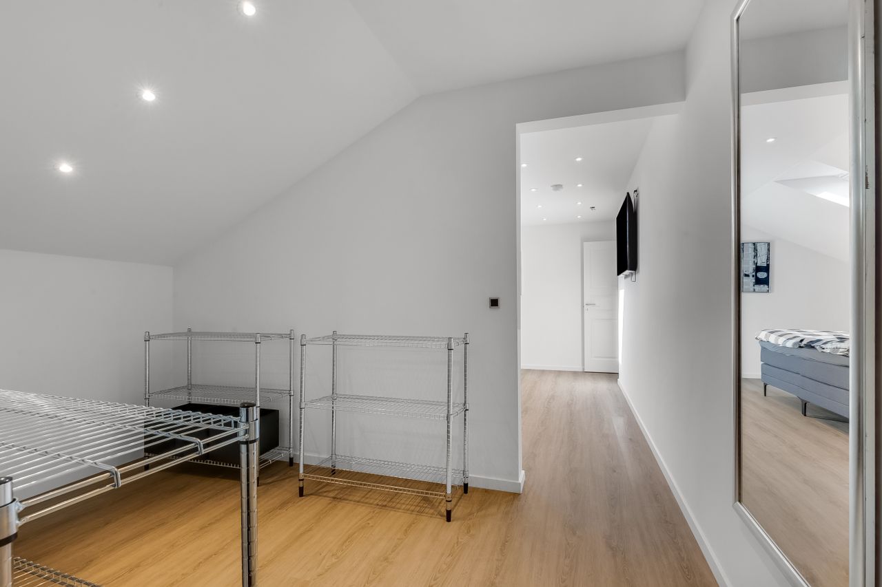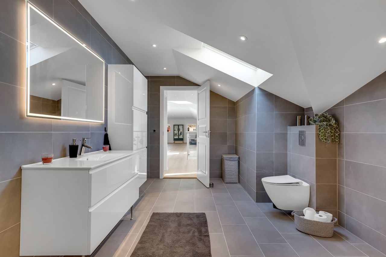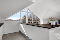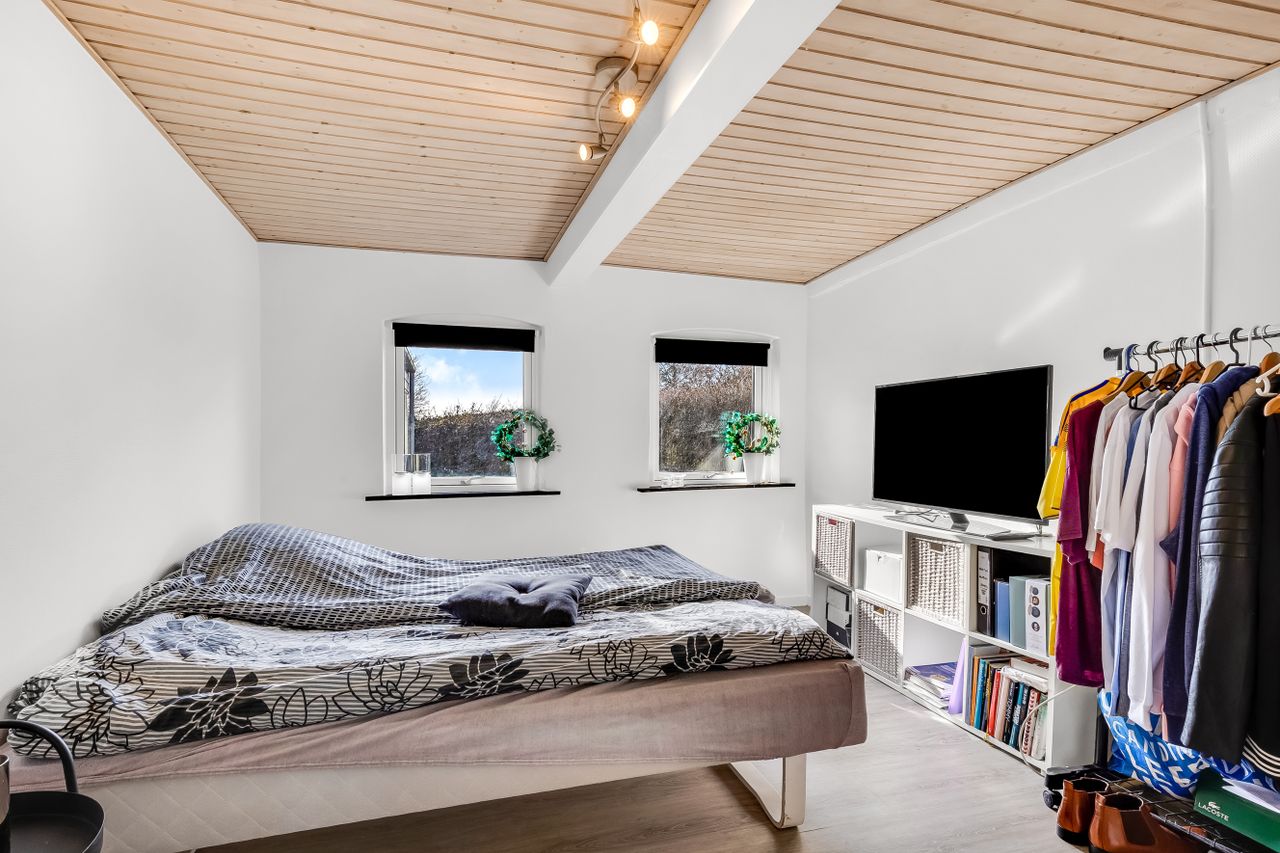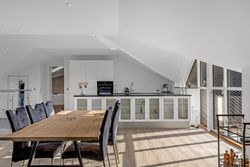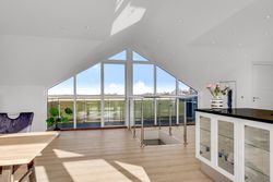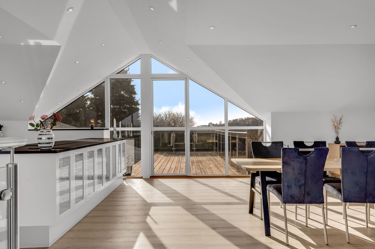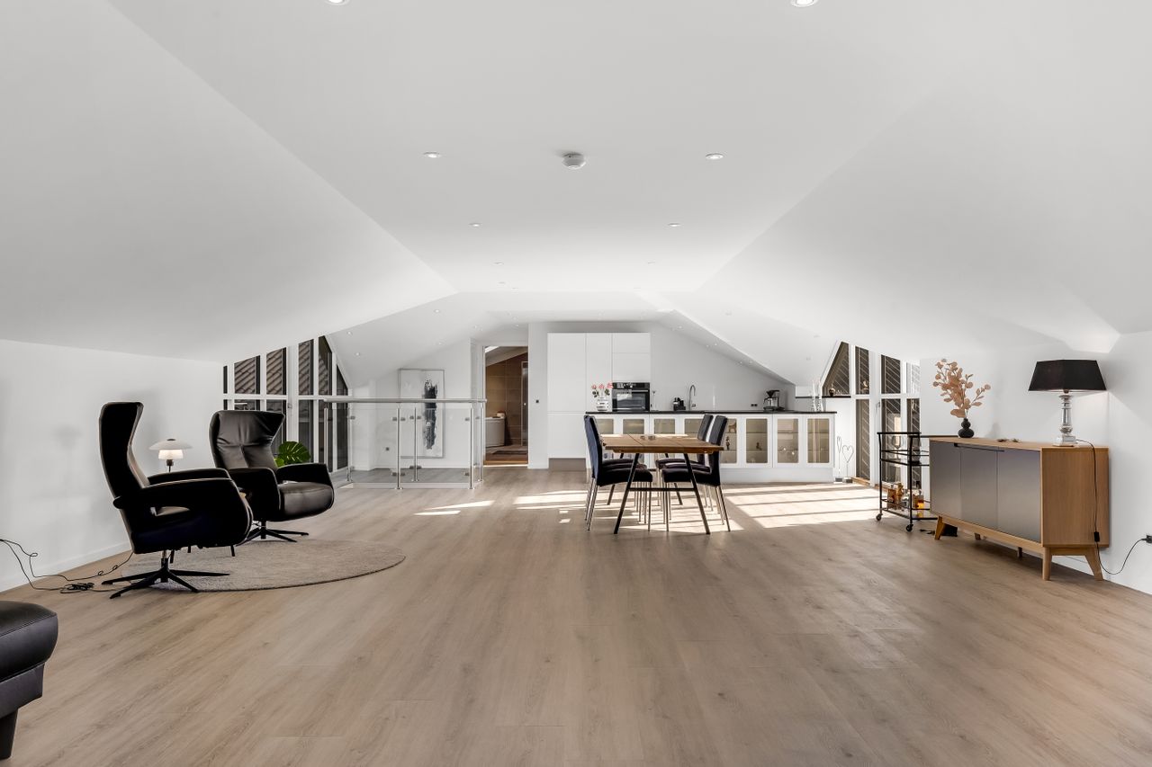 På førstesalen åbner boligen sig i lys og volumen med loft til kip og store vinduespartier, hvor naturen udenfor bliver en naturlig del af indretningen. Herfra er der udgang til både altan og tagterrasse, hvor udsigten over det åbne landskab kan nydes i rolige omgivelser.