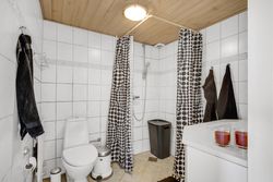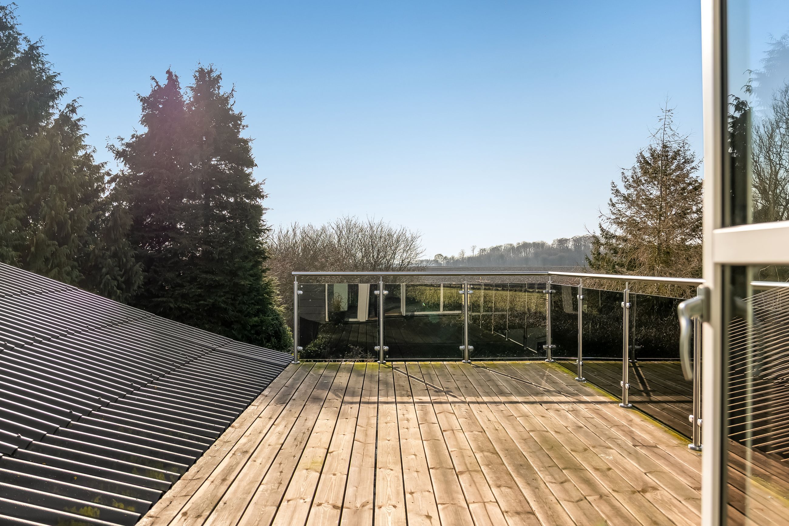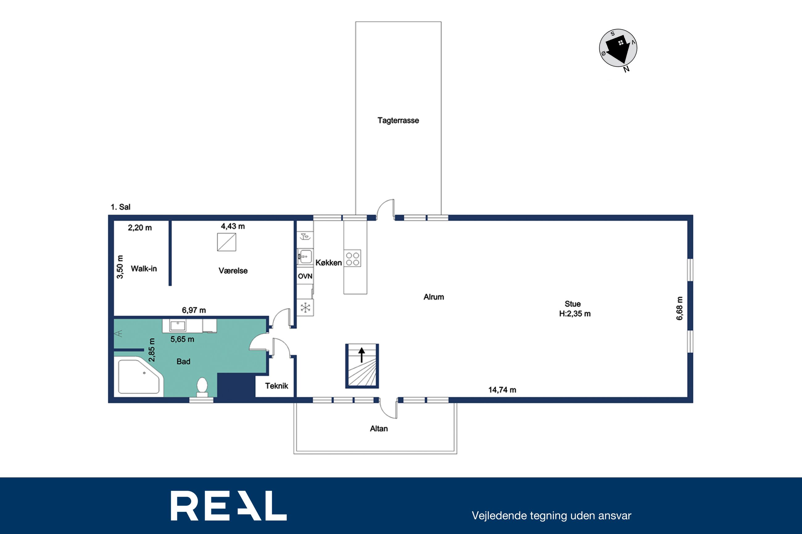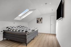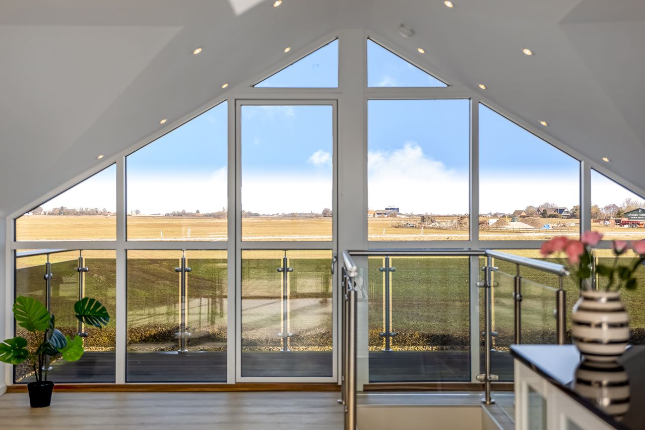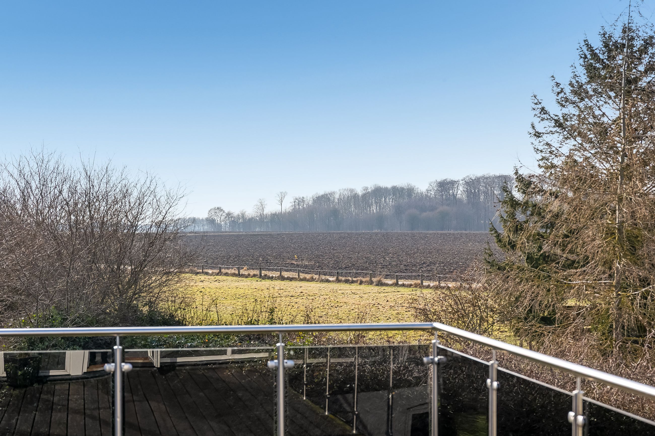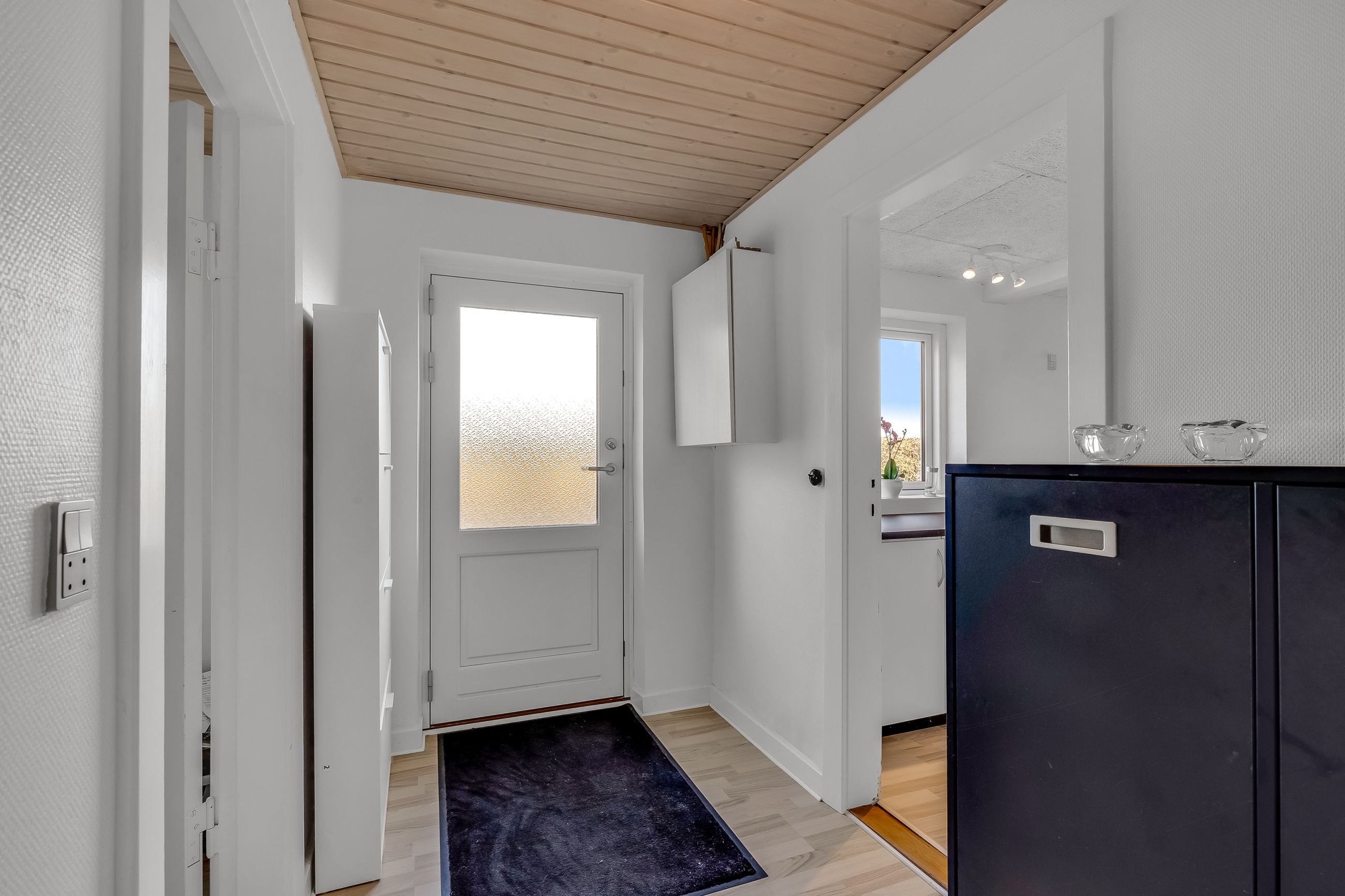 På førstesalen åbner boligen sig i lys og volumen med loft til kip og store vinduespartier, hvor naturen udenfor bliver en naturlig del af indretningen. Herfra er der udgang til både altan og tagterrasse, hvor udsigten over det åbne landskab kan nydes i rolige omgivelser.