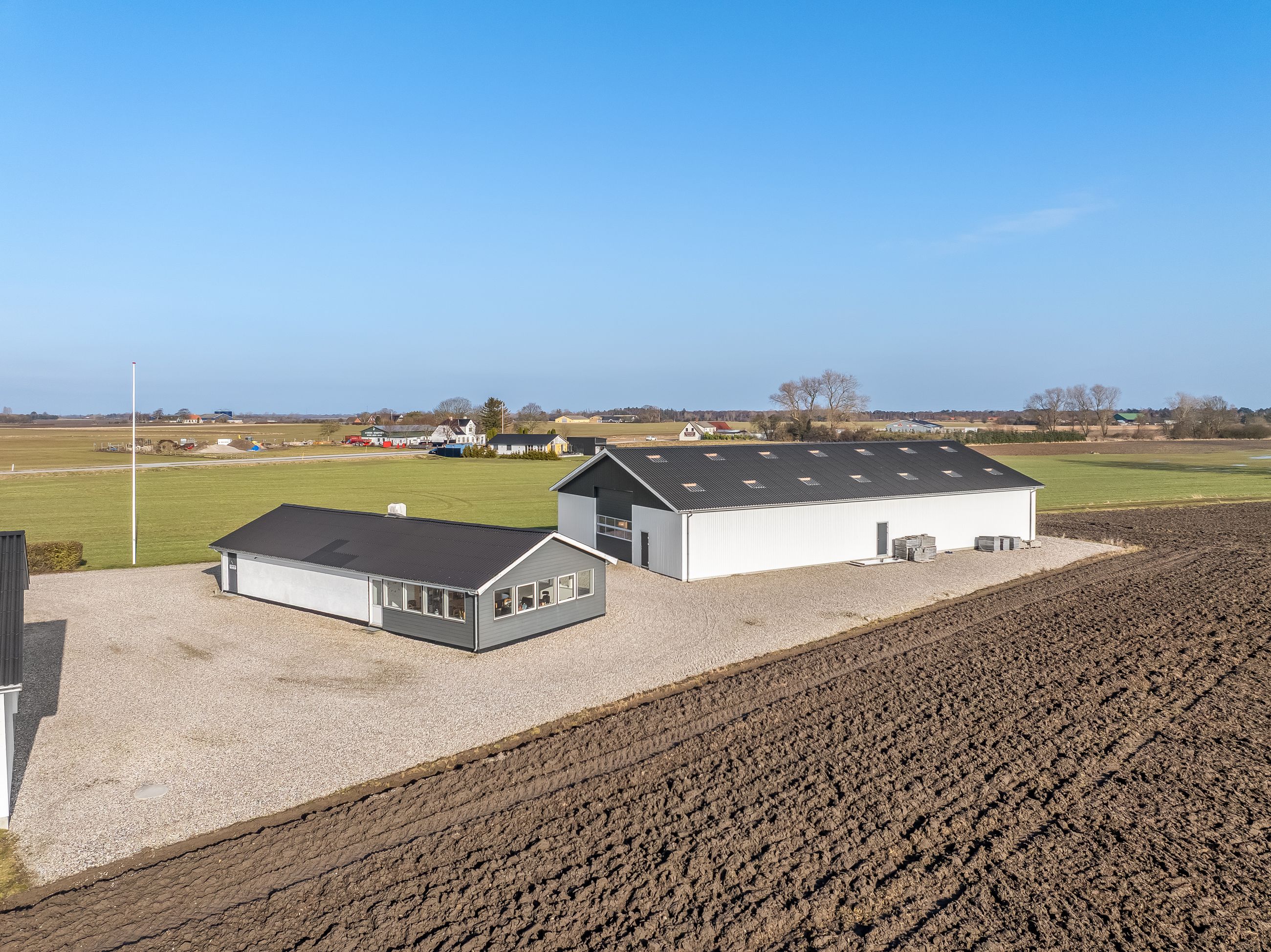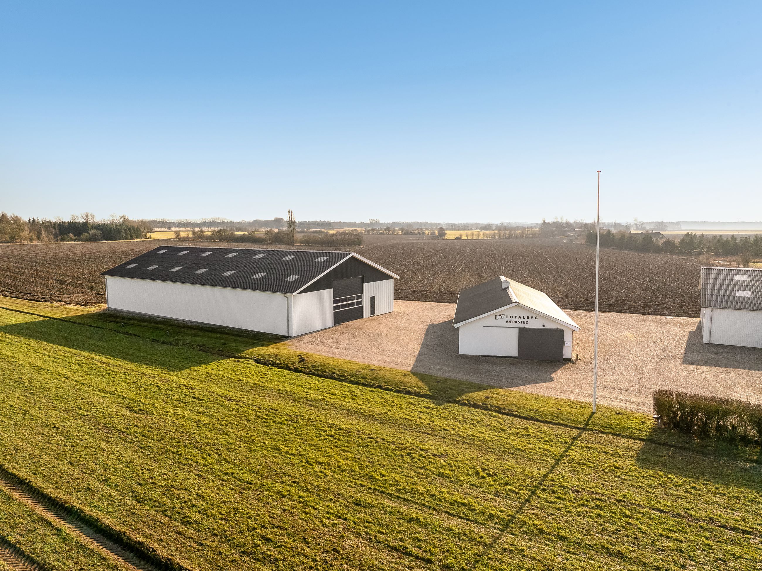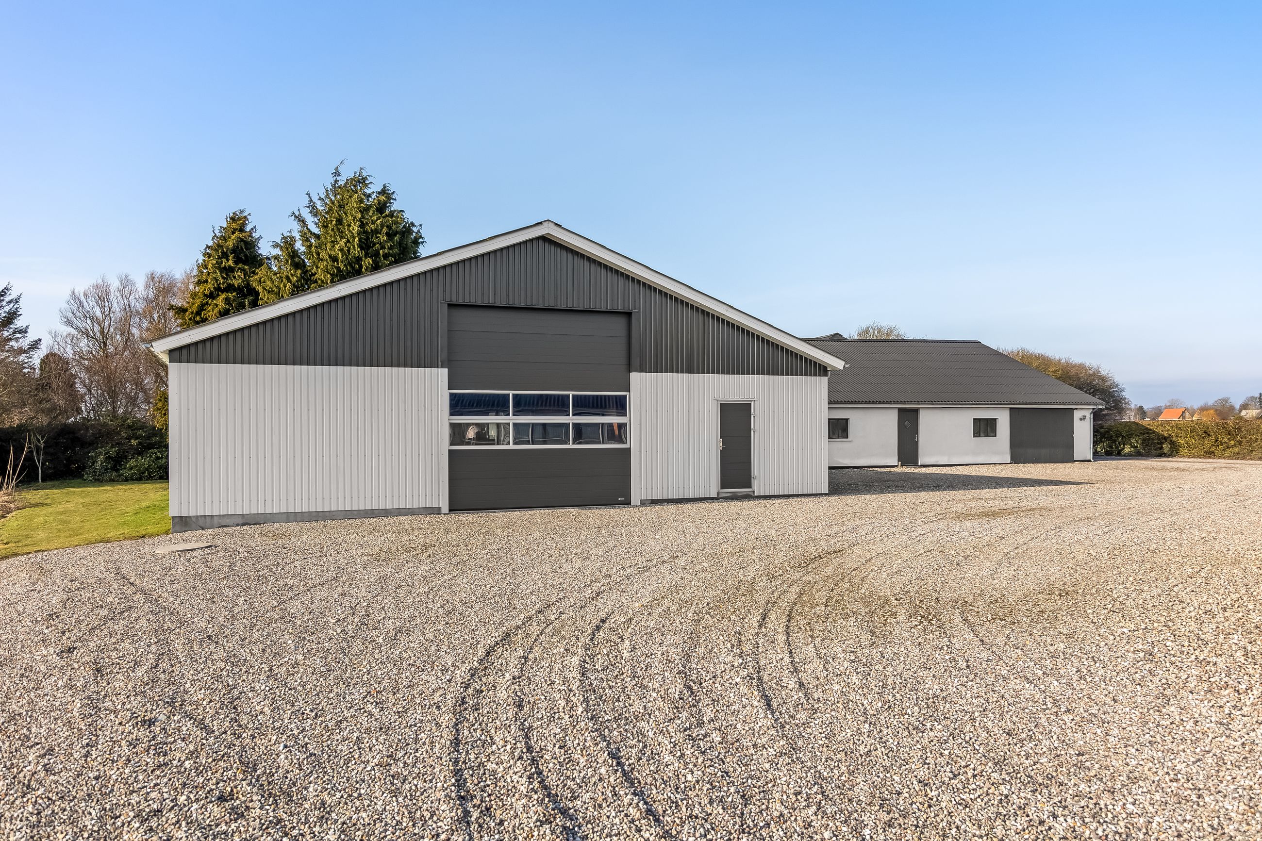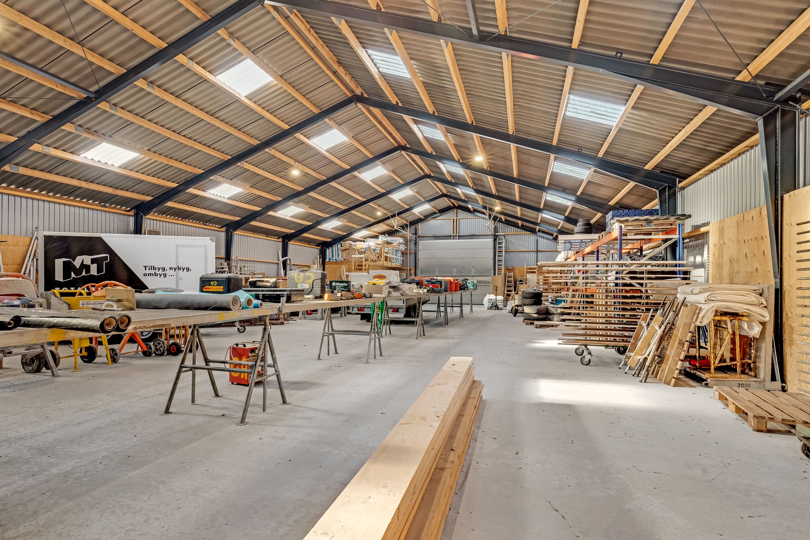 Den store maskinhal på 413 m2 fremstår solid og funktionel med stålspær, fast betongulv, god loftshøjde og store porte – ideel til entreprenørvirksomhed, håndværk, lager eller pladskrævende projekter.