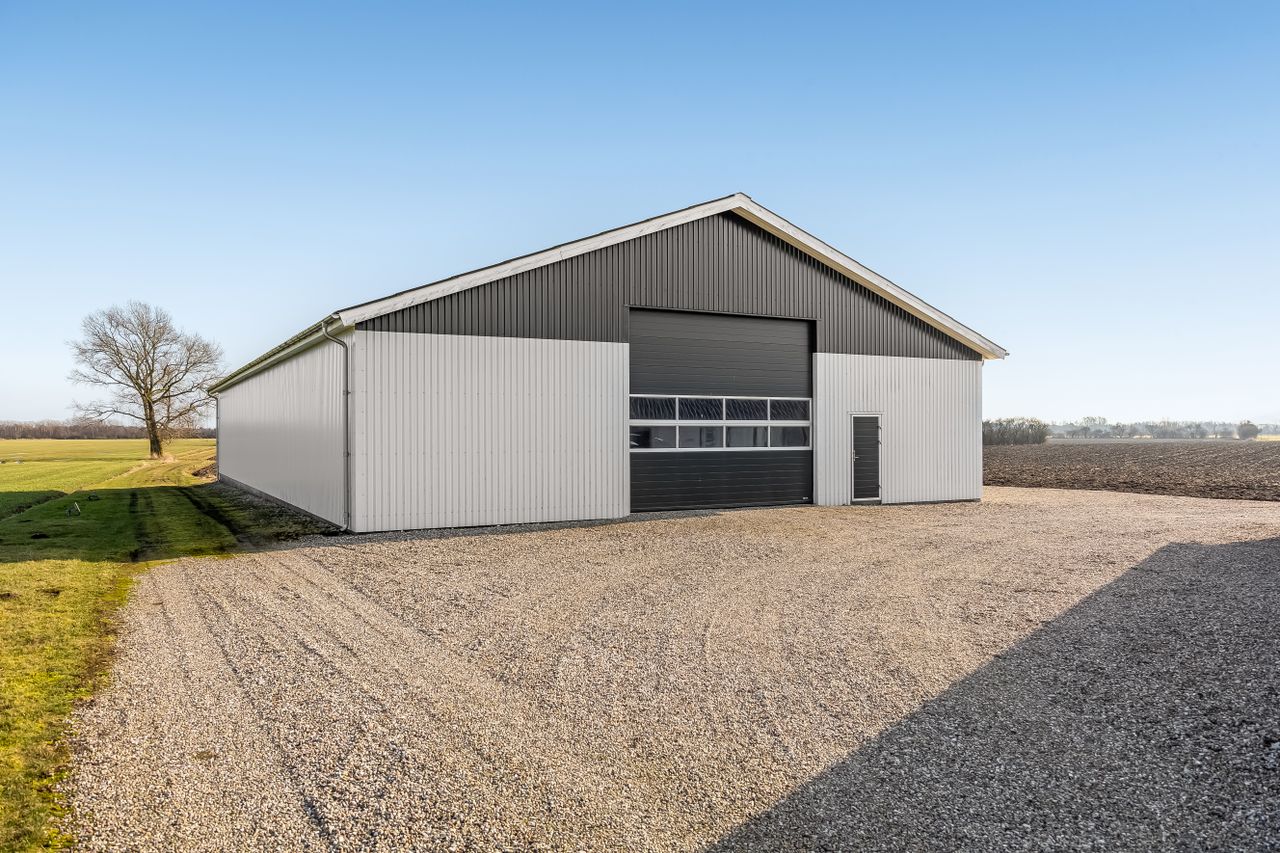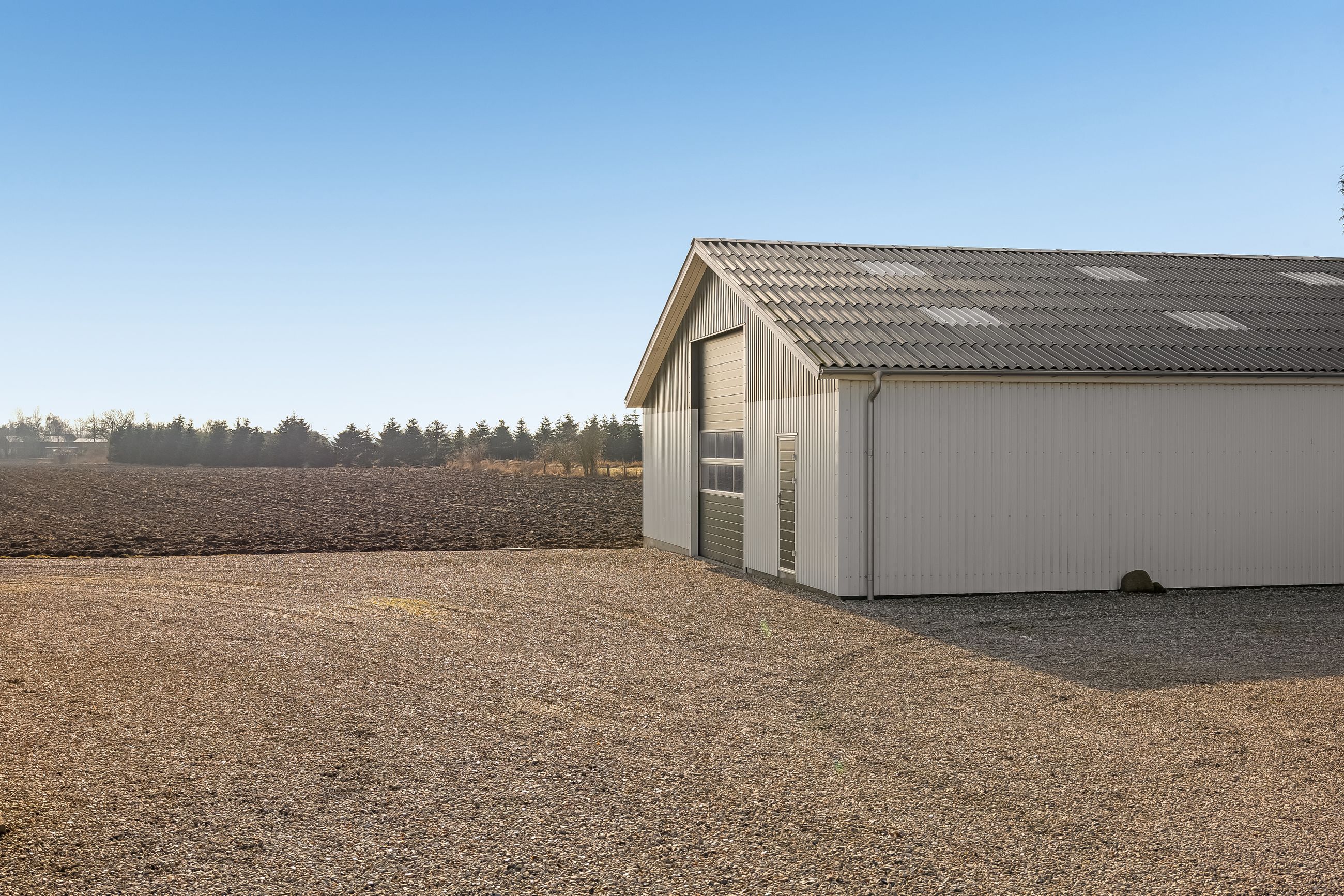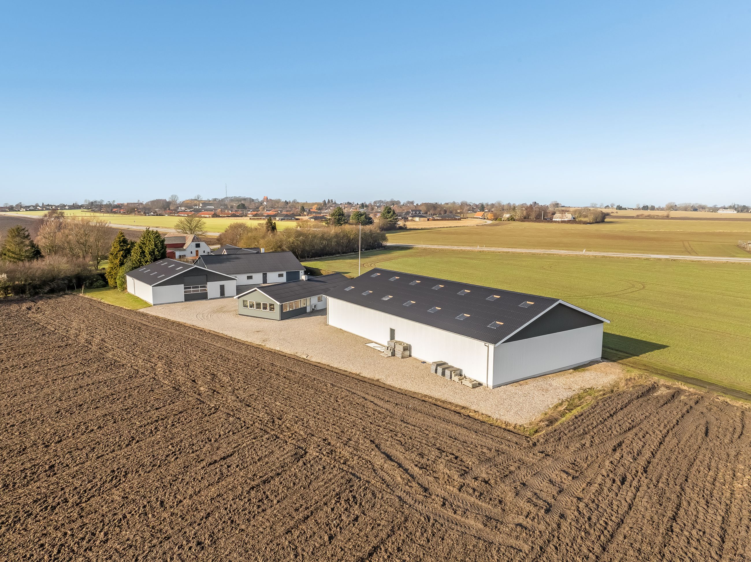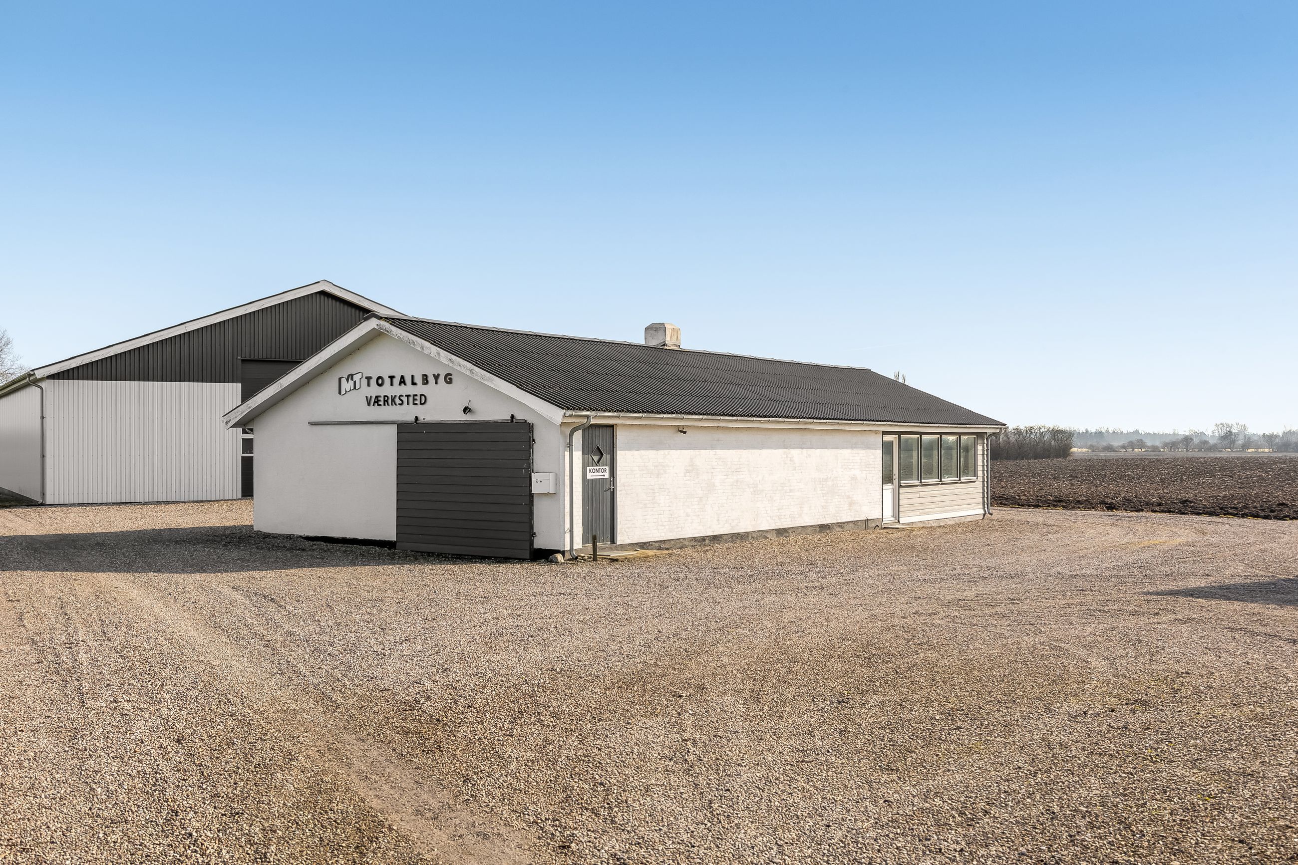 Den store maskinhal på 413 m2 fremstår solid og funktionel med stålspær, fast betongulv, god loftshøjde og store porte – ideel til entreprenørvirksomhed, håndværk, lager eller pladskrævende projekter.