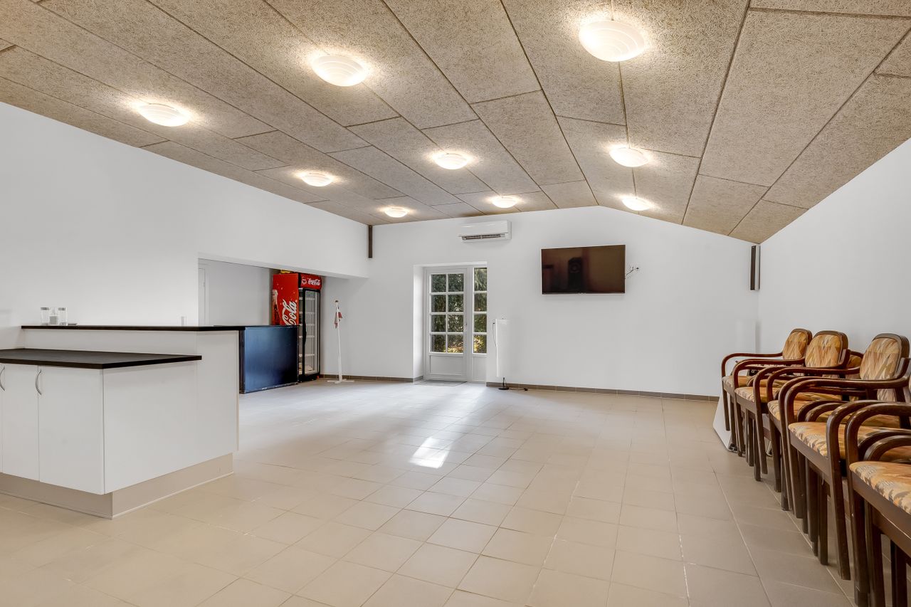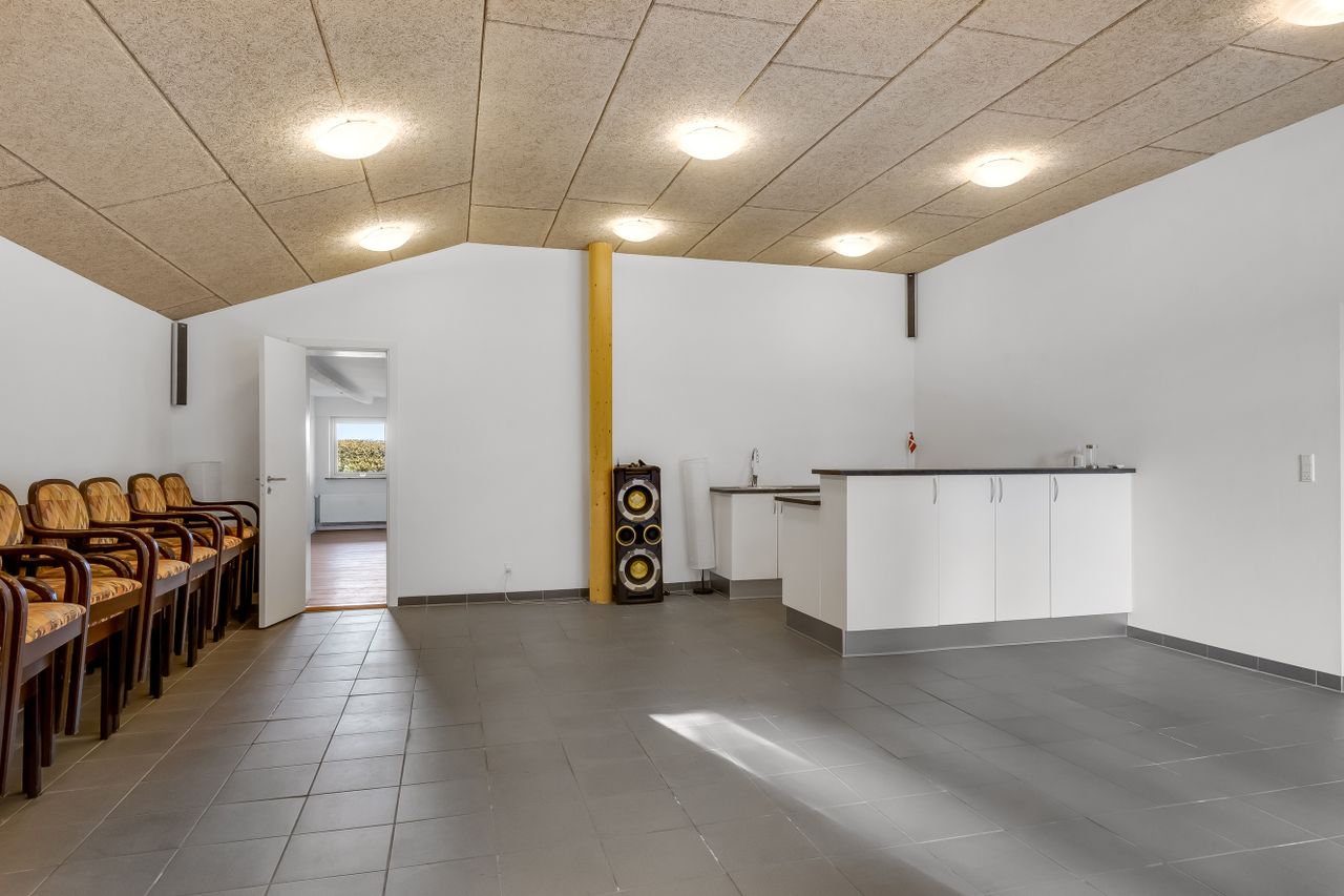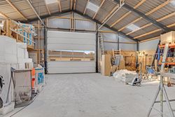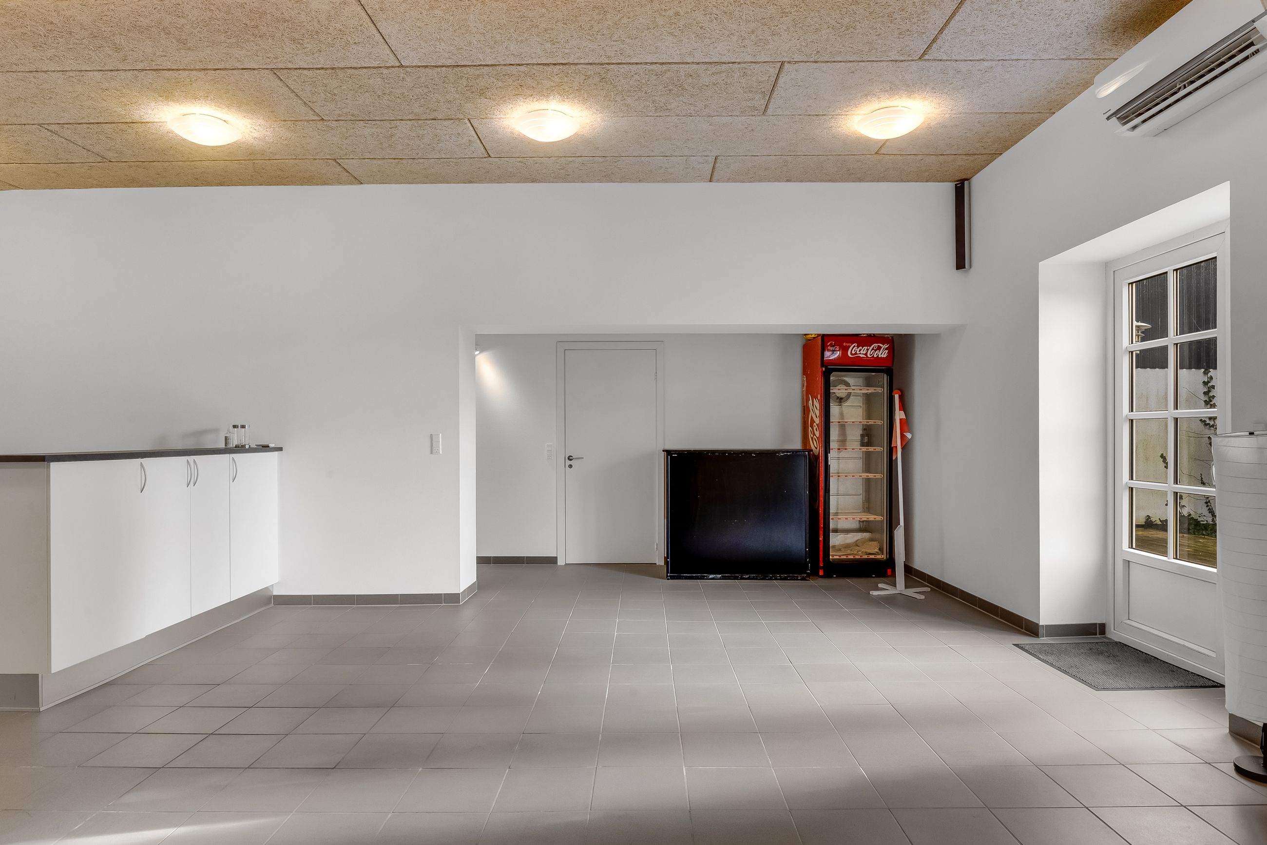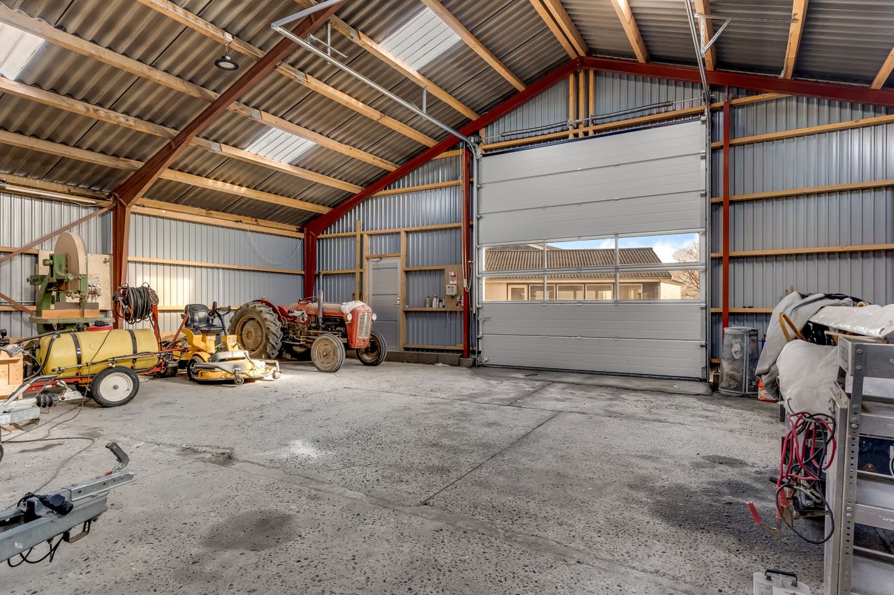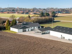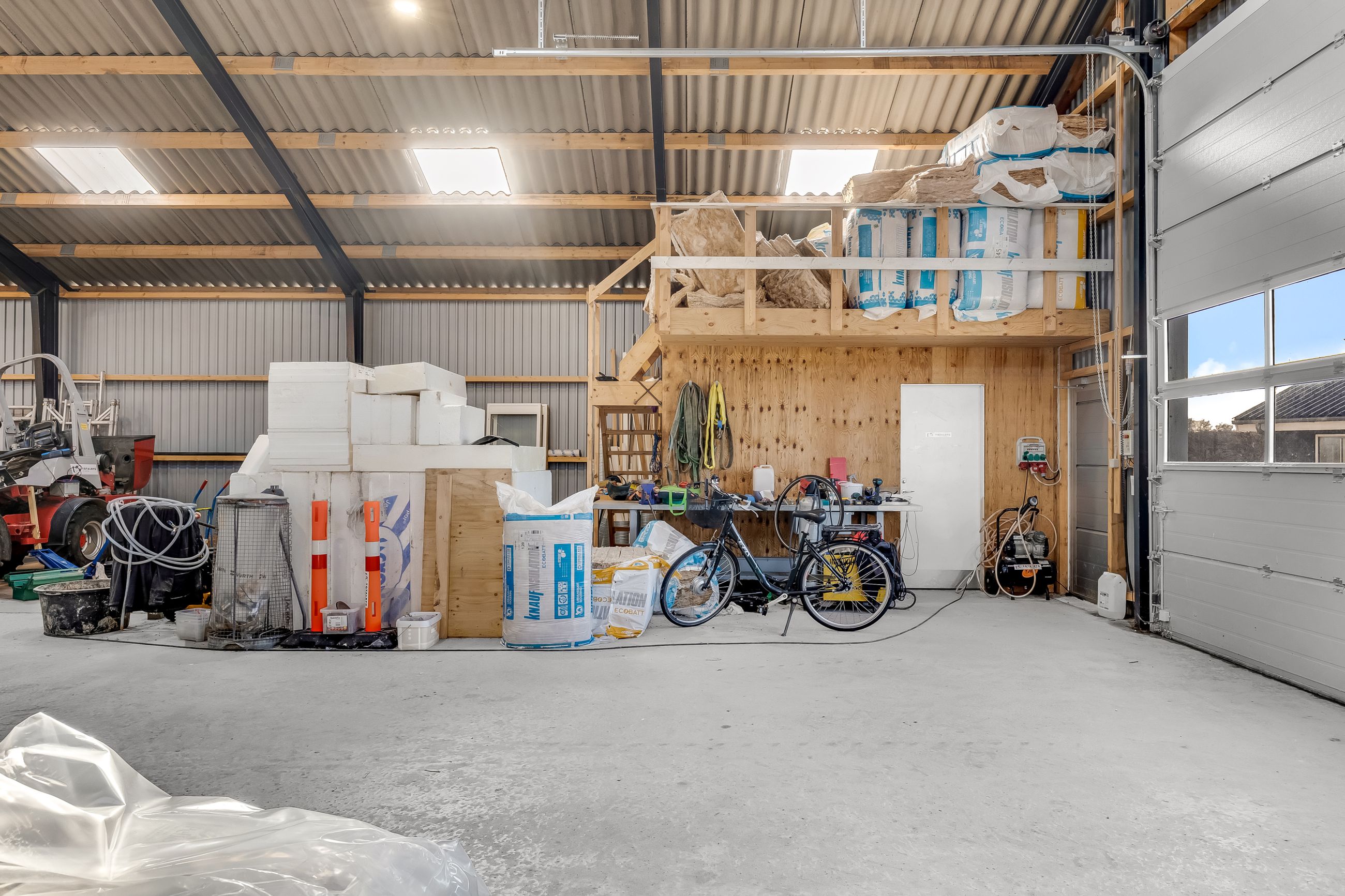 Den store maskinhal på 413 m2 fremstår solid og funktionel med stålspær, fast betongulv, god loftshøjde og store porte – ideel til entreprenørvirksomhed, håndværk, lager eller pladskrævende projekter.