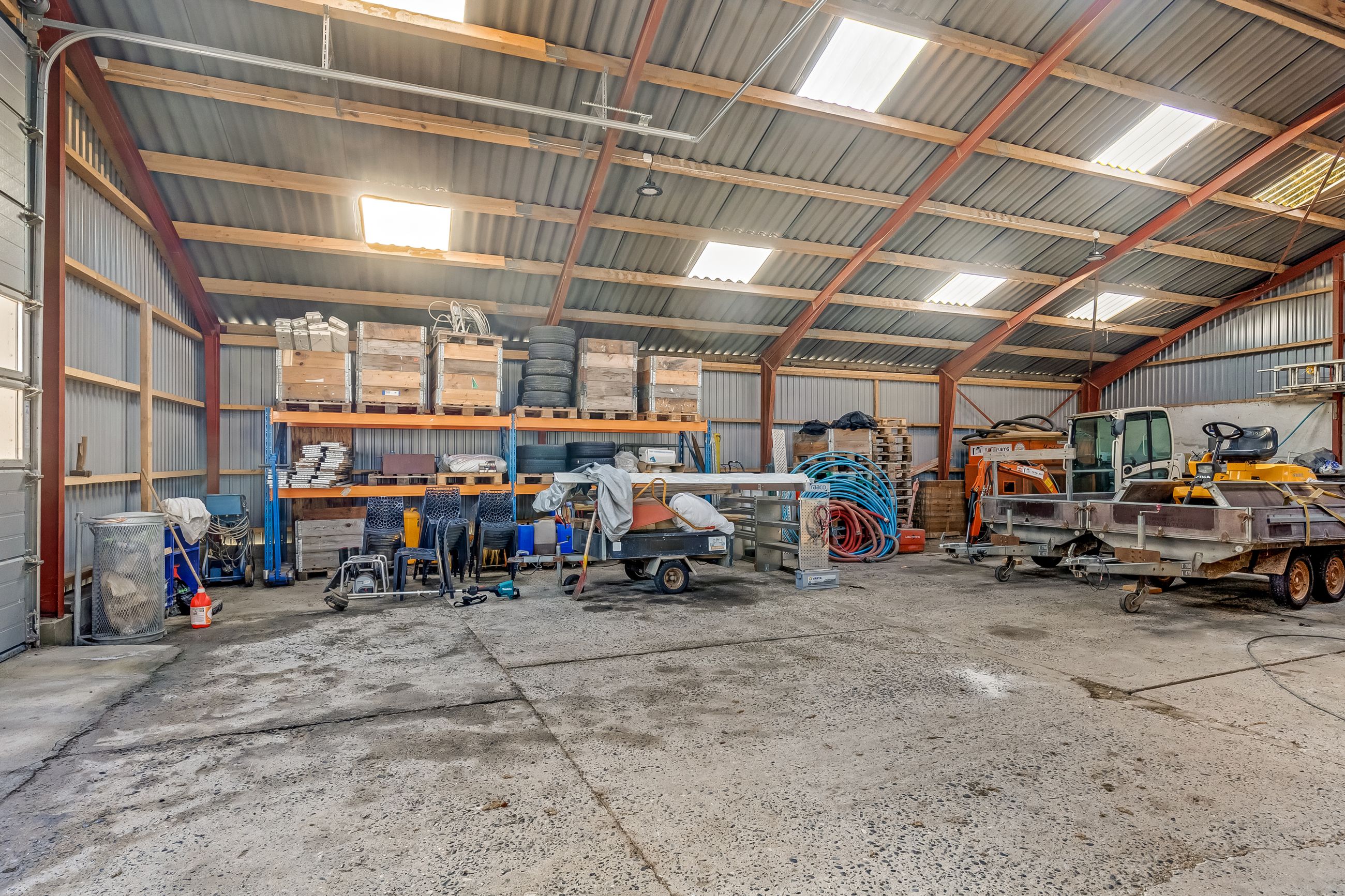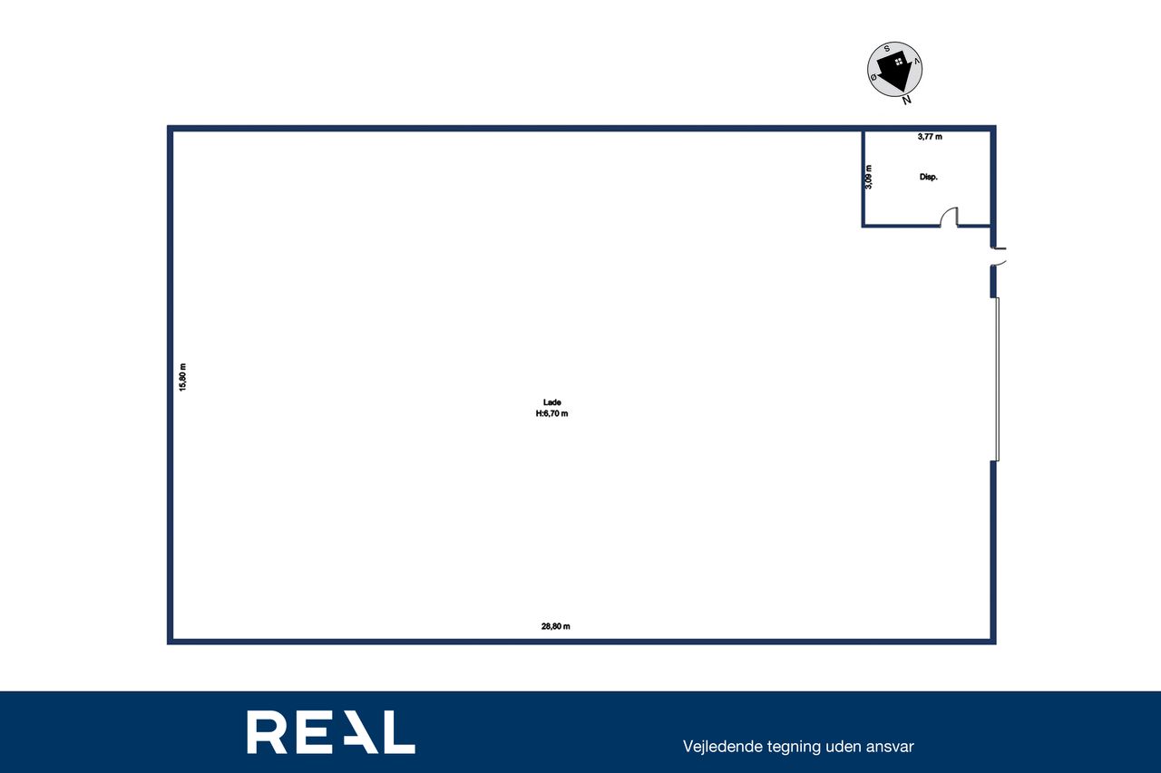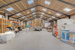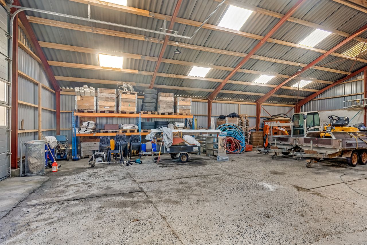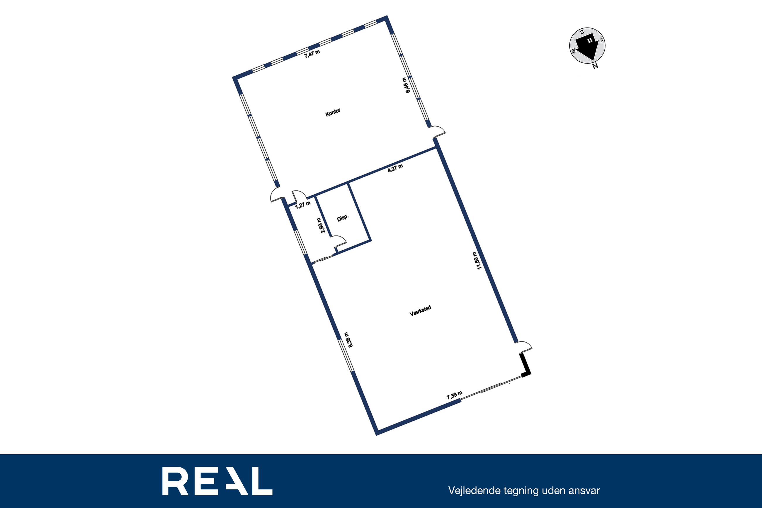 Den store maskinhal på 413 m2 fremstår solid og funktionel med stålspær, fast betongulv, god loftshøjde og store porte – ideel til entreprenørvirksomhed, håndværk, lager eller pladskrævende projekter.