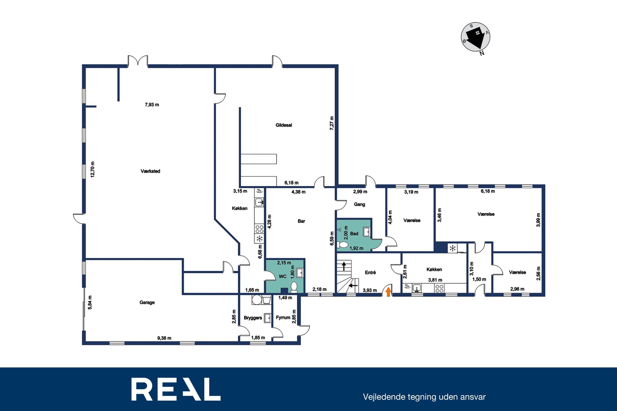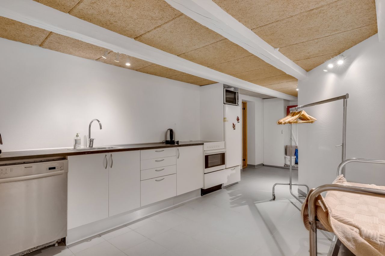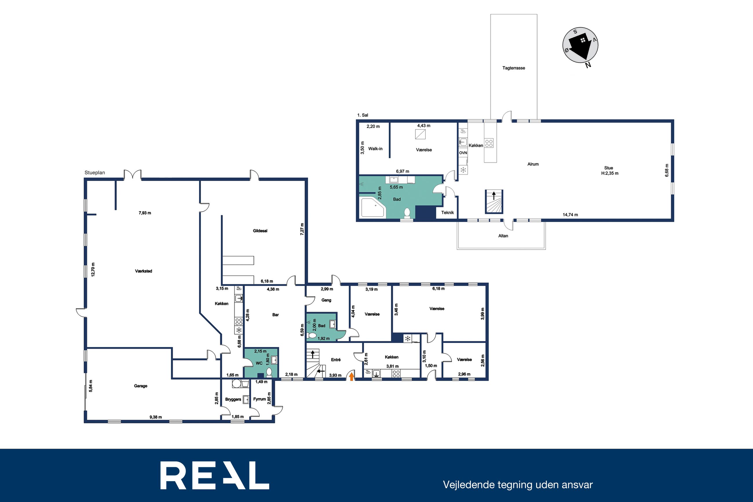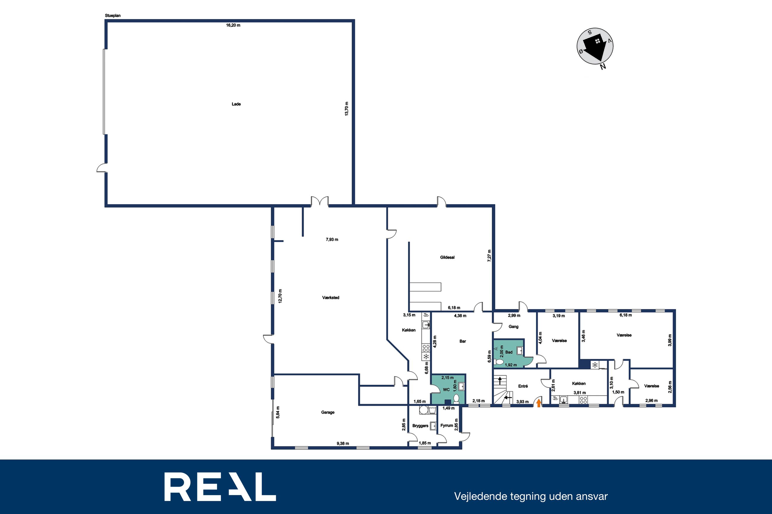 Stueplanet rummer en fleksibel indretning med entré, køkken, opholdsrum, værelser og badeværelse. Her er oplagte muligheder for teenagerafdeling, gæsteafdeling, generationsbolig, hjemmekontor eller klinik. Hertil kommer både bar, gildesal, garage og værksted, som giver ekstra plads til både hverdag og fritid.