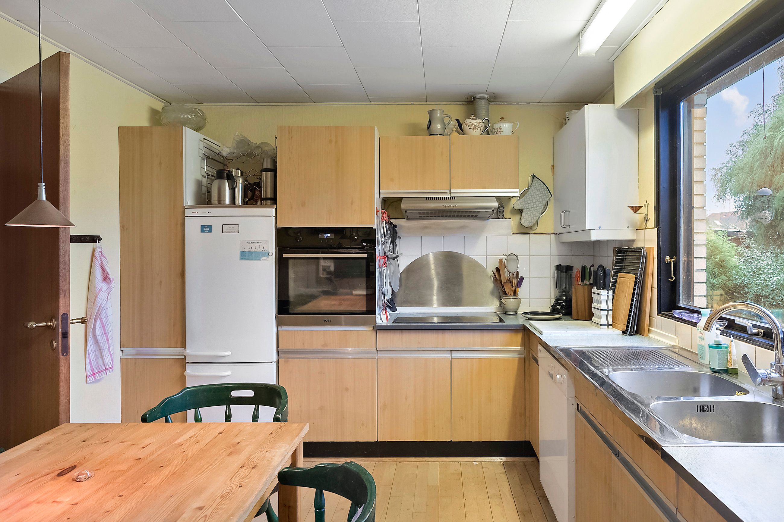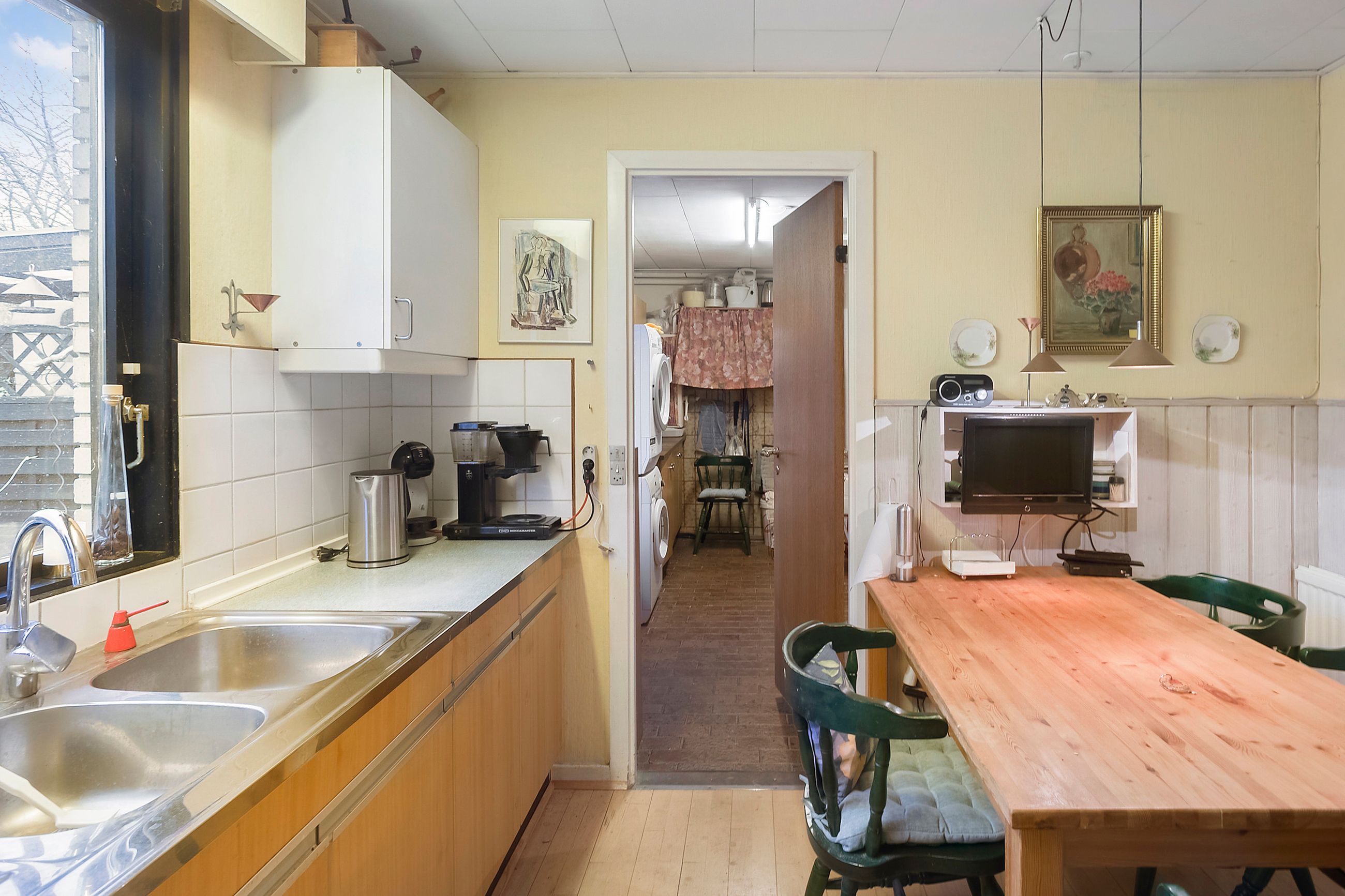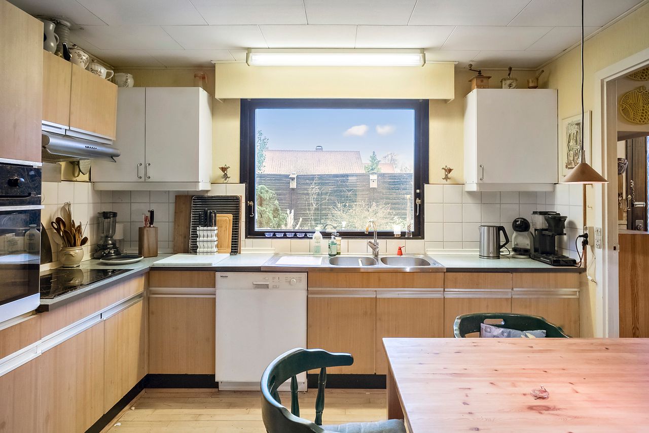 Køkkenet har spiseplads og fungerer fint i hverdagen – og for jer, der drømmer om en opdatering, er her et oplagt udgangspunkt til at skabe et mere moderne udtryk.