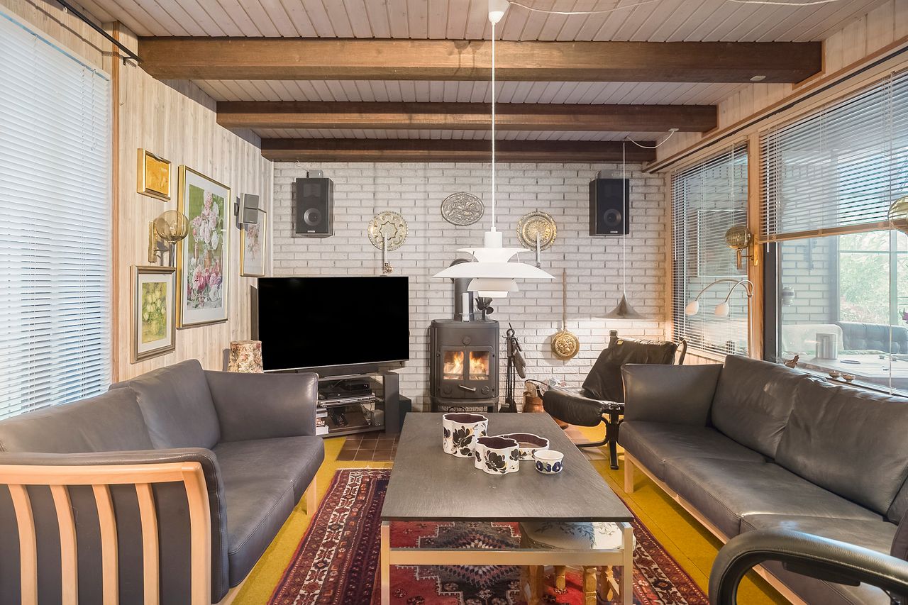 Husets hjerte er den store opholdsafdeling med masser af plads til både spisebord og sofahjørne. Her får I også hyggelige detaljer som synlige bjælker og en brændeovn, der gør vinteraftenerne lidt mere “hyggelige”.