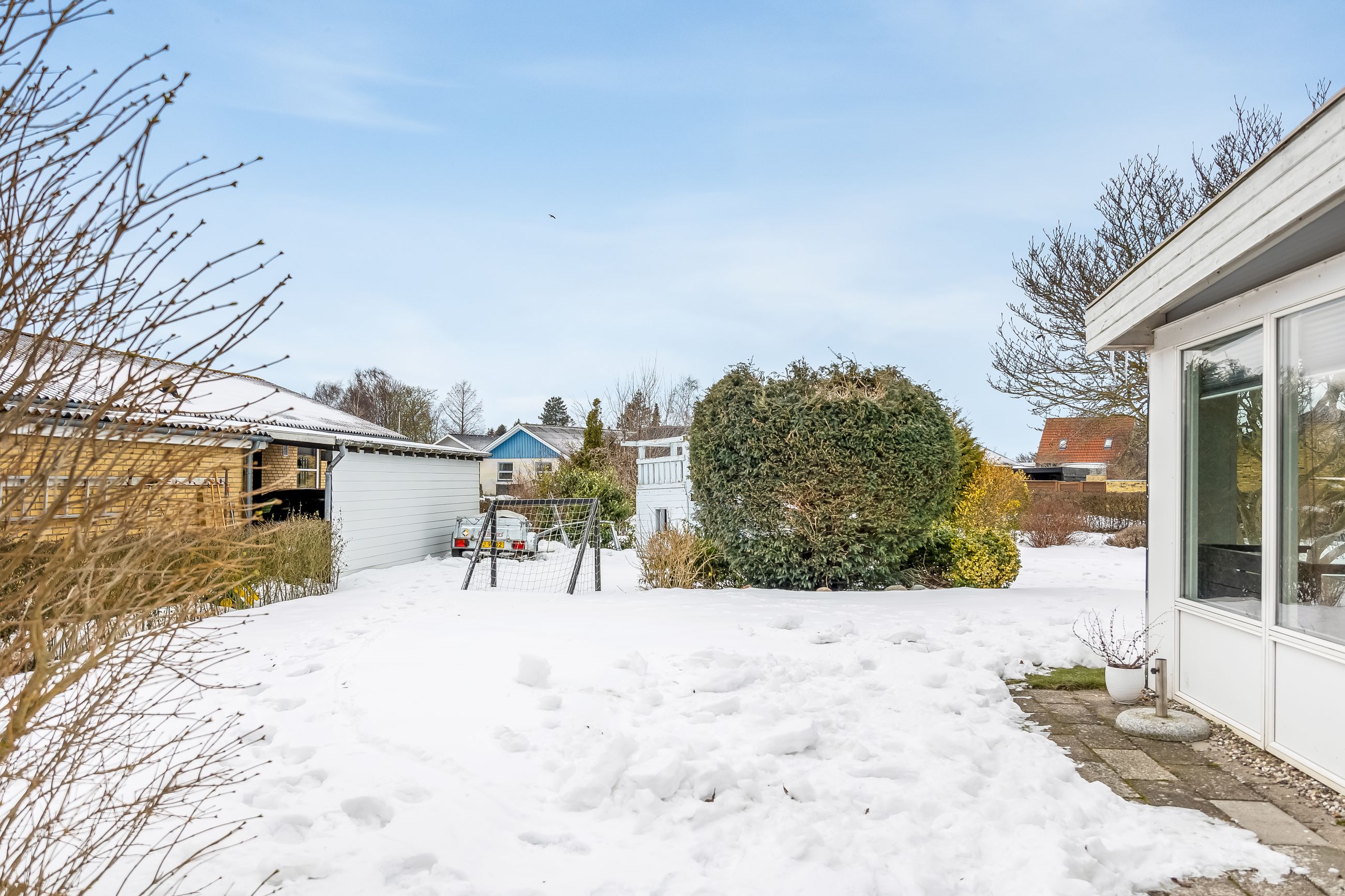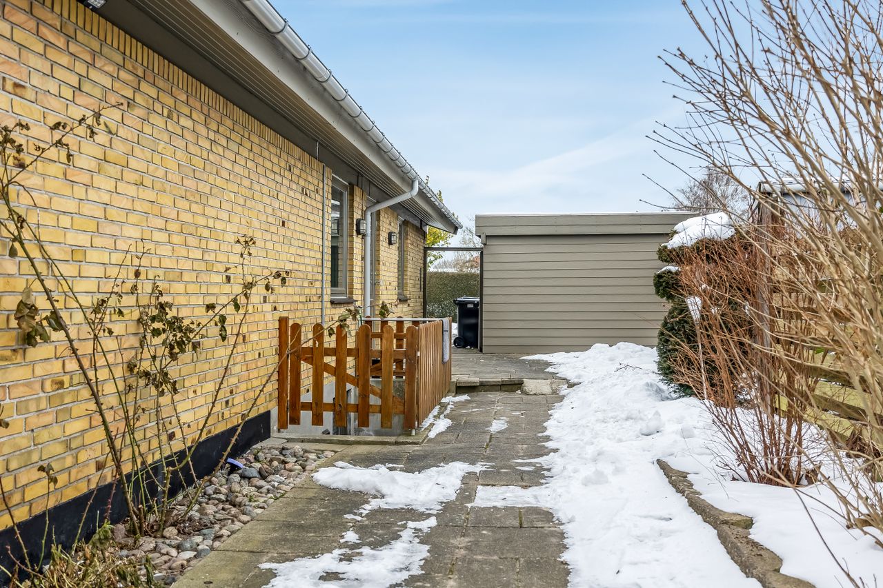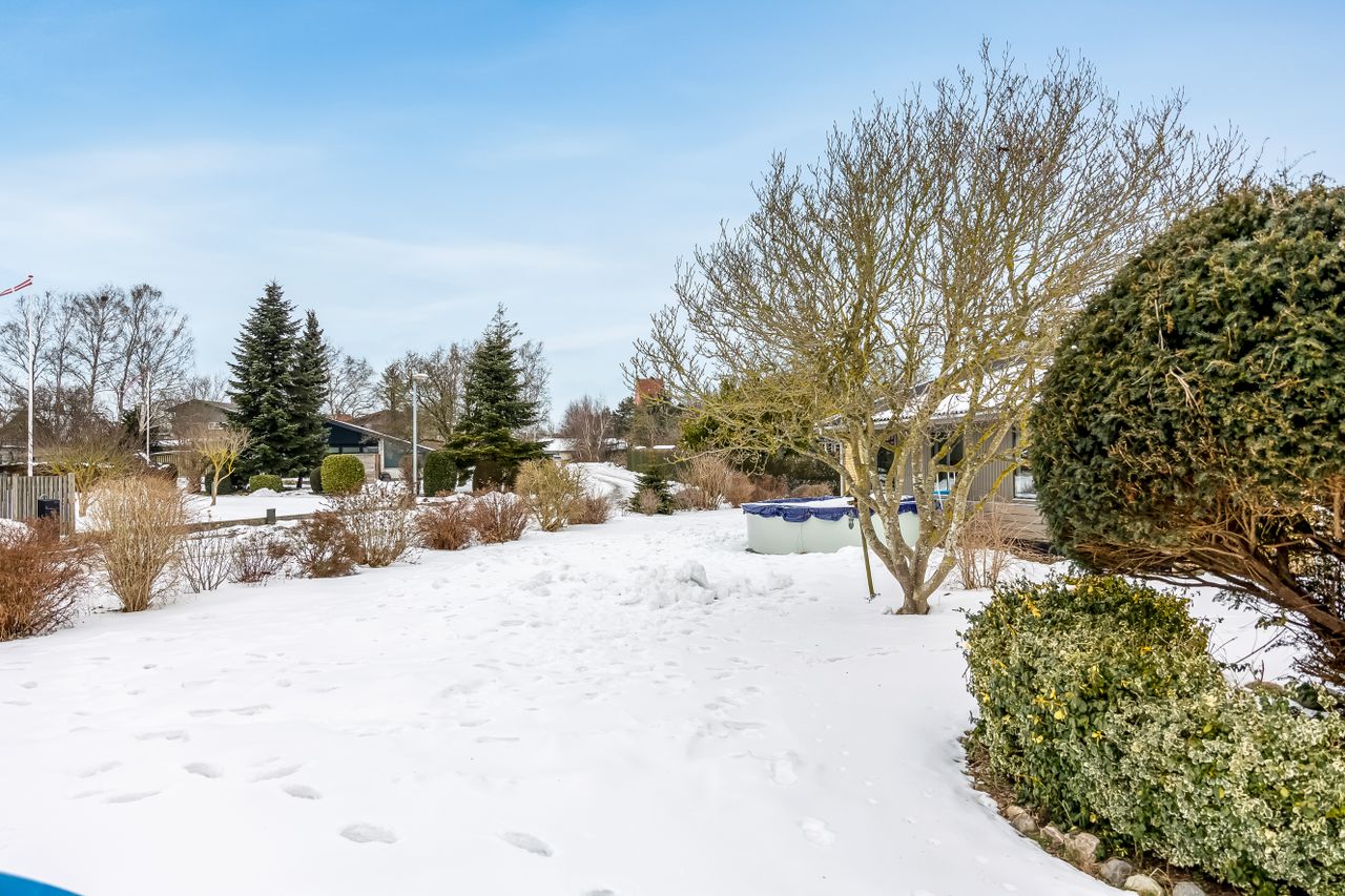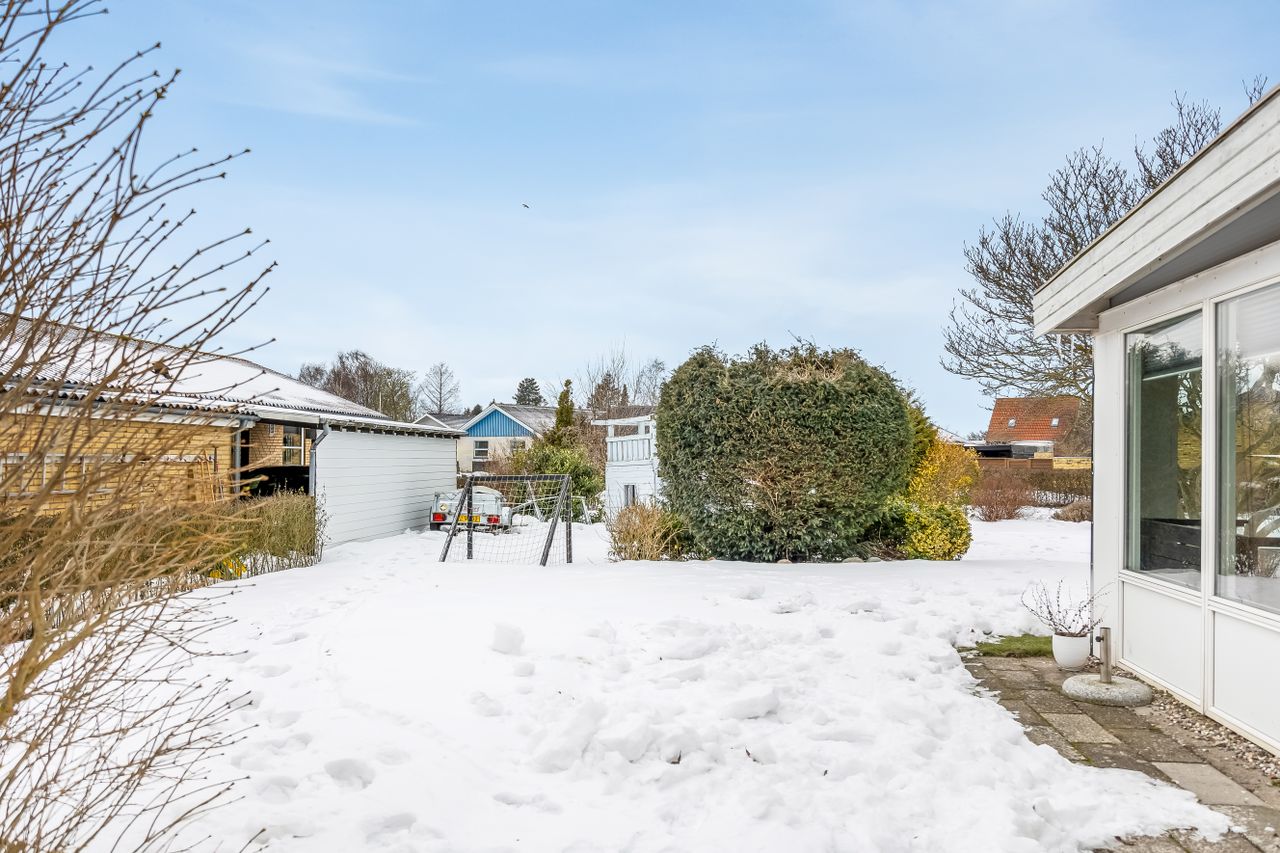 Haven er stor, privat og lige til at tage i brug. Her er plads til trampolin, boldspil, gemmeleg og sommergrill. Det er haven, hvor børnene får røde kinder – og hvor forældrene kan sidde på terrassen og følge med.