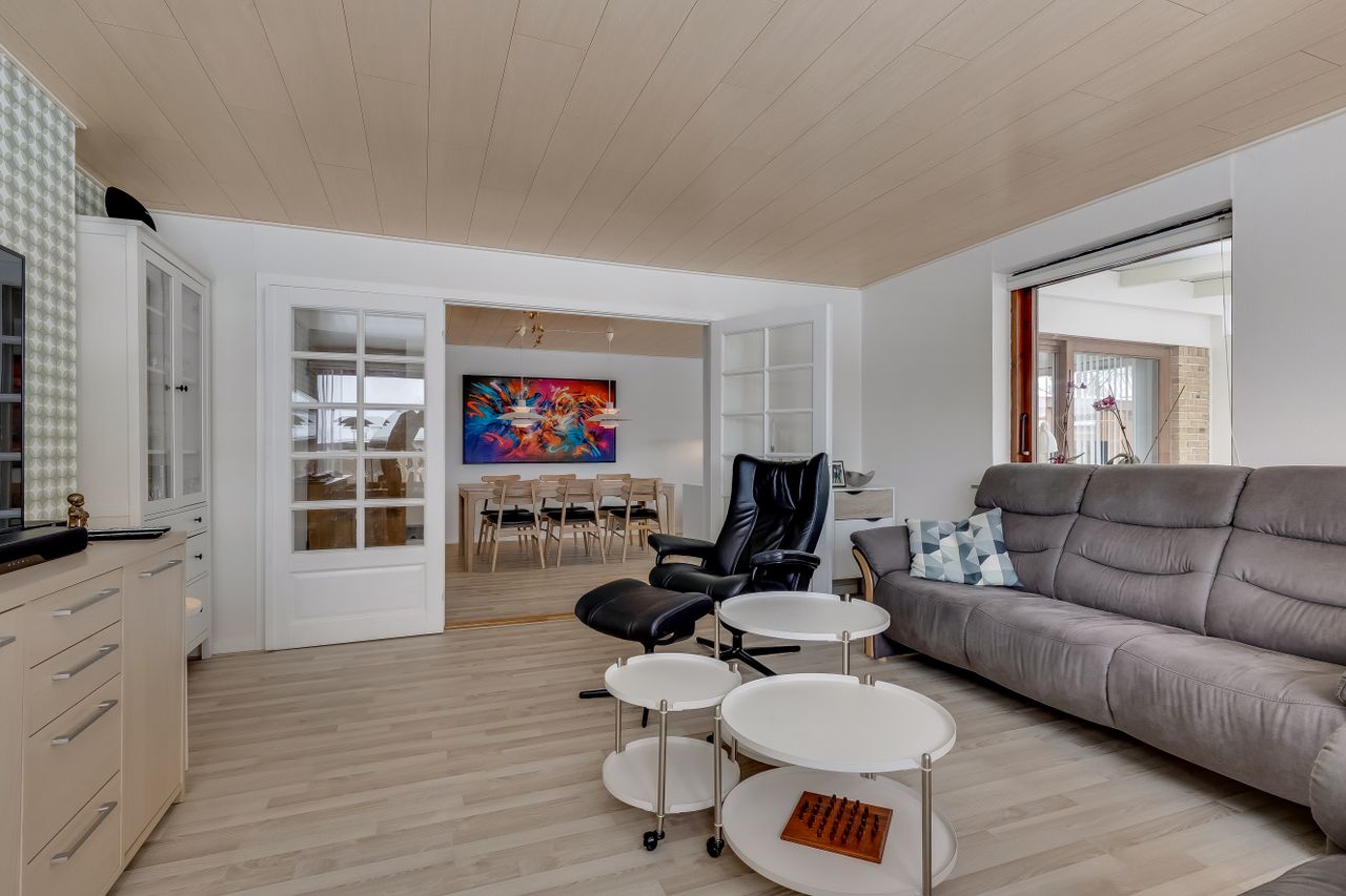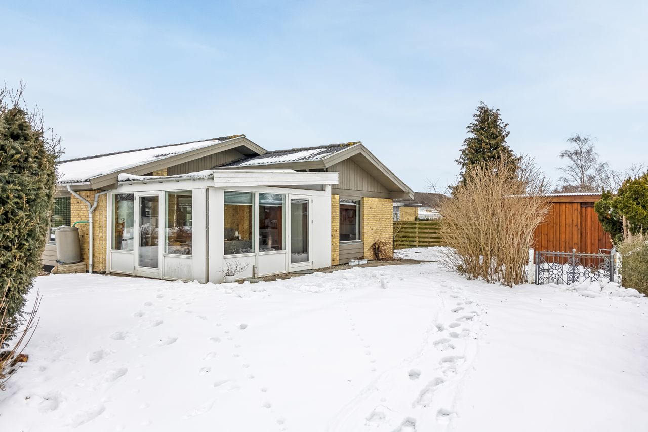 Her får I 140 m2 velindrettet bolig med 2 stuer, 4 værelser og 2 badeværelser, en 18 m2 udestue fra 2018, 17 m2 integreret garage, energimærke C, fjernvarme og en meget flot tilstandsrapport, som giver ro i maven fra dag ét.