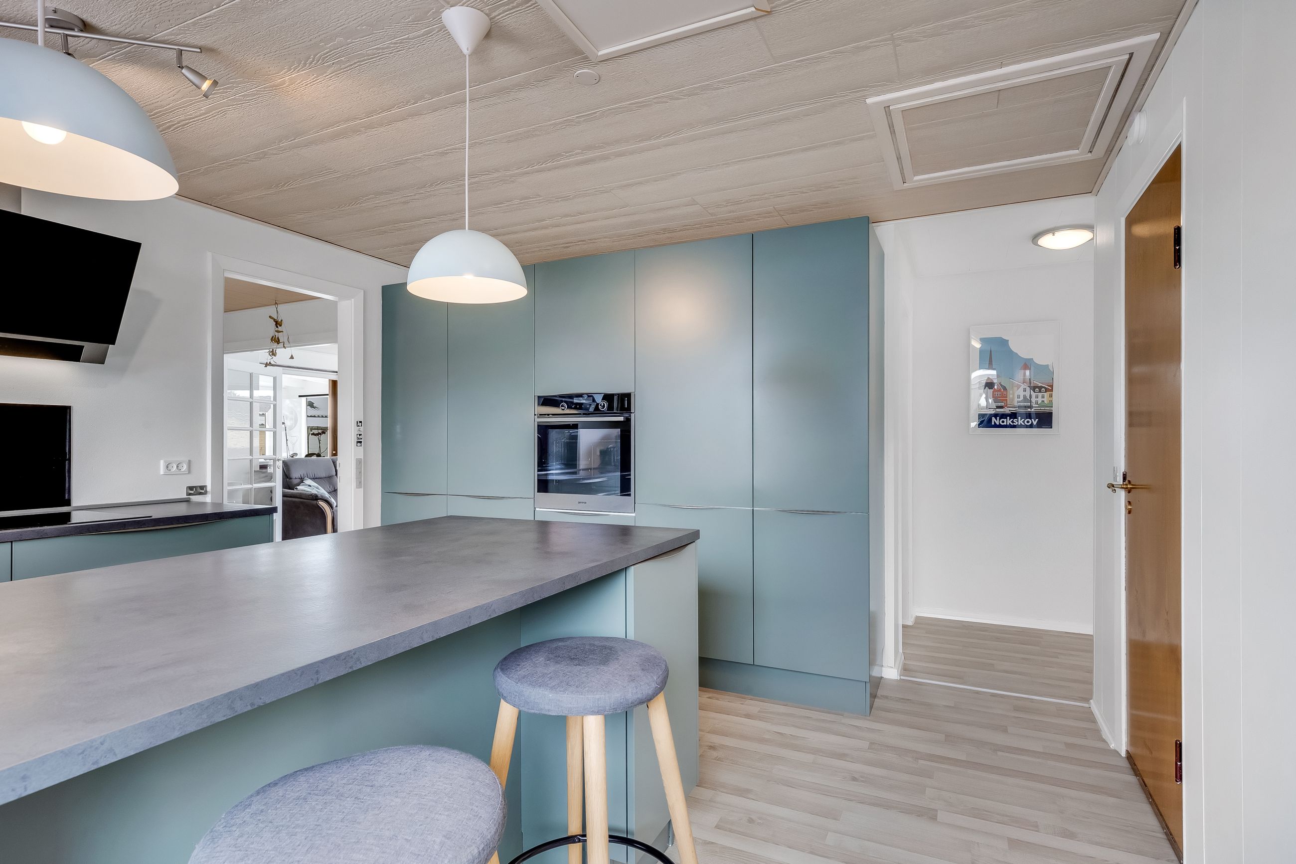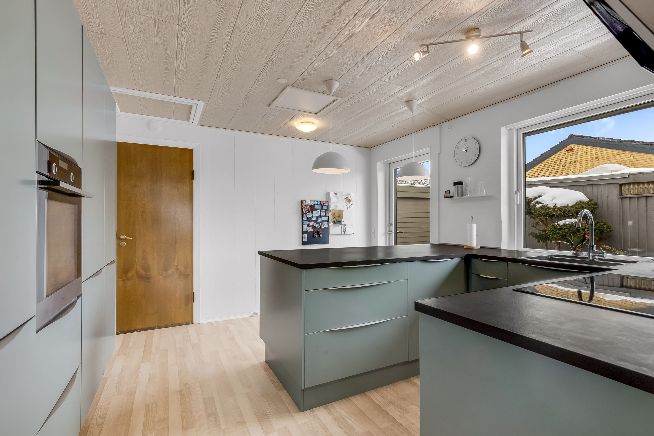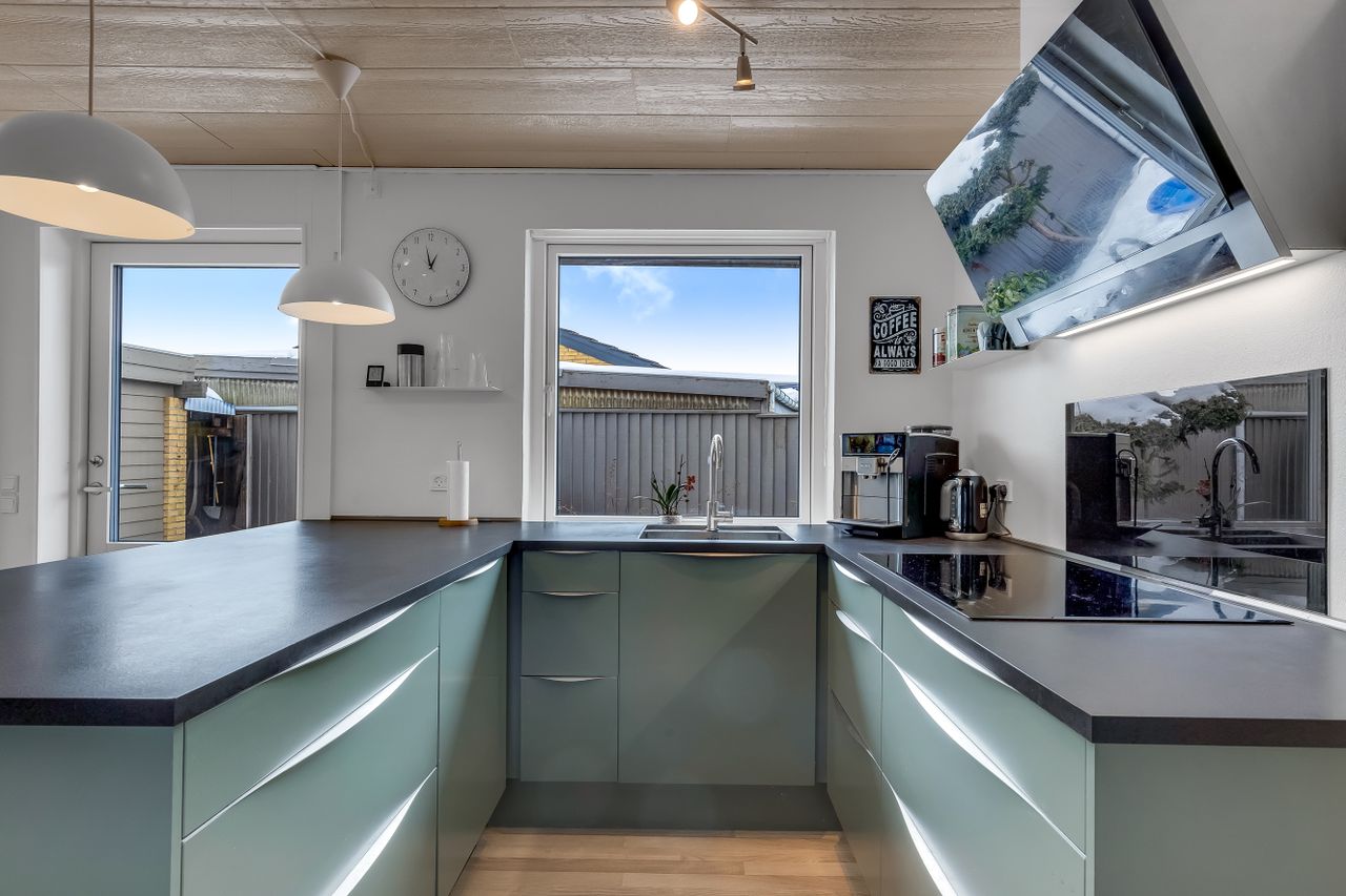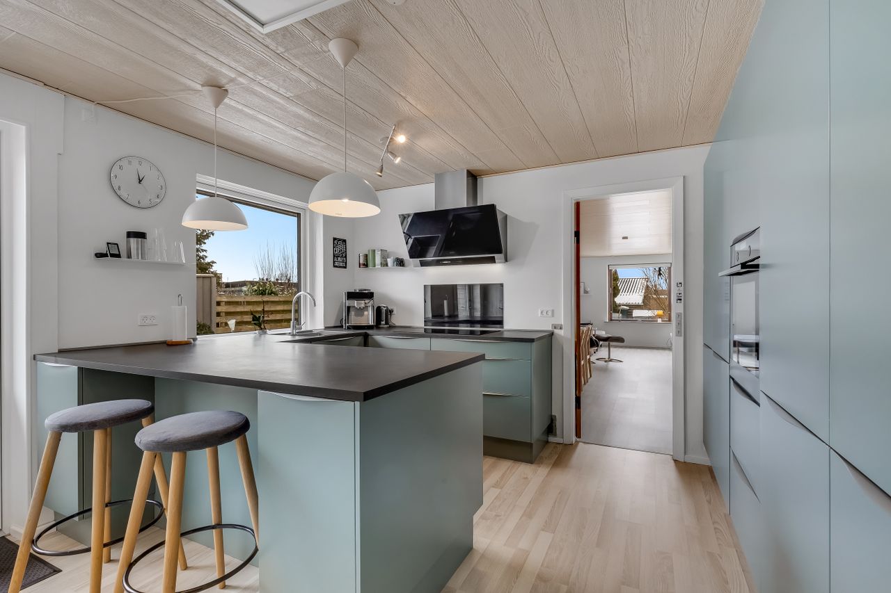 Køkkenet er fra 2021 og indrettet med en praktisk halvø, der gør rummet til familiens naturlige samlingspunkt. Her kan der laves aftensmad, laves lektier og vendes skolegårdshistorier på samme tid.