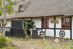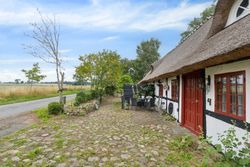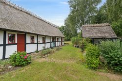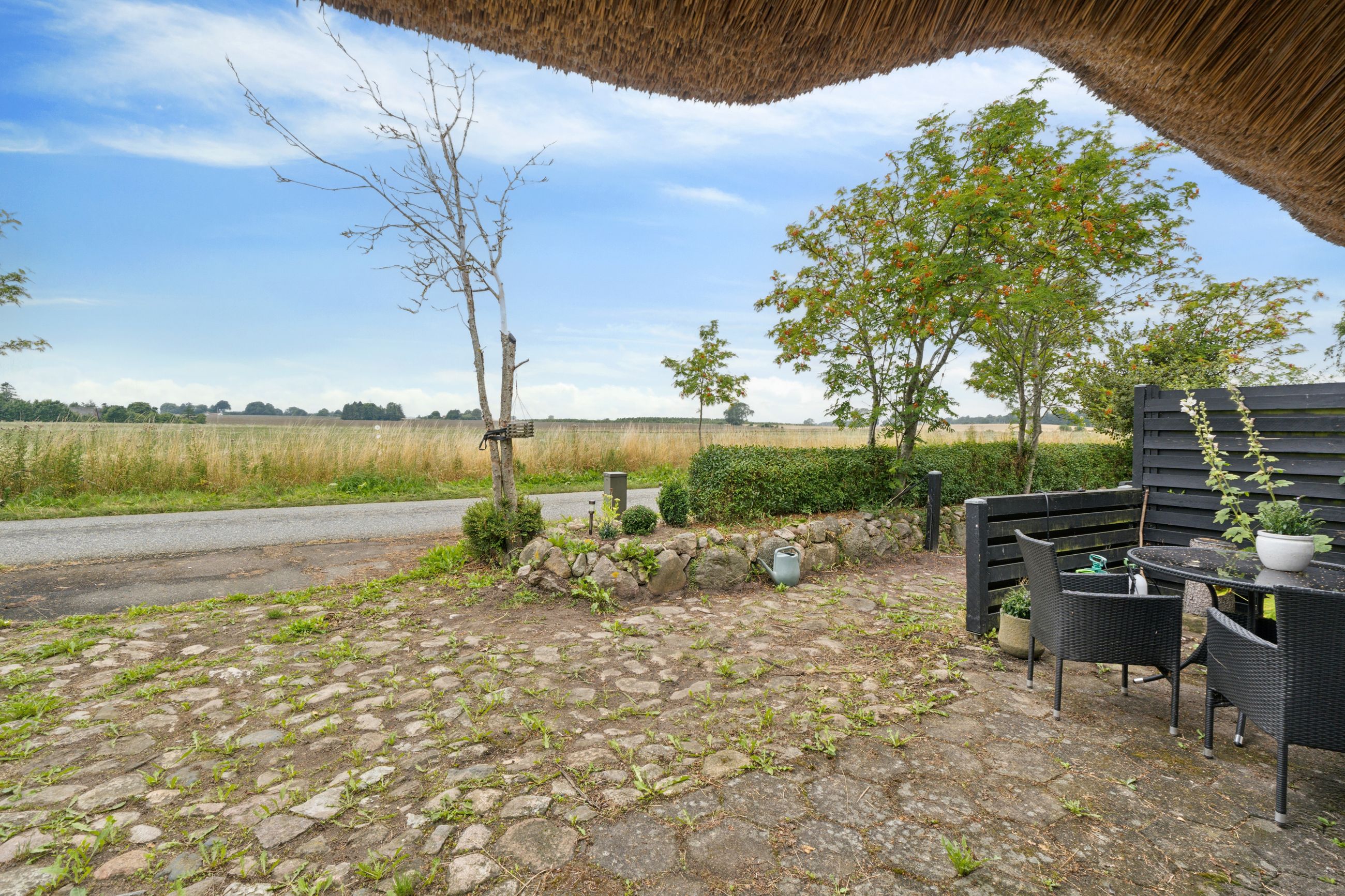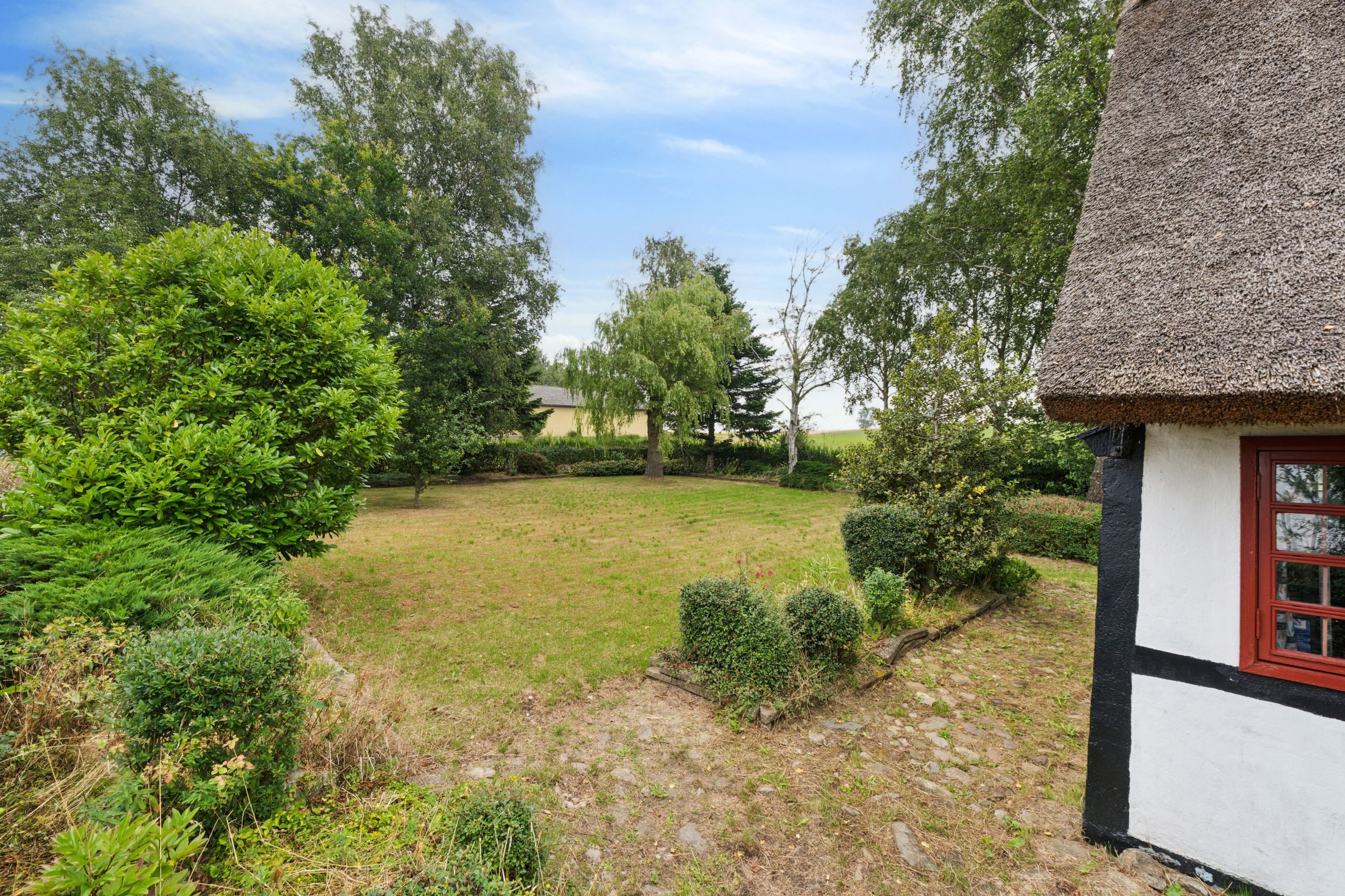 Grunden tæller 1.200 kvadratmeter, og haven prydes af gamle træer og frodig beplantning. Udearealets stenbelægning passer perfekt til ejendommen, og mod vest er der etableret en hyggelig lækrog. I forlængelse af det lille, stråtækte udhus findes desuden en terrasse.