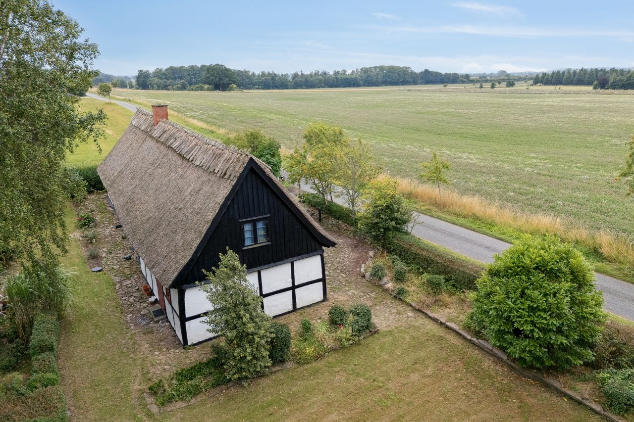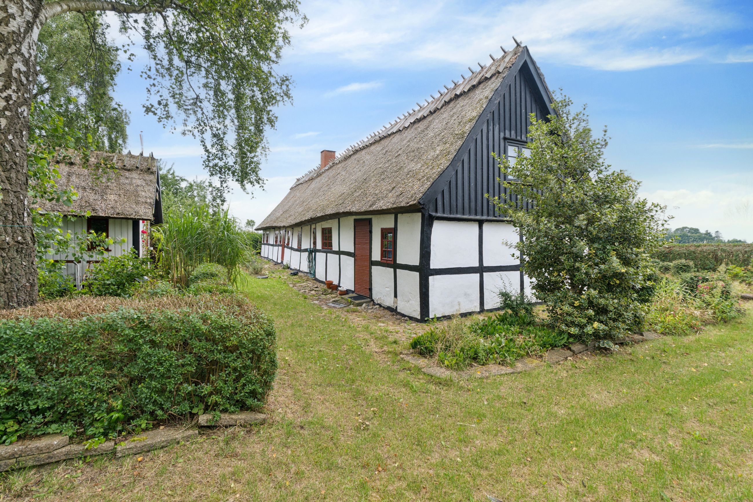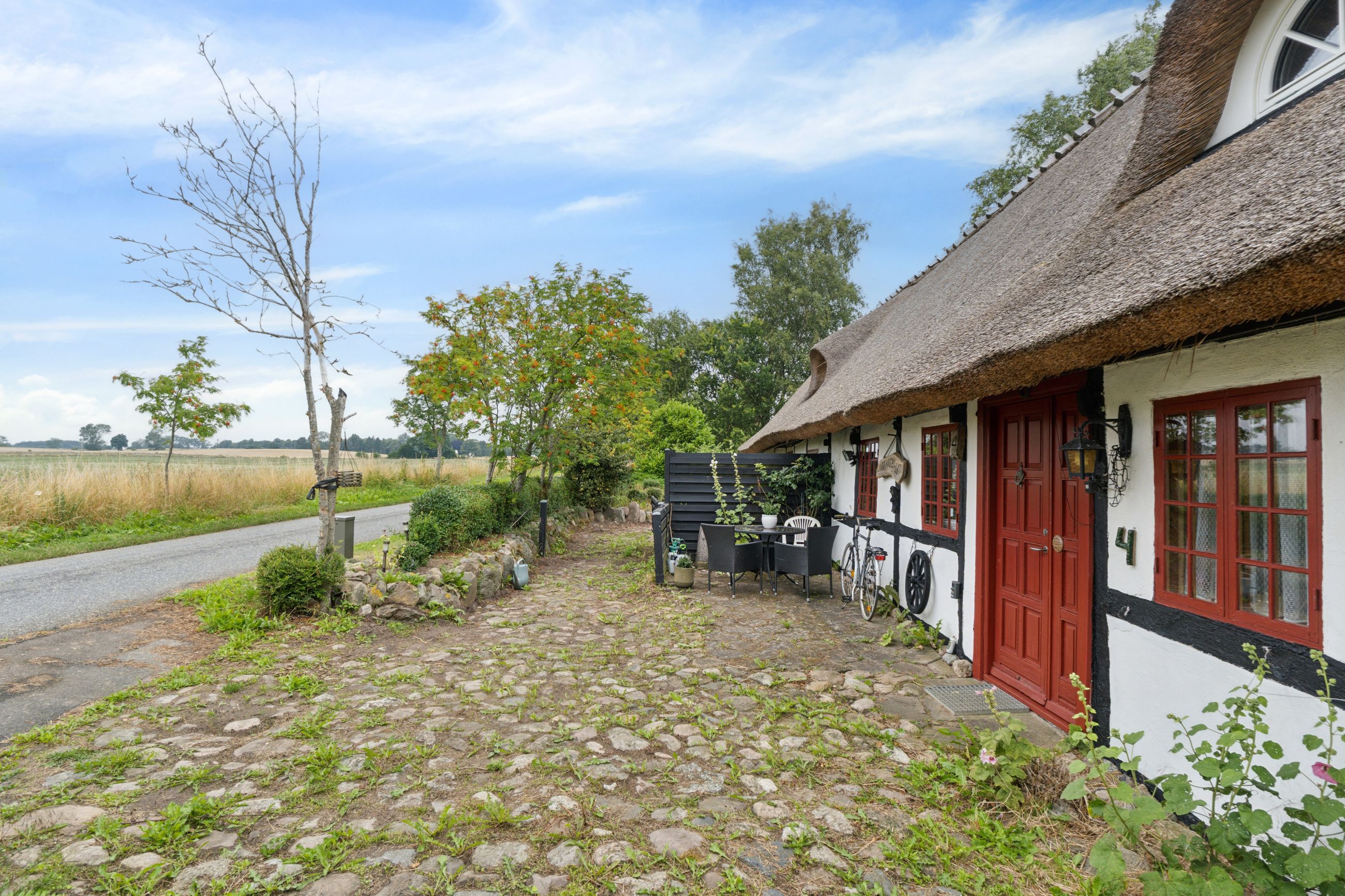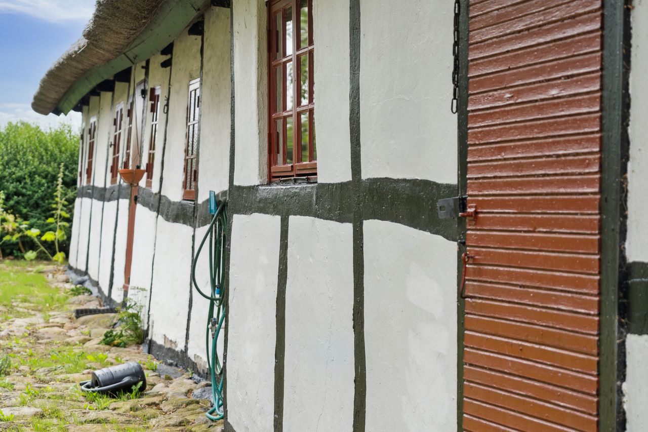 Huset præsenterer sig utroligt charmerende med hvid facade, sort bindingsværk og stråtag. En del af taget er udskiftet i 2023, hvor der ligeledes blev monteret nye kvistvinduer med termoglas. Gavlvinduerne er også forholdsvis nye, og flere af de fine bondehusvinduer har forsatsvinduer. Det skal endvidere nævnes, at boligen fik installeret varmepumpe i 2019, som styres via app.