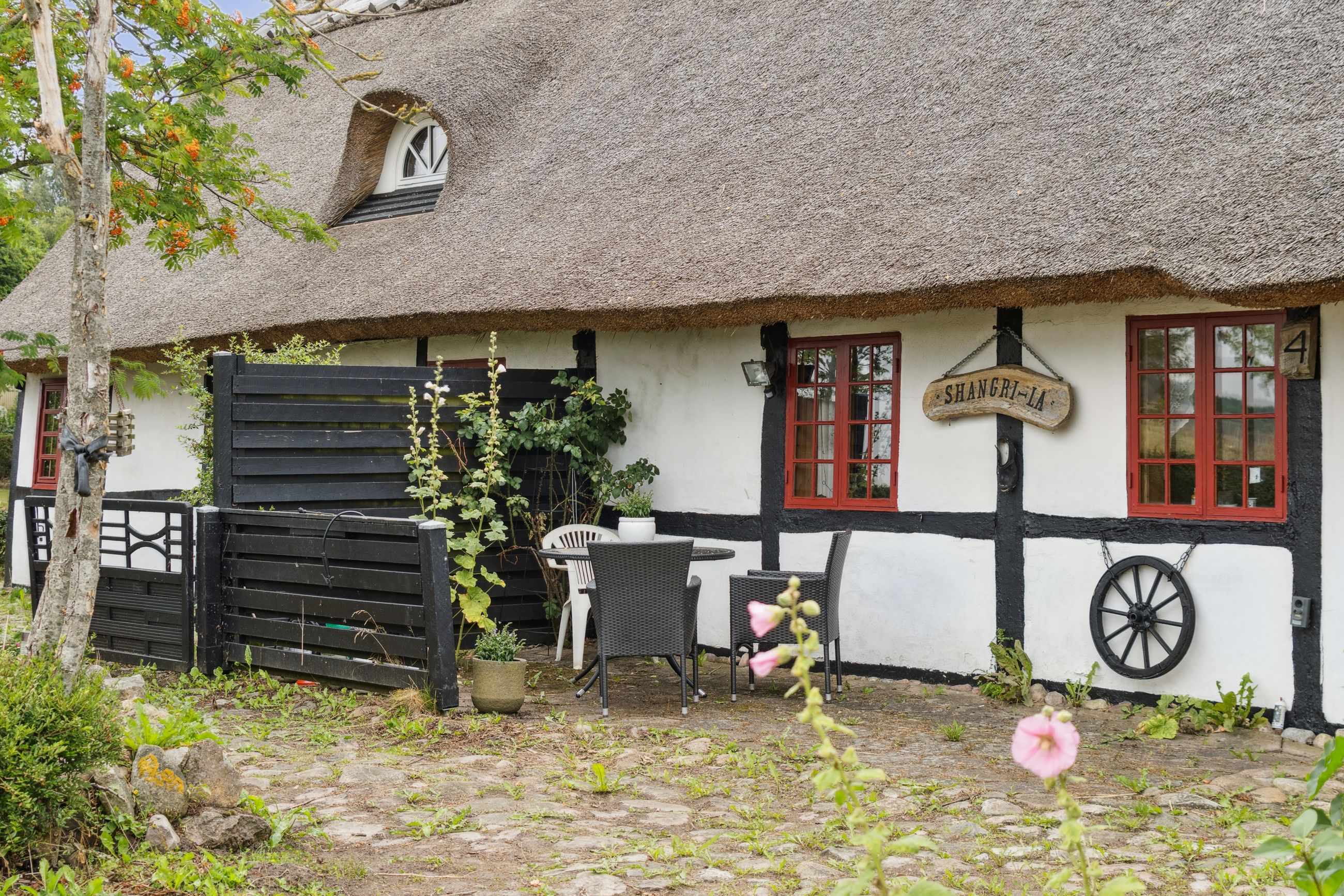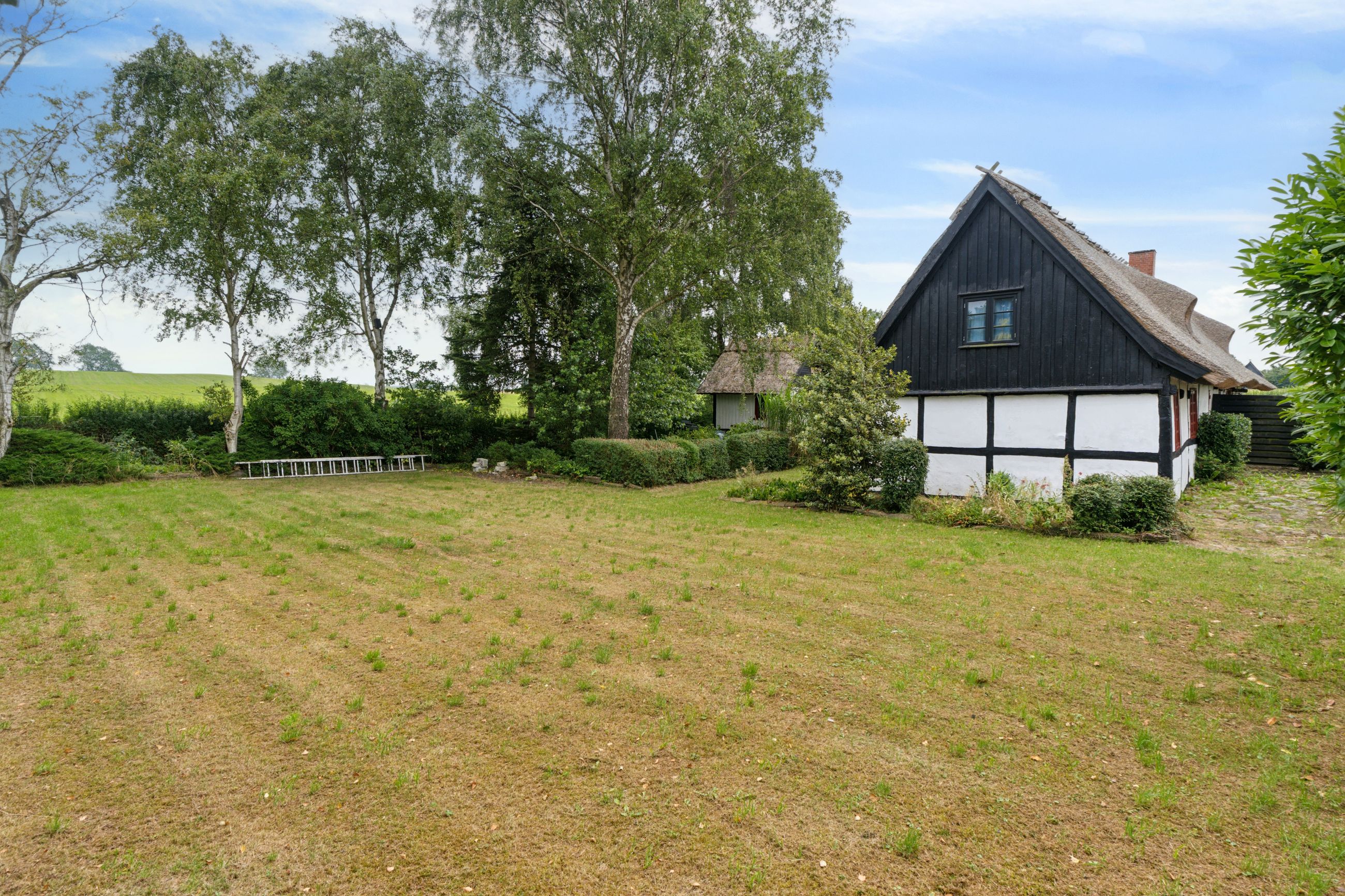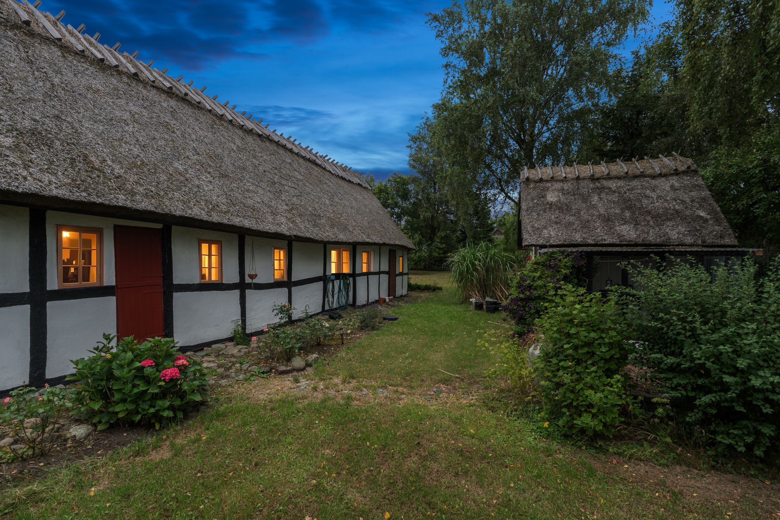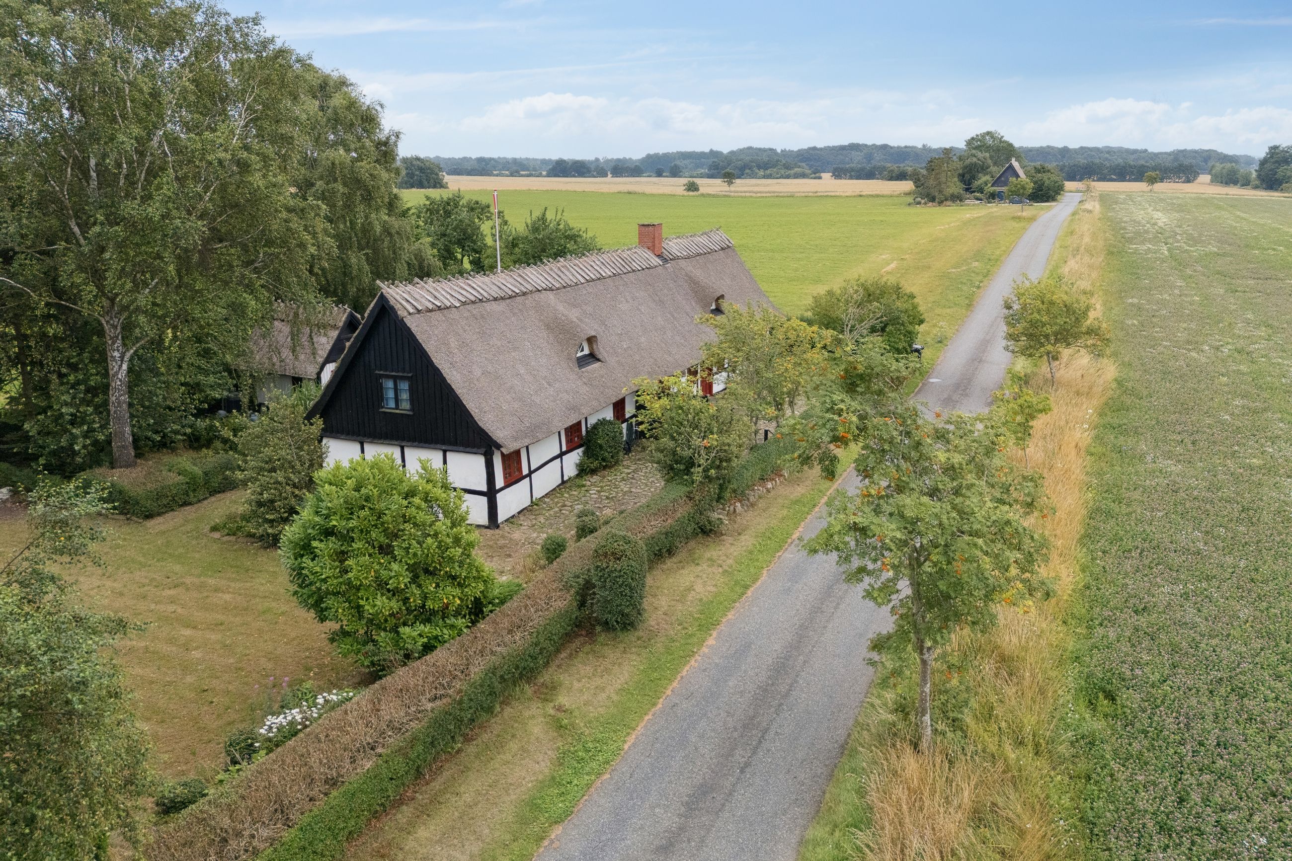 Huset præsenterer sig utroligt charmerende med hvid facade, sort bindingsværk og stråtag. En del af taget er udskiftet i 2023, hvor der ligeledes blev monteret nye kvistvinduer med termoglas. Gavlvinduerne er også forholdsvis nye, og flere af de fine bondehusvinduer har forsatsvinduer. Det skal endvidere nævnes, at boligen fik installeret varmepumpe i 2019, som styres via app.