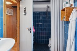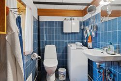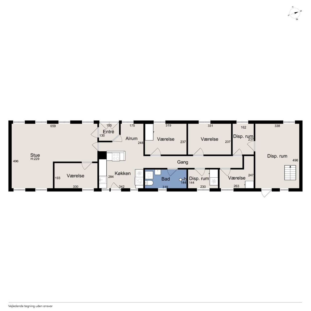 Et af boligens værelser ligger separat, mens de tre resterende værelser er samlet omkring fordelingsgangen. I denne afdeling er der tillige et badeværelse og tre disponible rum.