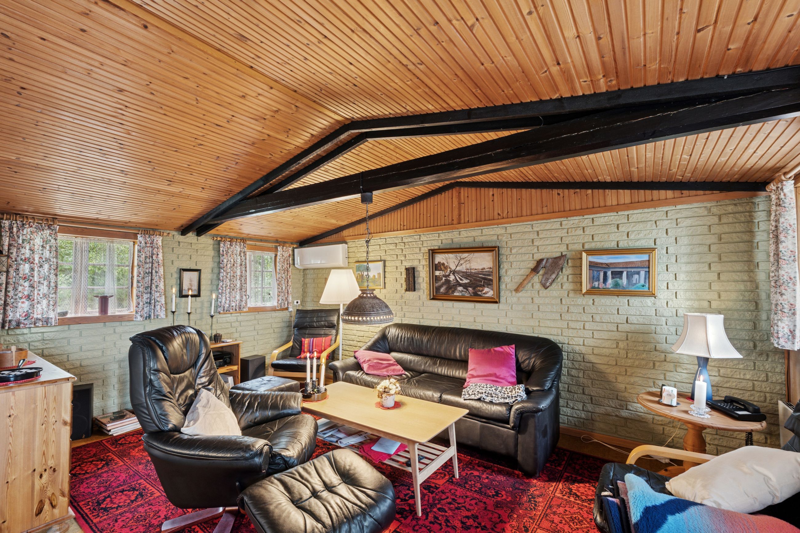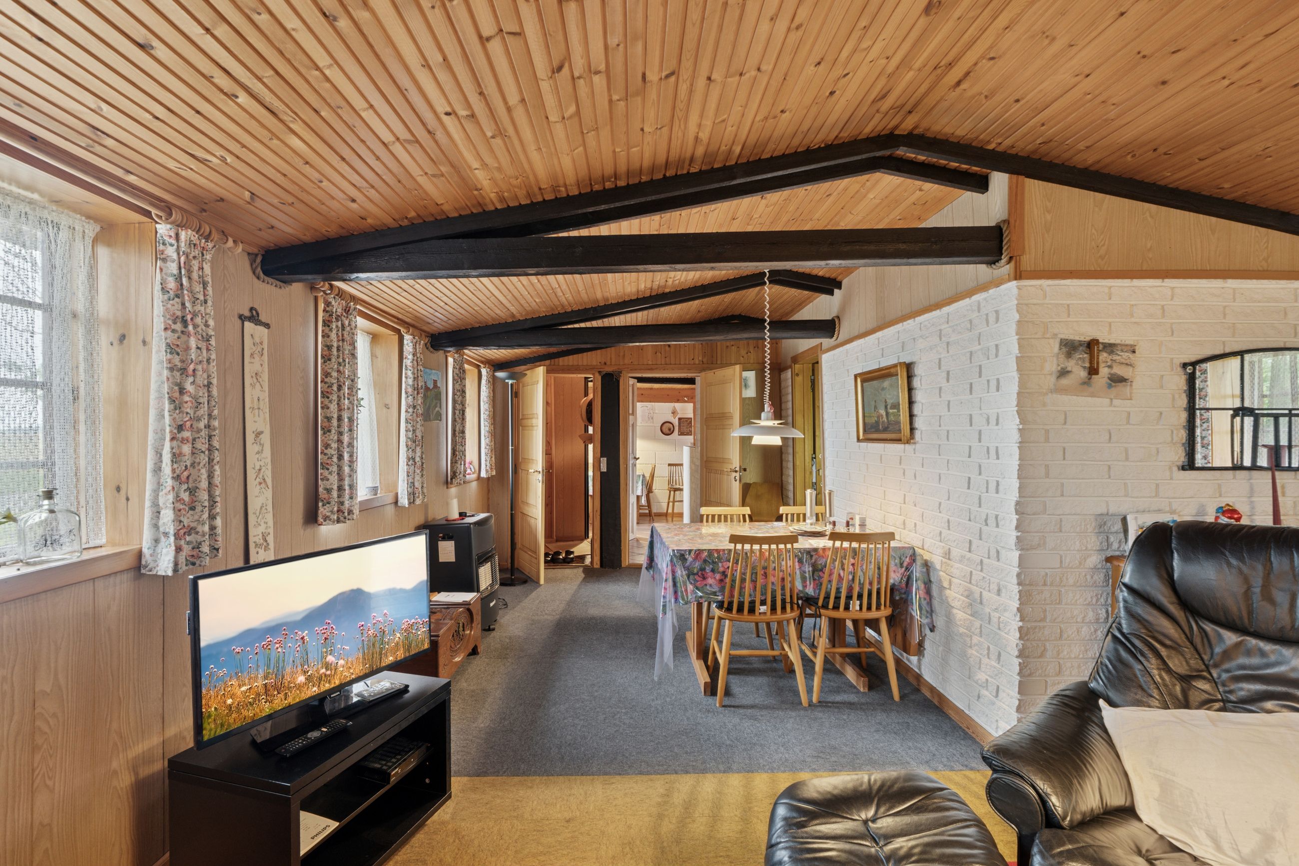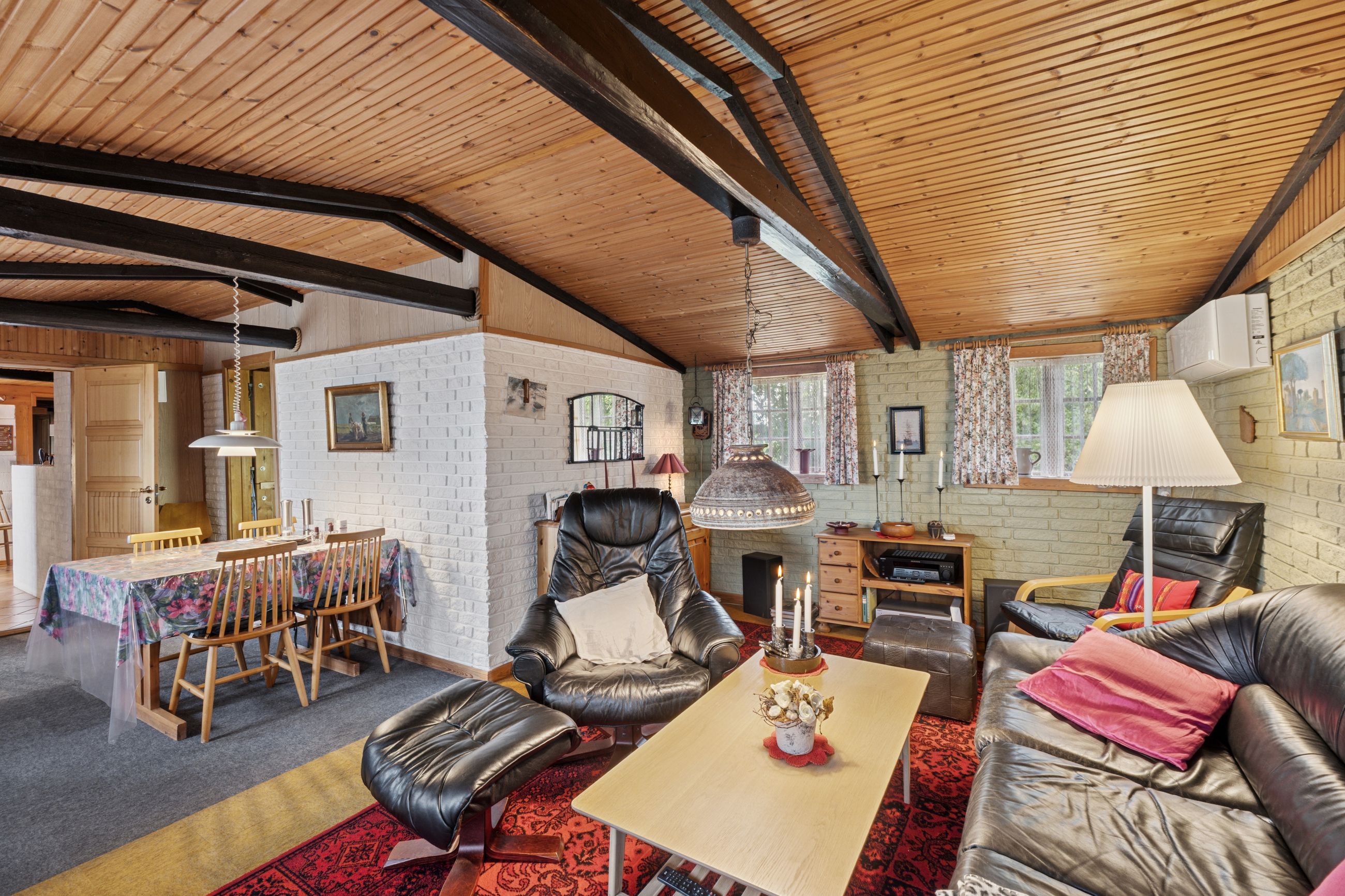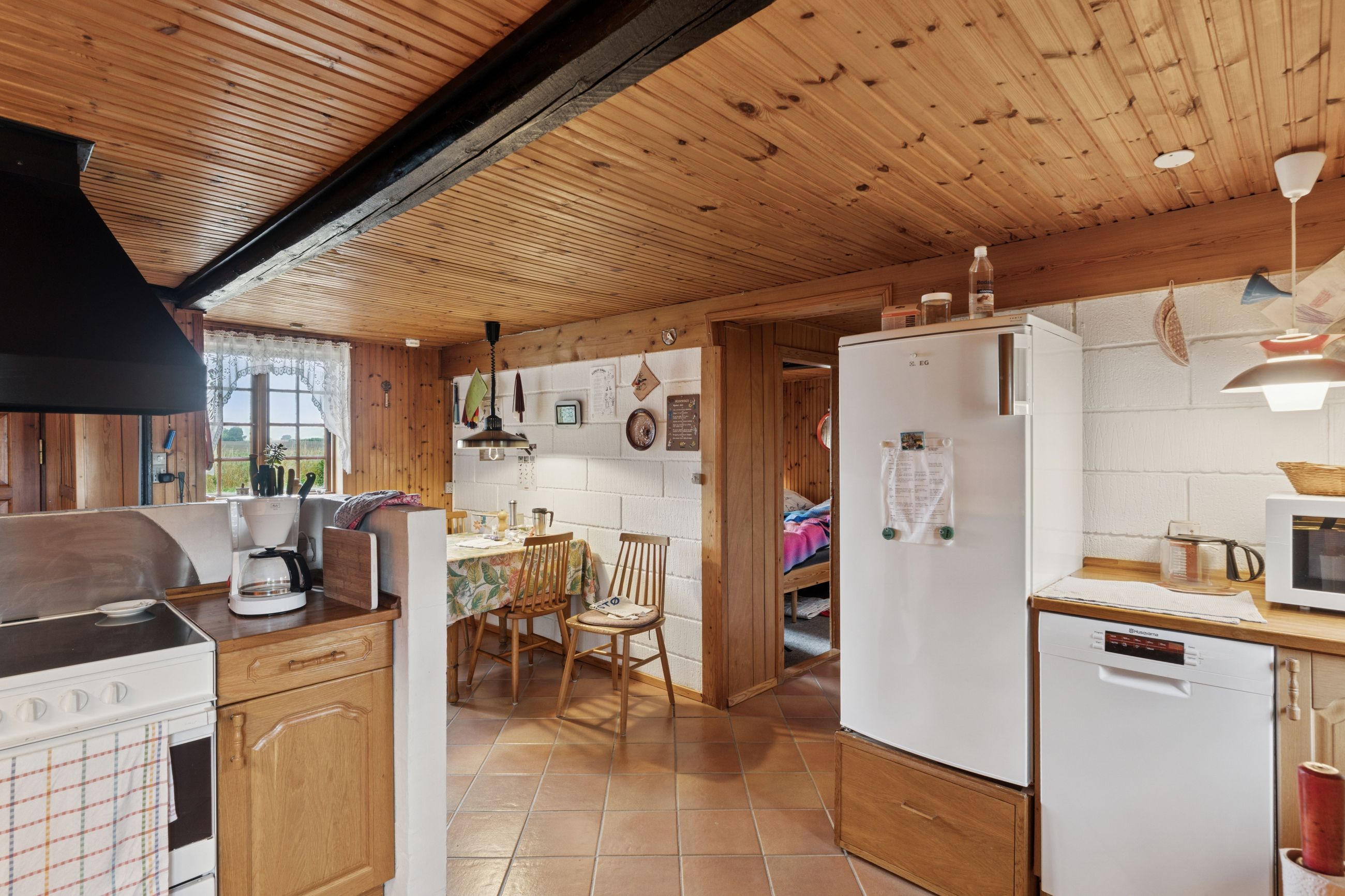 Indenfor er træ det gennemgående materiale, og størstedelen af rummene har synlige bjælkekonstruktioner. I vinkelstuen er loftet ført til kip, og stuen er nem at indrette med spiseafsnit og sofasektion. Det stemningsfulde køkken har flisegulv med gulvvarme, og det er udført med klassiske fyldningselementer og en halv, muret kogeø.