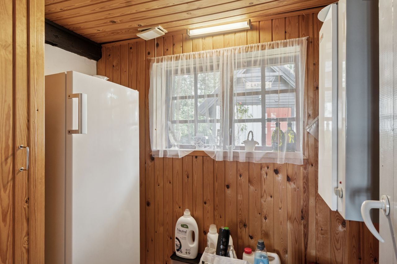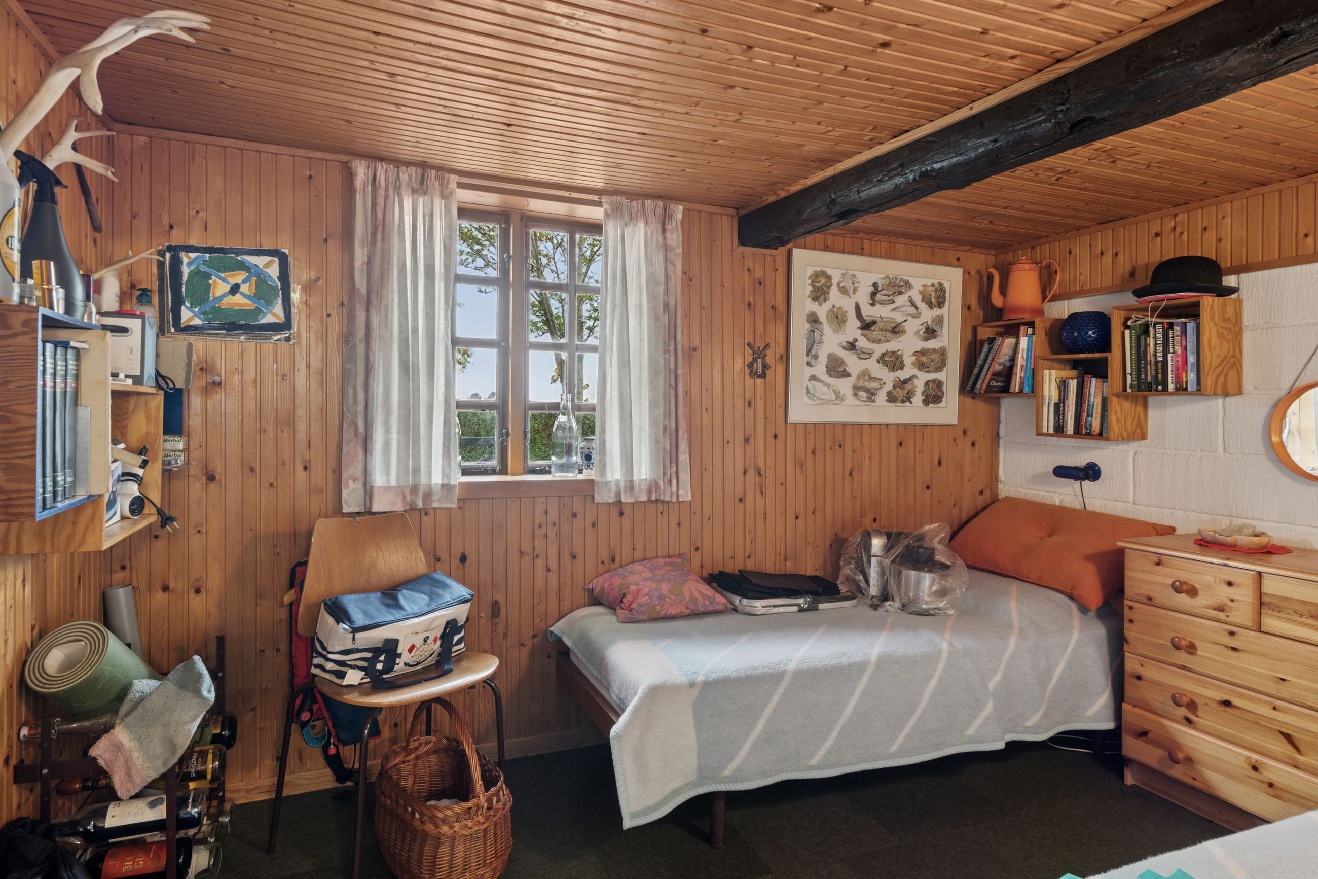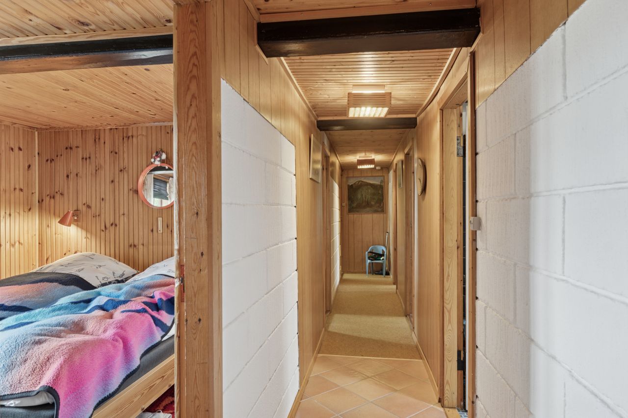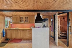 Indenfor er træ det gennemgående materiale, og størstedelen af rummene har synlige bjælkekonstruktioner. I vinkelstuen er loftet ført til kip, og stuen er nem at indrette med spiseafsnit og sofasektion. Det stemningsfulde køkken har flisegulv med gulvvarme, og det er udført med klassiske fyldningselementer og en halv, muret kogeø.