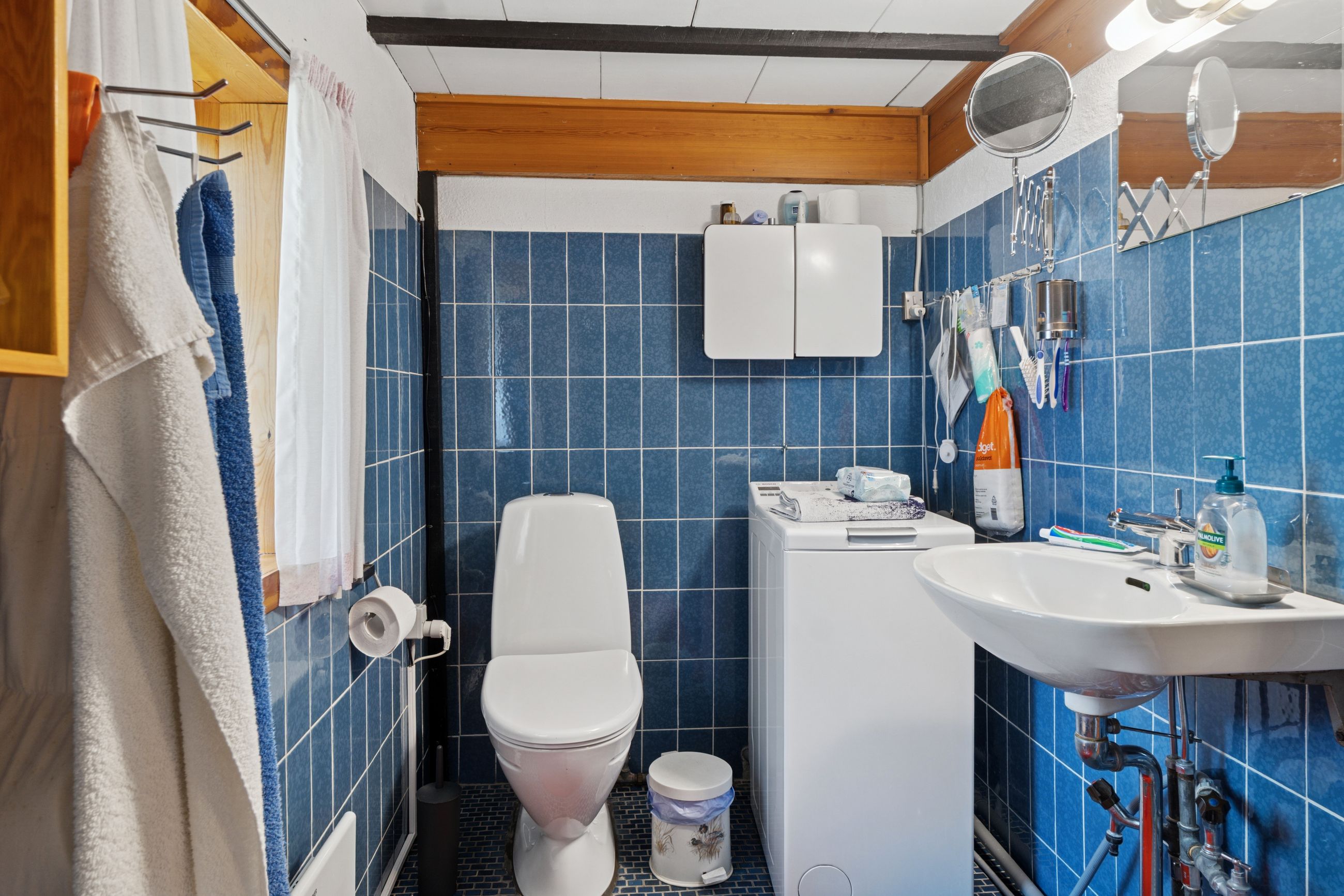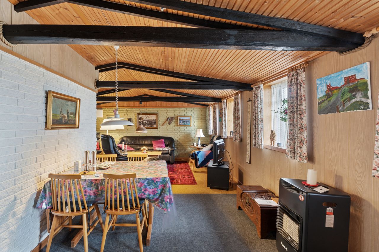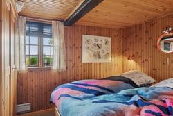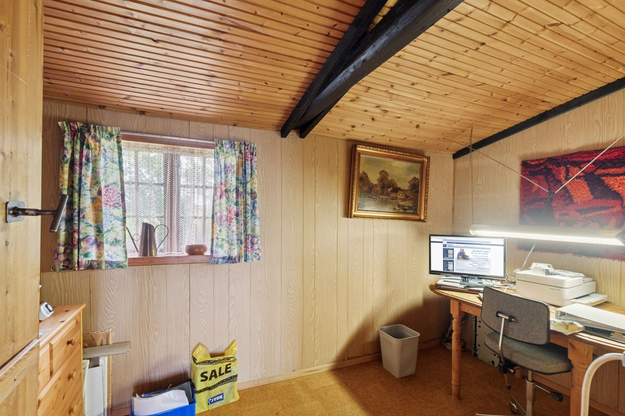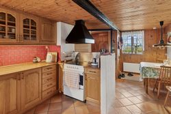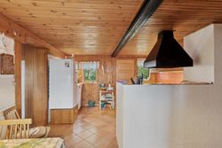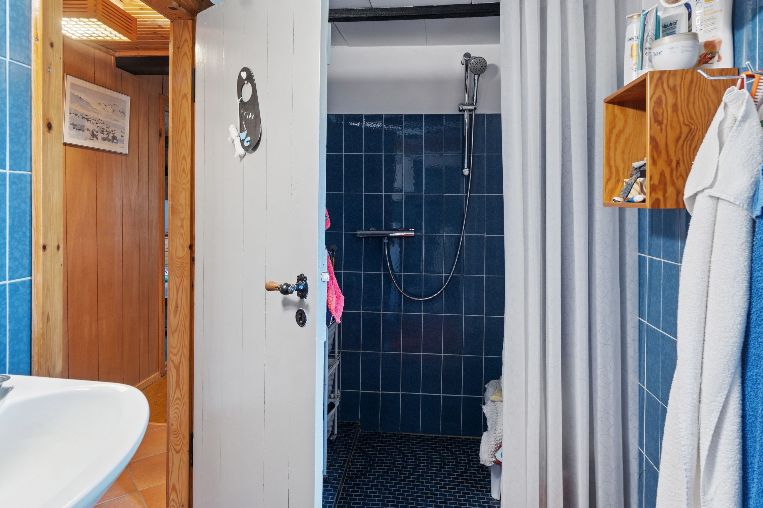 Indenfor er træ det gennemgående materiale, og størstedelen af rummene har synlige bjælkekonstruktioner. I vinkelstuen er loftet ført til kip, og stuen er nem at indrette med spiseafsnit og sofasektion. Det stemningsfulde køkken har flisegulv med gulvvarme, og det er udført med klassiske fyldningselementer og en halv, muret kogeø.