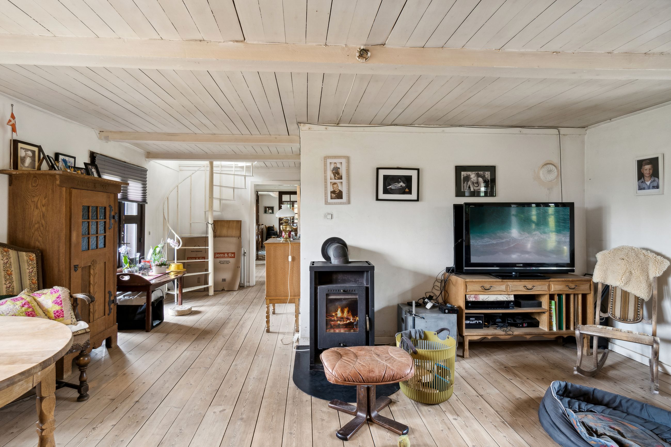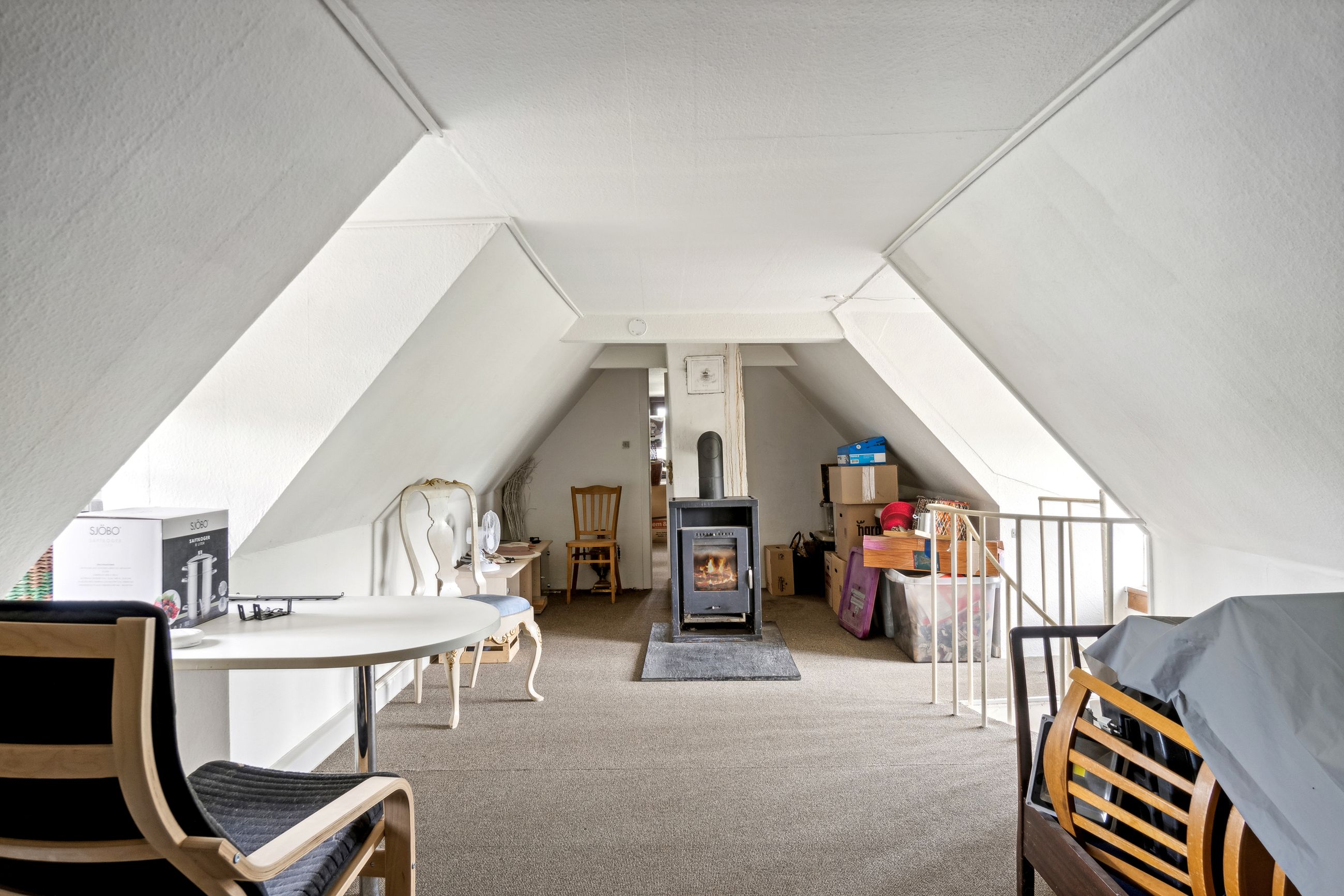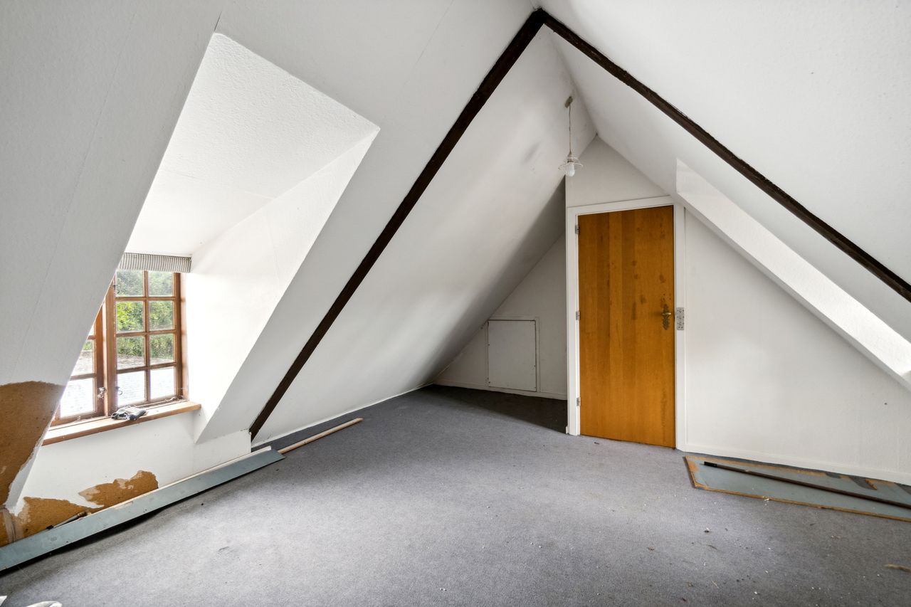 Vindeltrappen leder op til endnu et stuemiljø med brændeovn. Herfra er der indgang til et værelse i