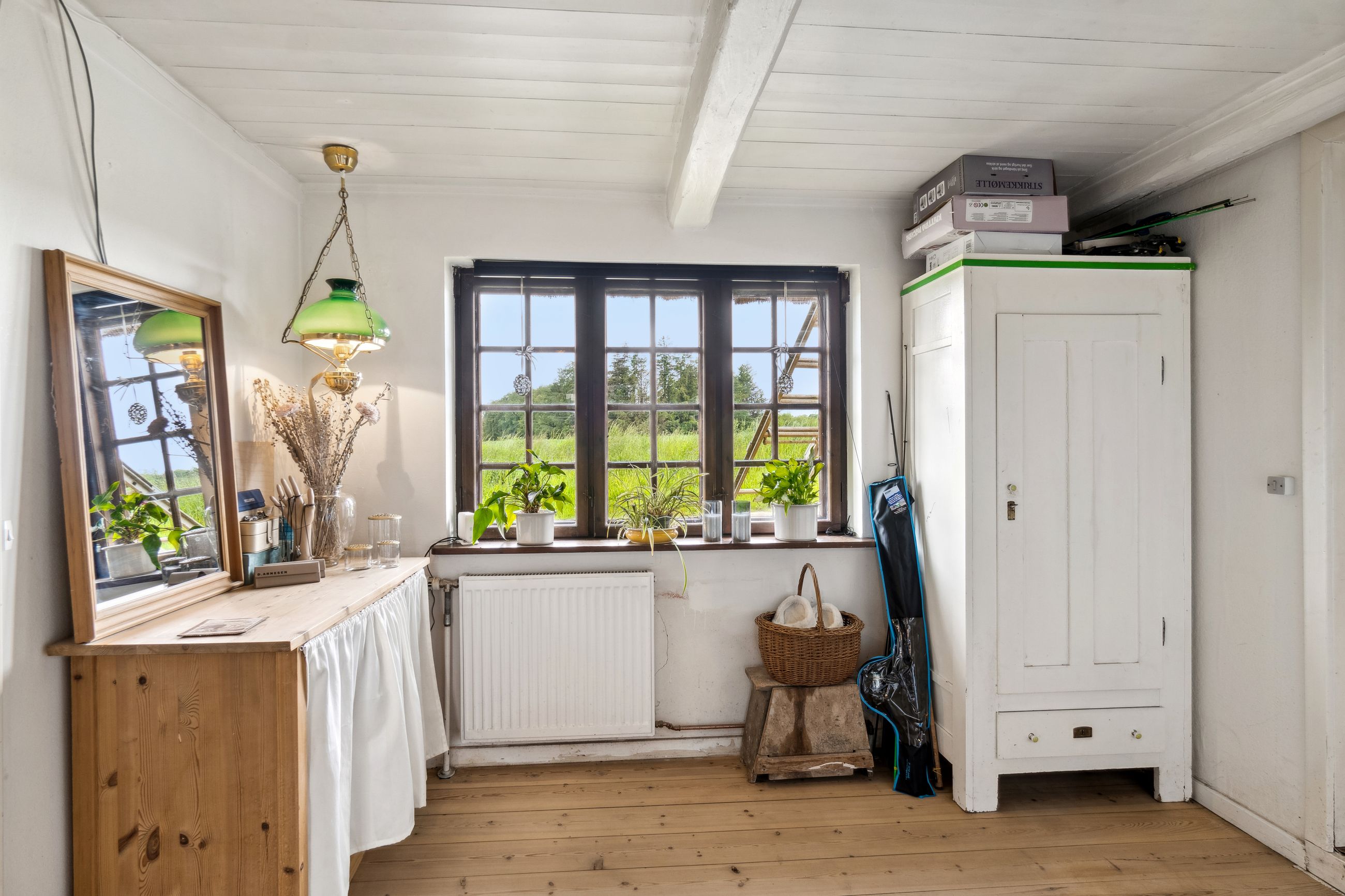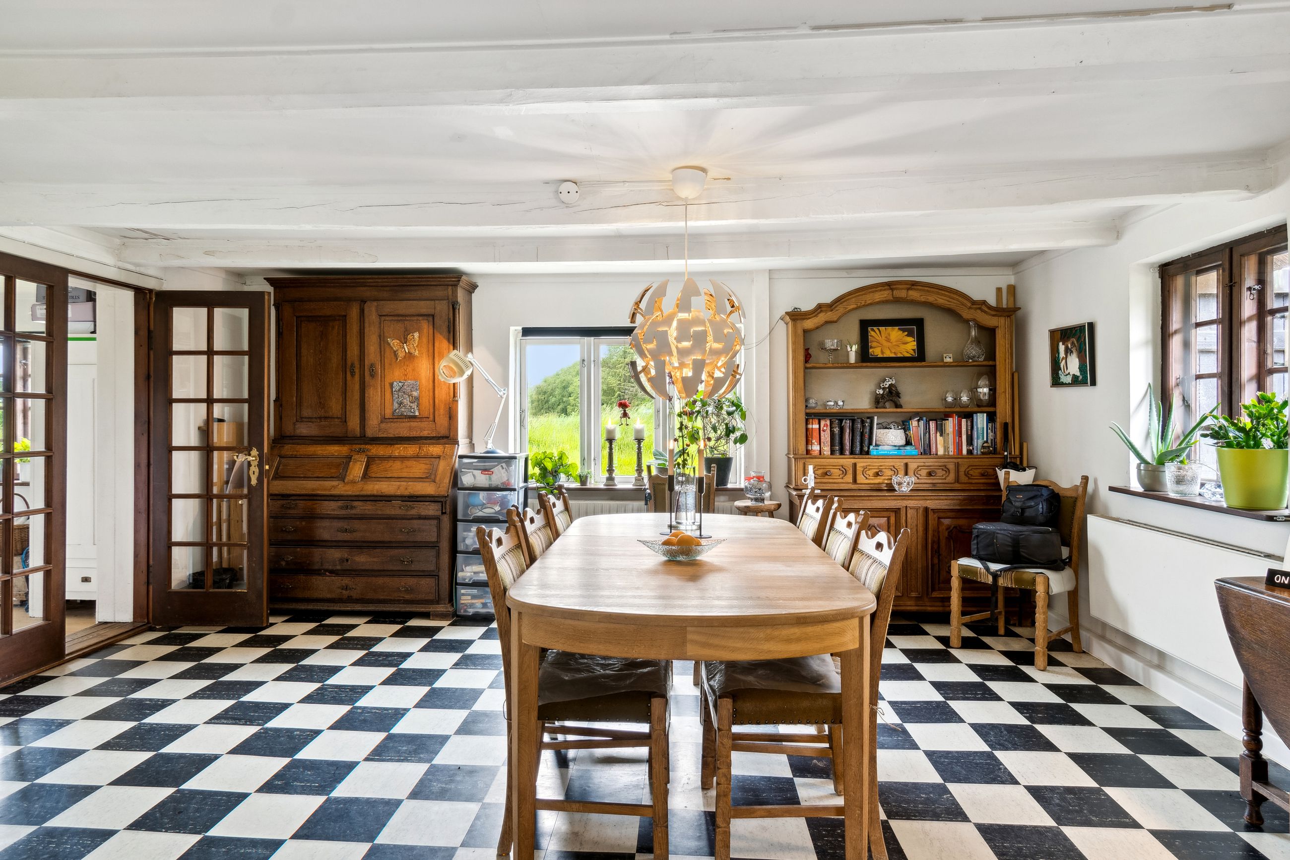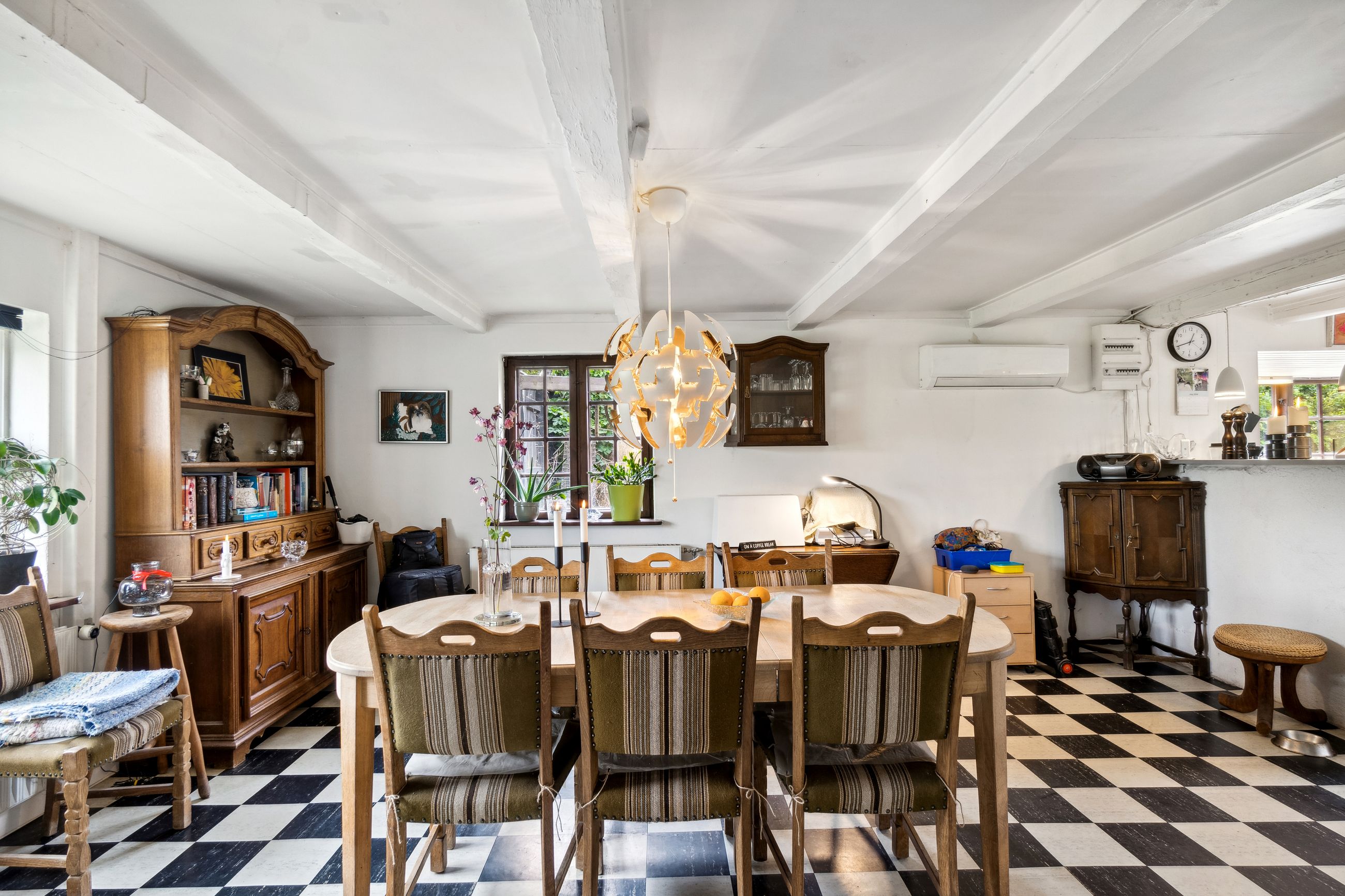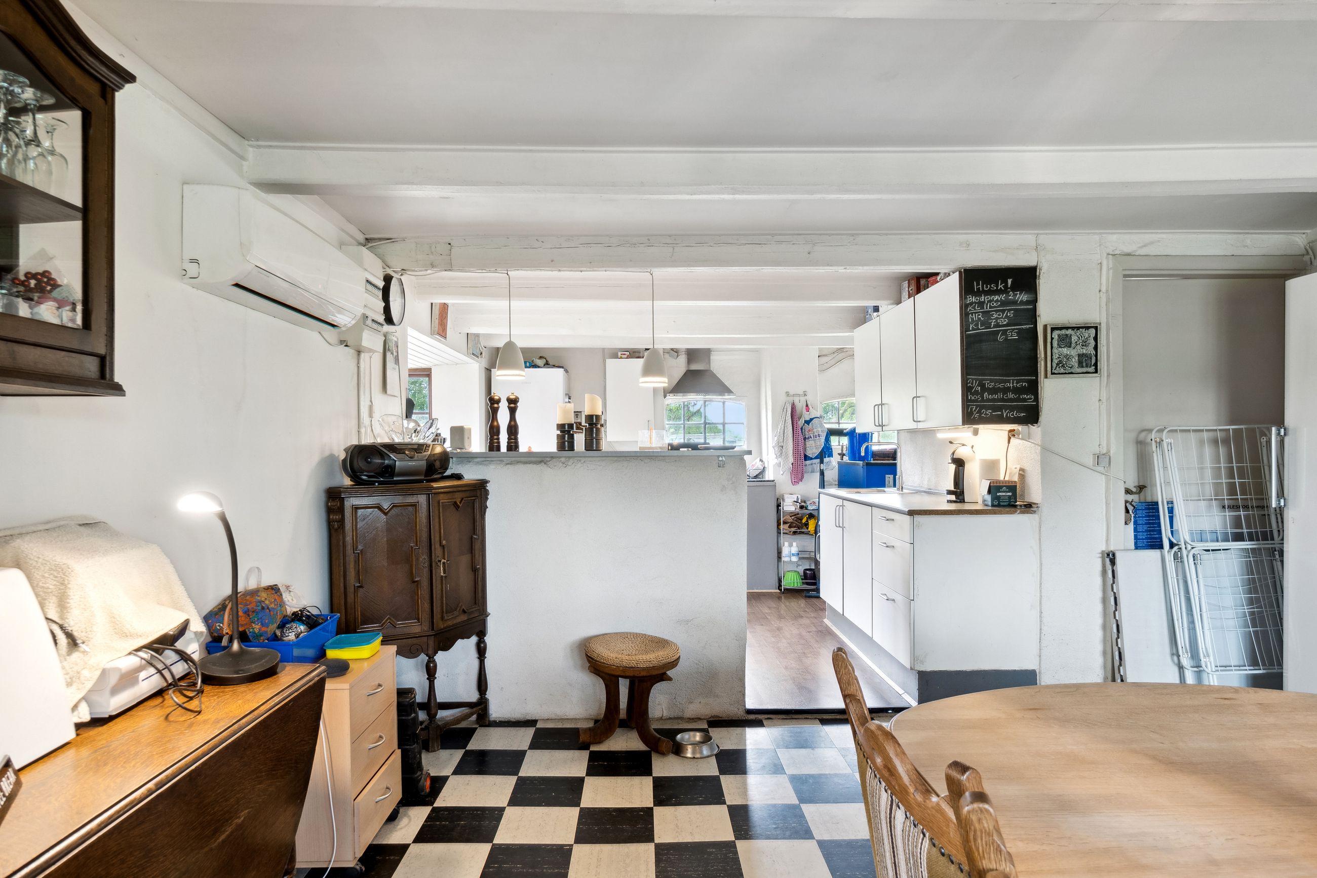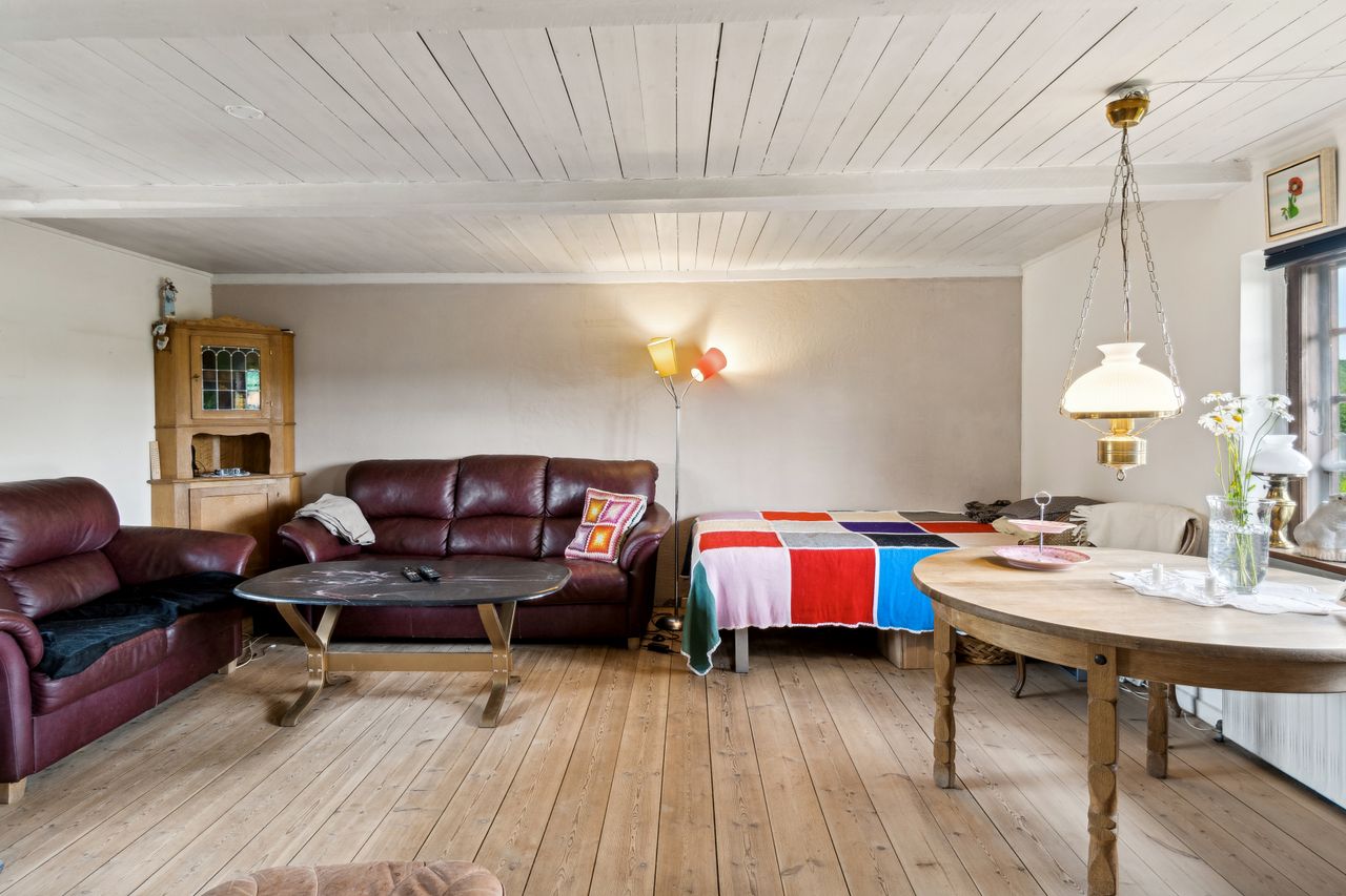 Indenfor byder stuen jer velkommen med fritlagte loftsbjælker, en herlig gennemstrømning af lys fra de